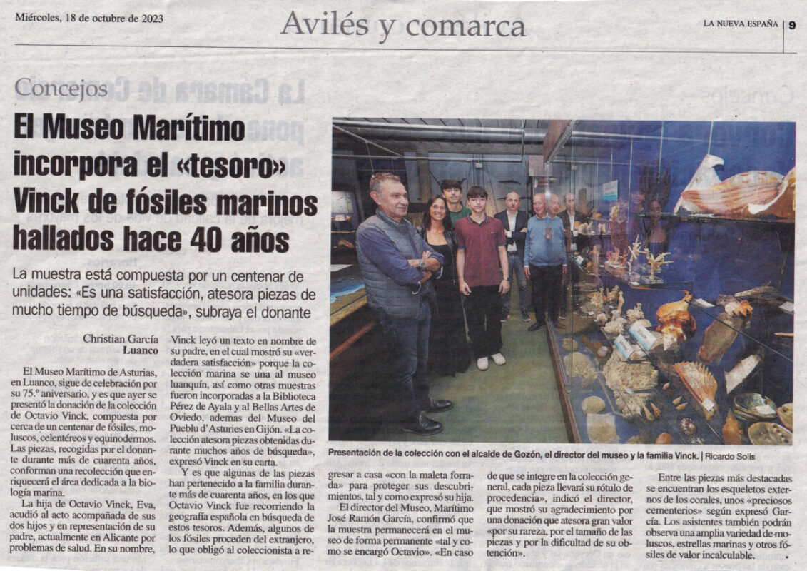 Nov192023Fondo Vinck LA FAMILIA VINCK HA REALIZADO UNA DONACION AL MUSEO MARITIMO DE ASTURIAS COLECCION COMPUESTA POR MAS DE 100 PIEZAS DE FOSILES Y OBJETOS MARINOS LA VITRINA EXPOSITORA HA SIDO INAUGURADA EL DÍA 18-0CTUBRE-2023 Categoría: Fondo VinckPor Octavio Vinck Autor: Octavio Vinck Navegación entre publicacionesAnteriorPublicación anterior:FOTOGRAFIAS CON HISTORIASiguientePublicación siguiente:ENTREVISTA A OCTAVIO VINCK DIAZRelated PostsNUEVAS IMAGENES PUBLICADASPRORROGA DE LA EXPOSICION LOS VINCK Y NUEVAS DONACIONES. CIERRE DEFINITIVO 12-1-2025EXPOSICION LOS VINCKDONACION DEL FONDO VINCK AL MUSEO DEL PUEBLO DE ASTURIASFOTOGRAFIAS CON HISTORIAPRIMER ANIVERSARIO