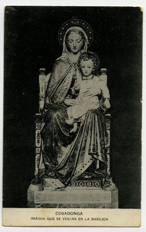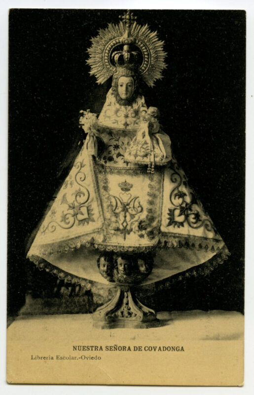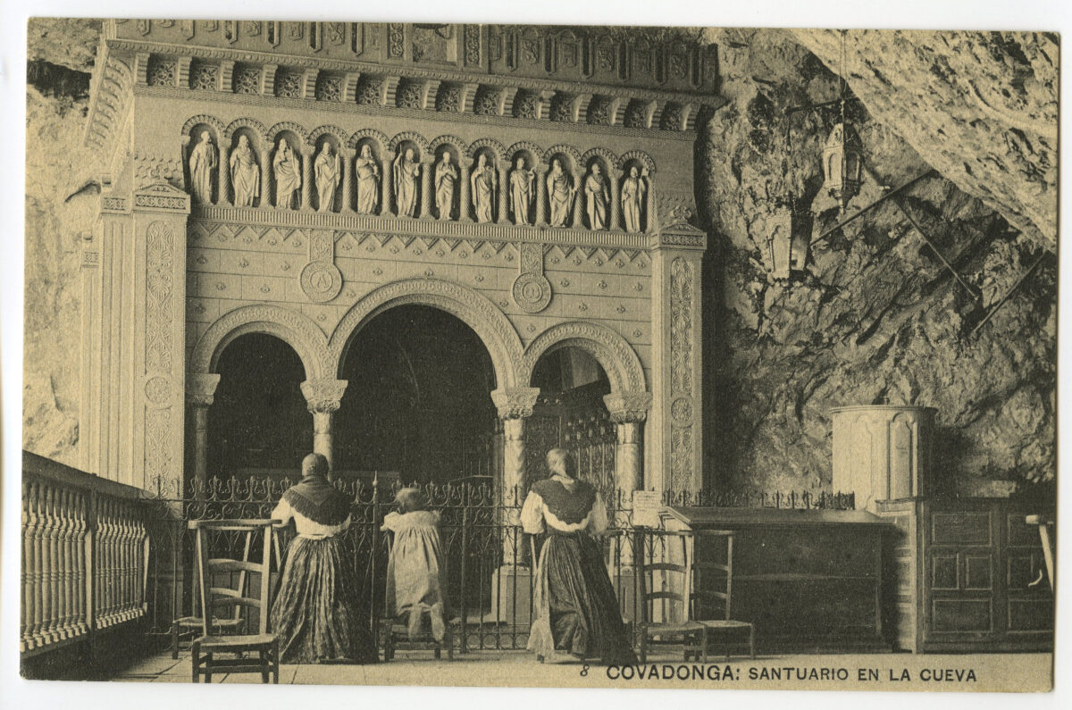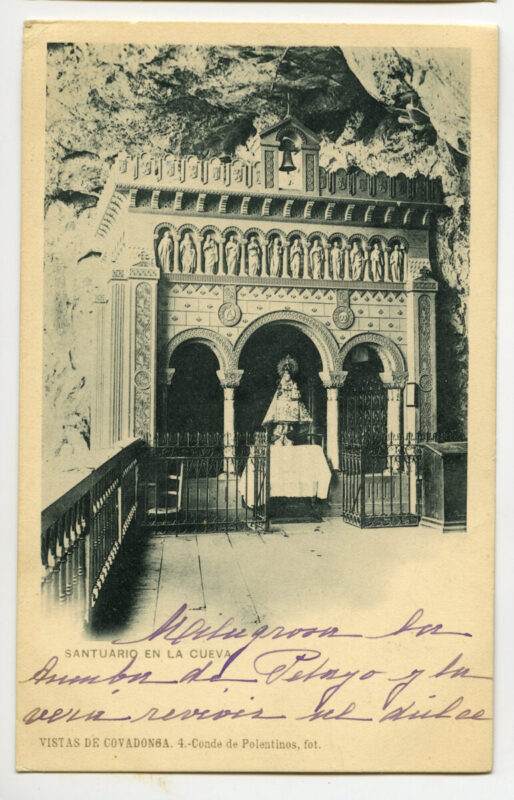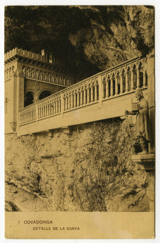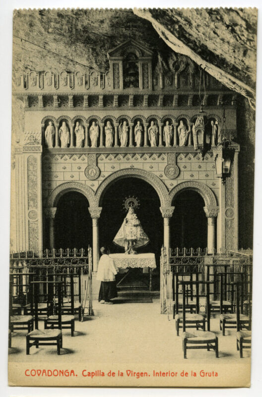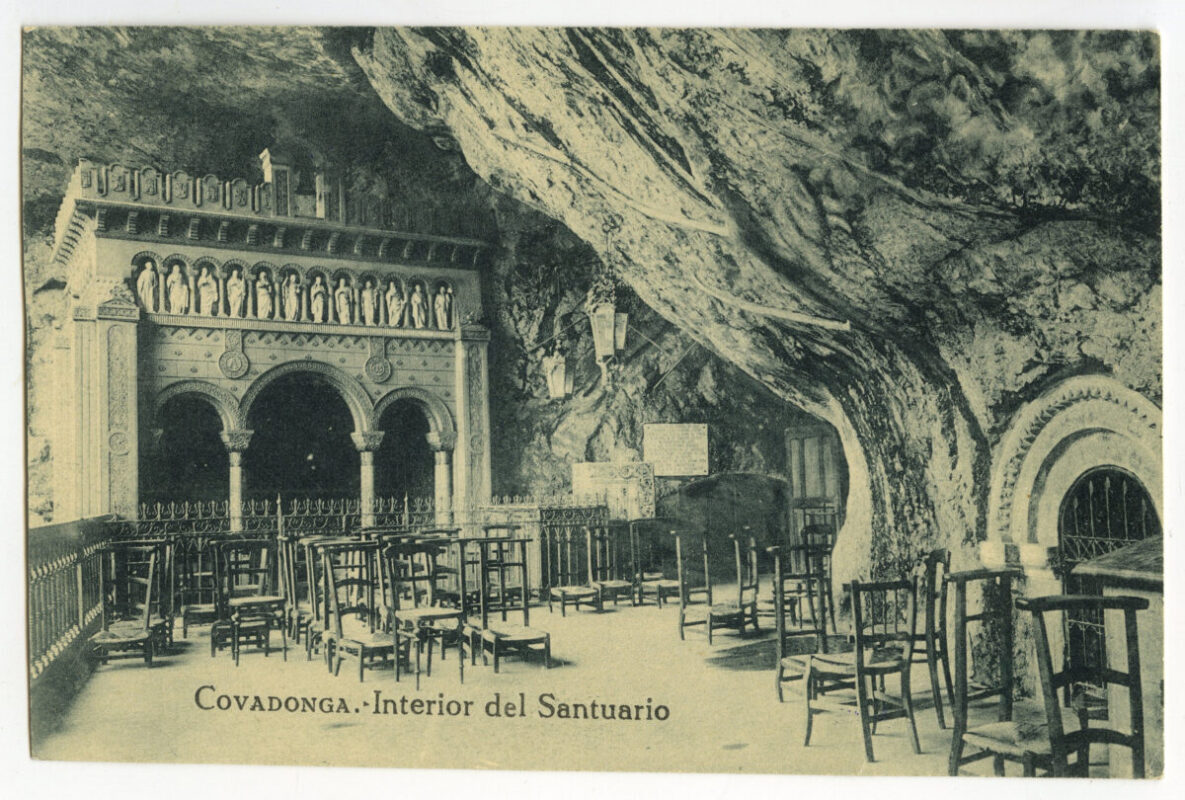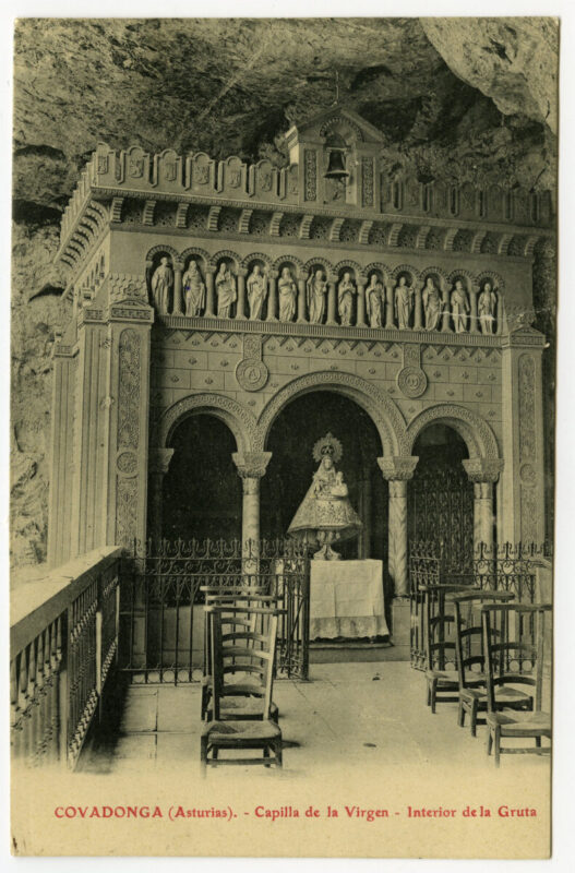 - La imagen del santuario de Covadonga es, sin duda, la más conocida y difundida desde antiguo del Principado de Asturias. Desde el siglo XVI han circulado estampas devotas que reproducían a la Virgen y su iglesia, de estructura de madera, colgada en el aire a la altura de la Cueva y rodeada por la cascada del río Deva. El incendio ocasionado en la madruga da del 17 de octubre de 1777 consumió por entero la iglesia y la primitiva imagen románica de la Virgen. Dada la relevancia histórica y la significación política y religiosa del santuario, Carlos III comisionó al gran arquitecto Ventura Rodríguez para que diseñara las trazas de un nuevo templo acorde con la importancia y grandiosidad del lugar. Las obras su frieron diversos avatares hasta su definitiva sus pensión en 1792, con el resultado único de la canalización de las aguas que brotaban de la roca junto a la Cueva y un gran basamento a los pies de la misma .