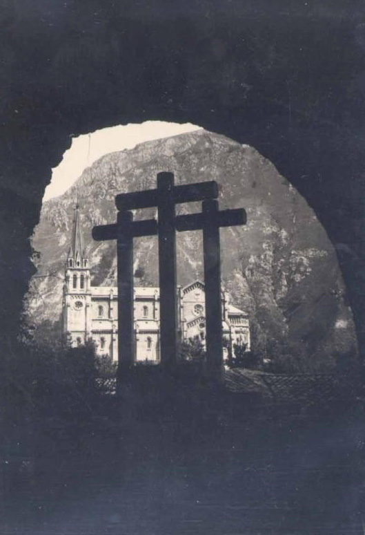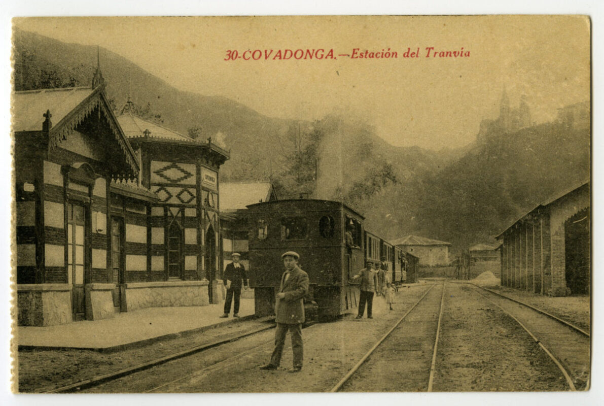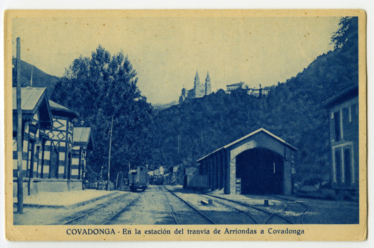 - .Resulta, sin embargo, sorprendente compro bar los cambios experimentados en el conjunto constructivo de Covadonga a lo largo de este siglo, a pesar de haber adquirido con la terminación de la Basílica en 1901 una disposición muy similar a la actualmente conocida. Los daños sufridos por el Camarín durante la Guerra Civil dieron pie para su sustitución y proceder a una nueva reordenación de la gruta. Quizás entonces se retiraron, sino habían desaparecido antes, las dos estatuas de Pelayo y Alfonso 1 que se encontraban a ambos lados de la escalera de acceso a la Cueva, en su tramo final. La rehabilitación de la colegiata de San Fernando, las nuevas construcciones en el paseo de los Canónigos y otras obras de reforma y restauración emprendidas para adecuar el lugar a las demandas de un turismo que ha ido en aumento con el paso del tiempo, terminaron de dar el aspecto actual al santuario. Su imagen anterior se recupera ahora en esta selección de postales. Covadonga ha sido uno de los lugares de Asturias más reproducido en la tarjeta postal, formando parte prácticamente de todas las gran des series editadas por las más importantes em presas postales. Las aquí reproducidos son tan sólo una muestra entre cientos de tarjetas impresas ya desde los primeros tiempos de la pos tal. Completan la visión la estación del tranvía de vapor que, desde 1908 a 1936, enlazaba Arriondas con Covadonga; La Riera, la carretera a los lagos, el de Enol y algunas vistas de las montañas circundantes.