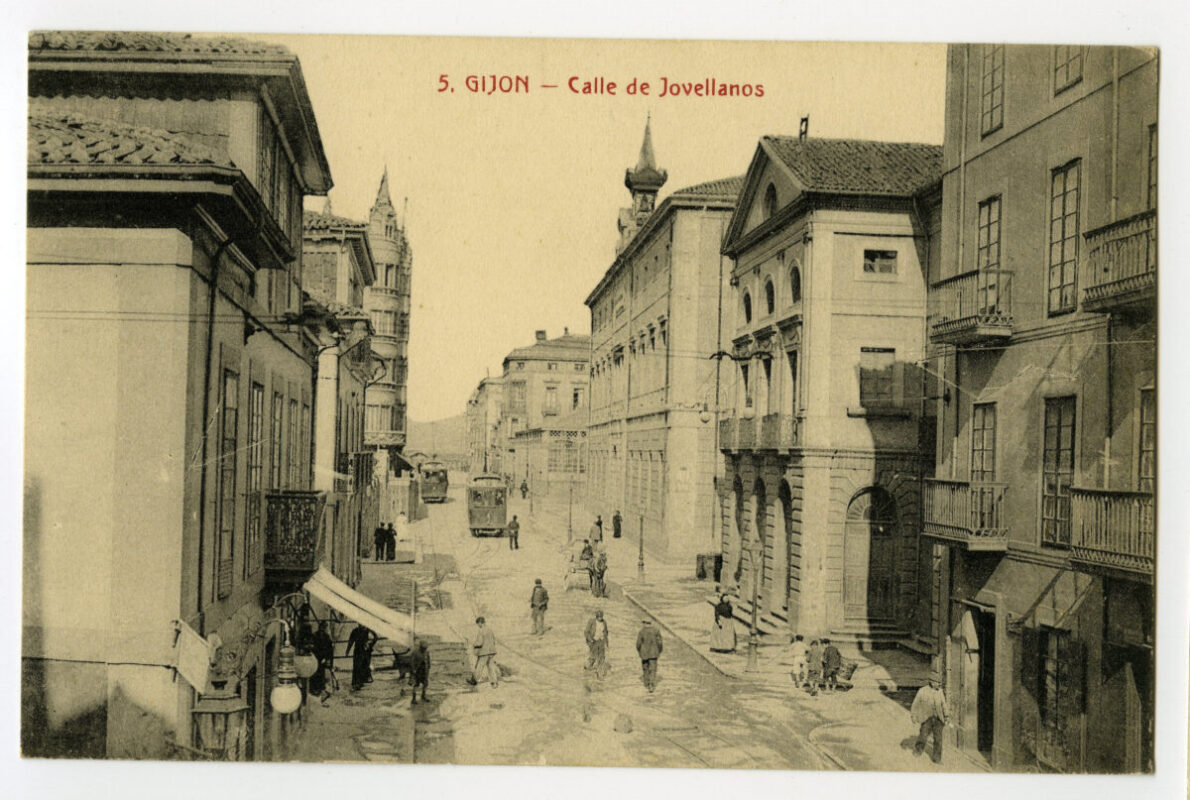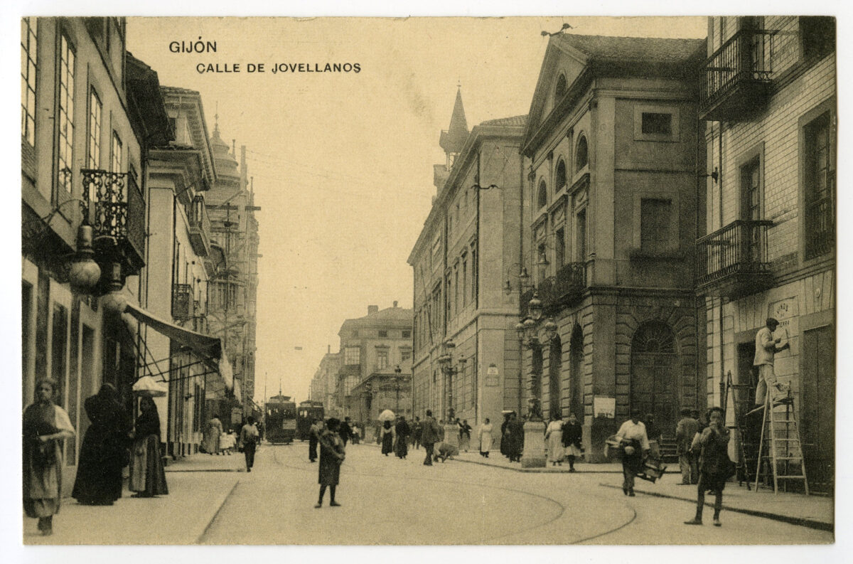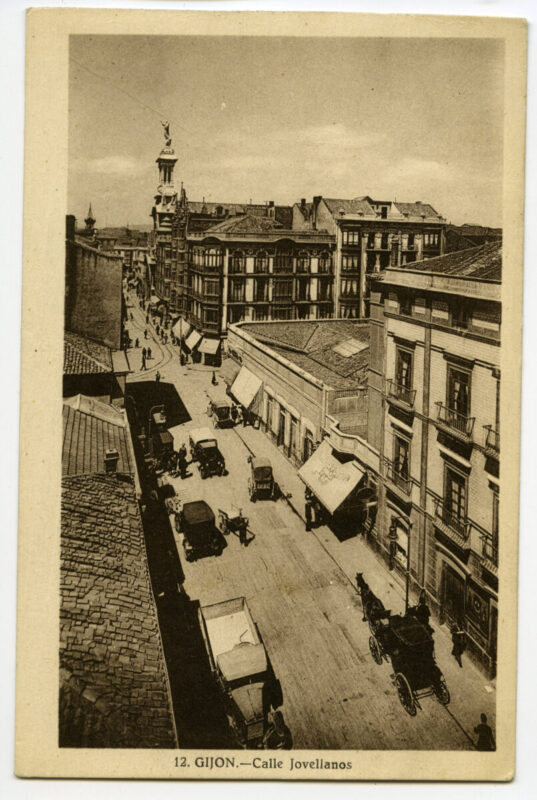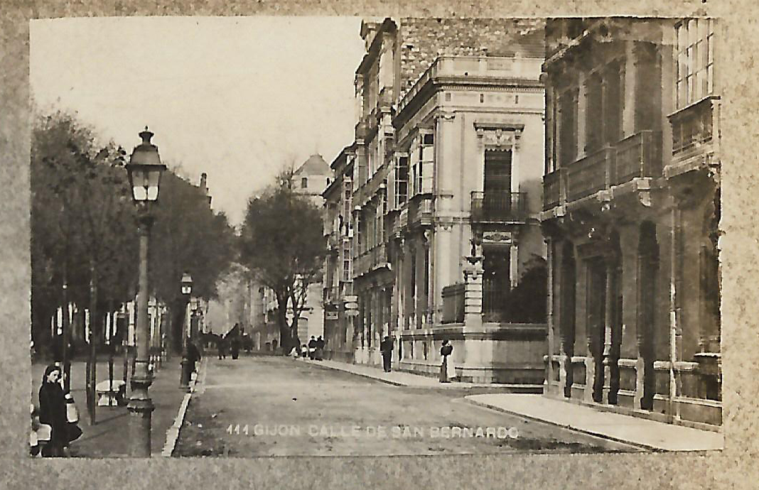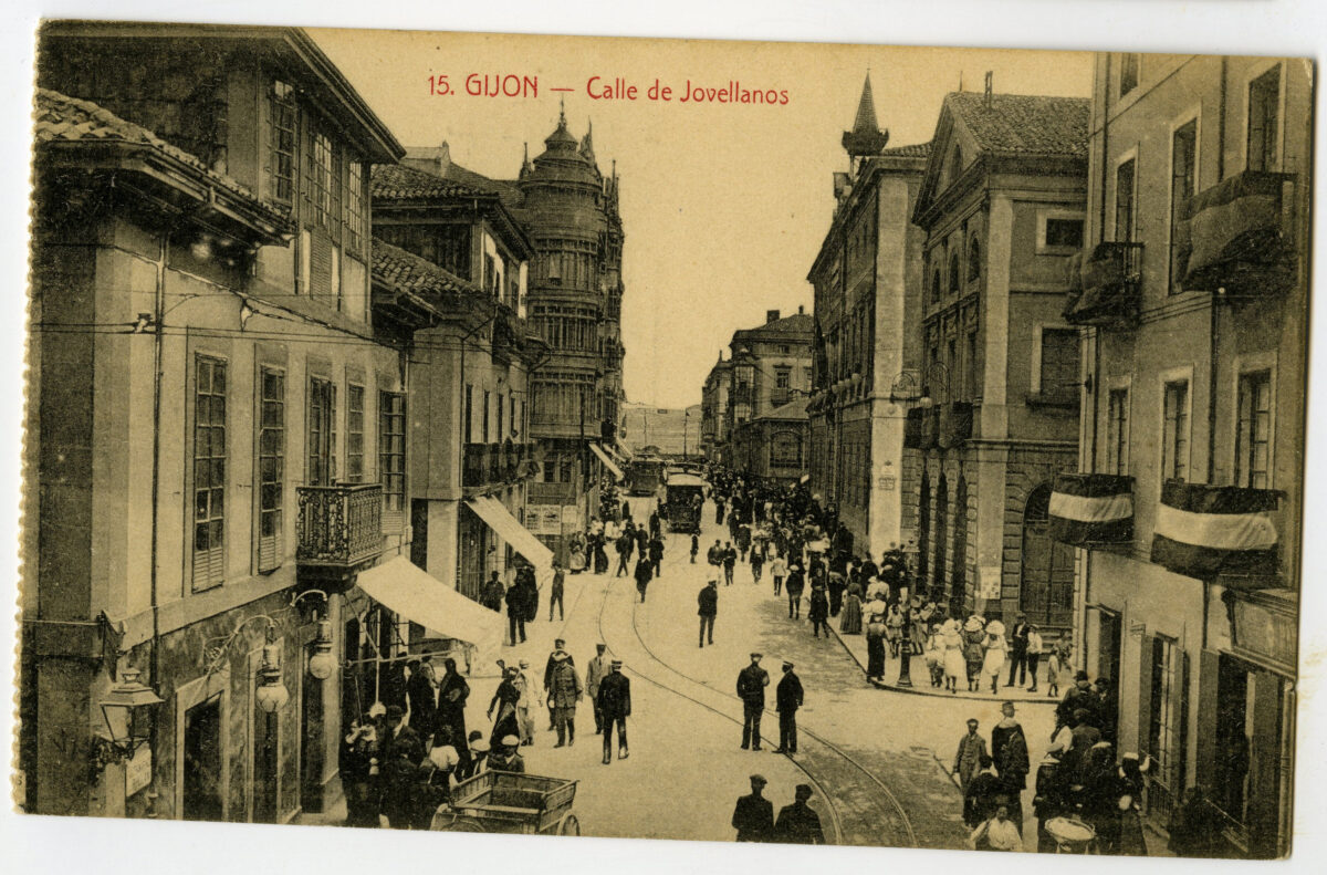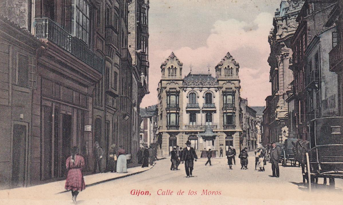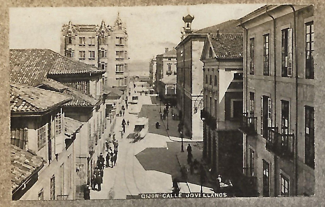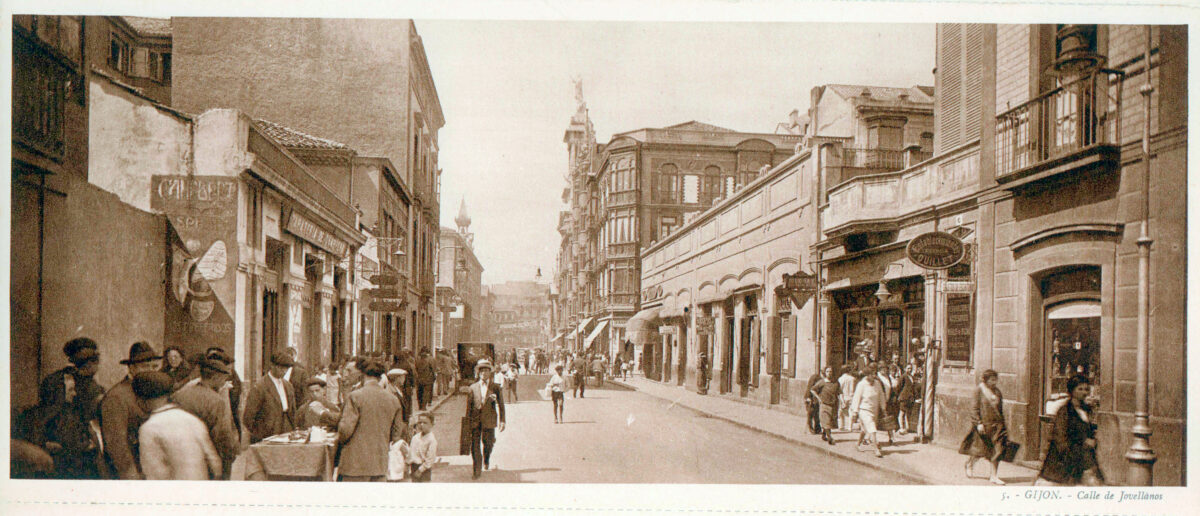 En los años que siguen, se procede a un remozamiento del caserío y al macizamiento de ese núcleo central que se había convertido en el corazón de la ciudad, y que coincidía con la zona delimitada por el «Plan de Mejoras» propuesto por Jove llanos. En él se asienta la pujante burguesía y se radican los establecimientos que responden a las demandas crecientes del sector terciario. Bancos, hoteles, comercios, teatros, mercados, edificios de viviendas, etc., de nueva construcción, suplantan a viejas construcciones o llenan solares vacíos, dando nuevo aire de ciudad burguesa a un peque ño número de calles -Corrida, Moros, San Bernardo, Jovellanos, etc.-, que serán el tema recurrente de la mayoría de las postales que por entonces se editan.