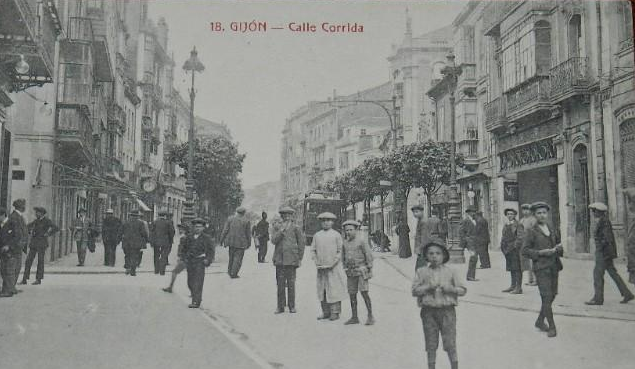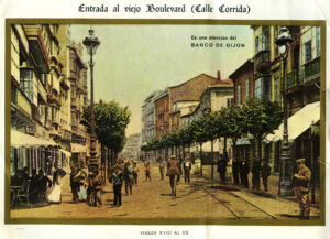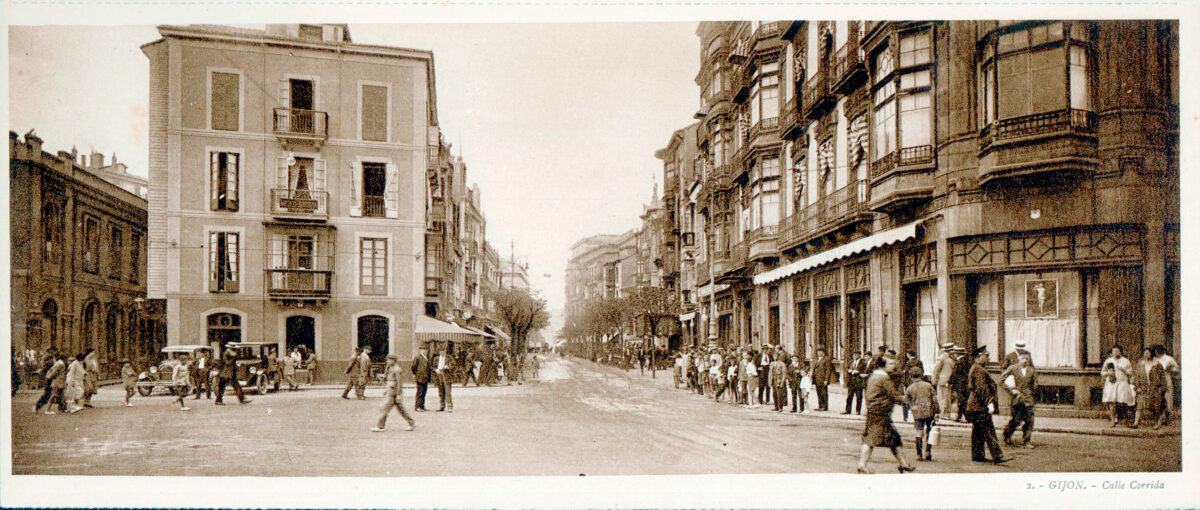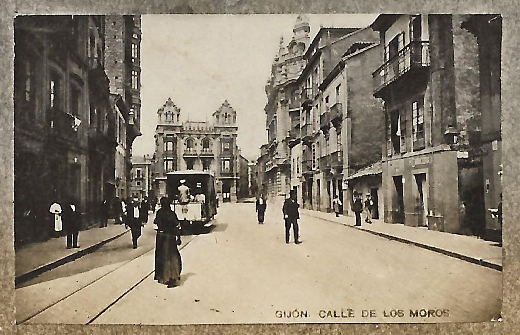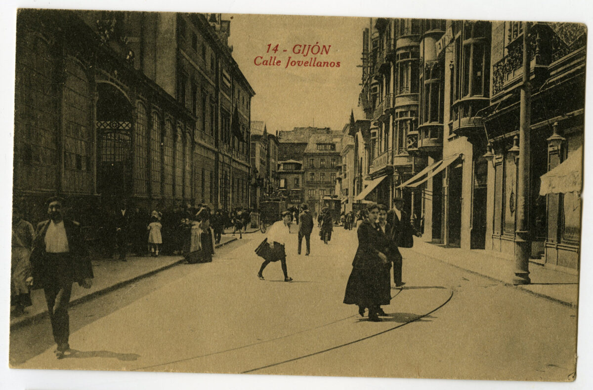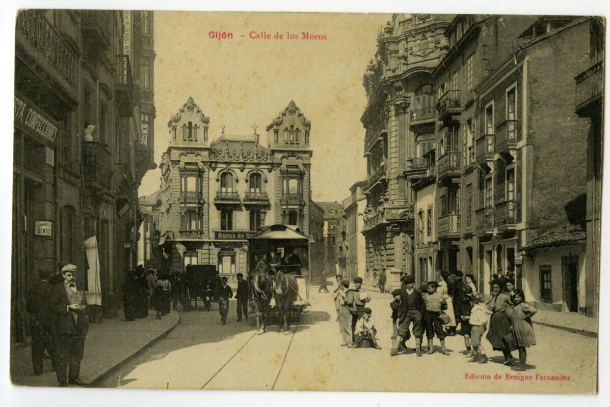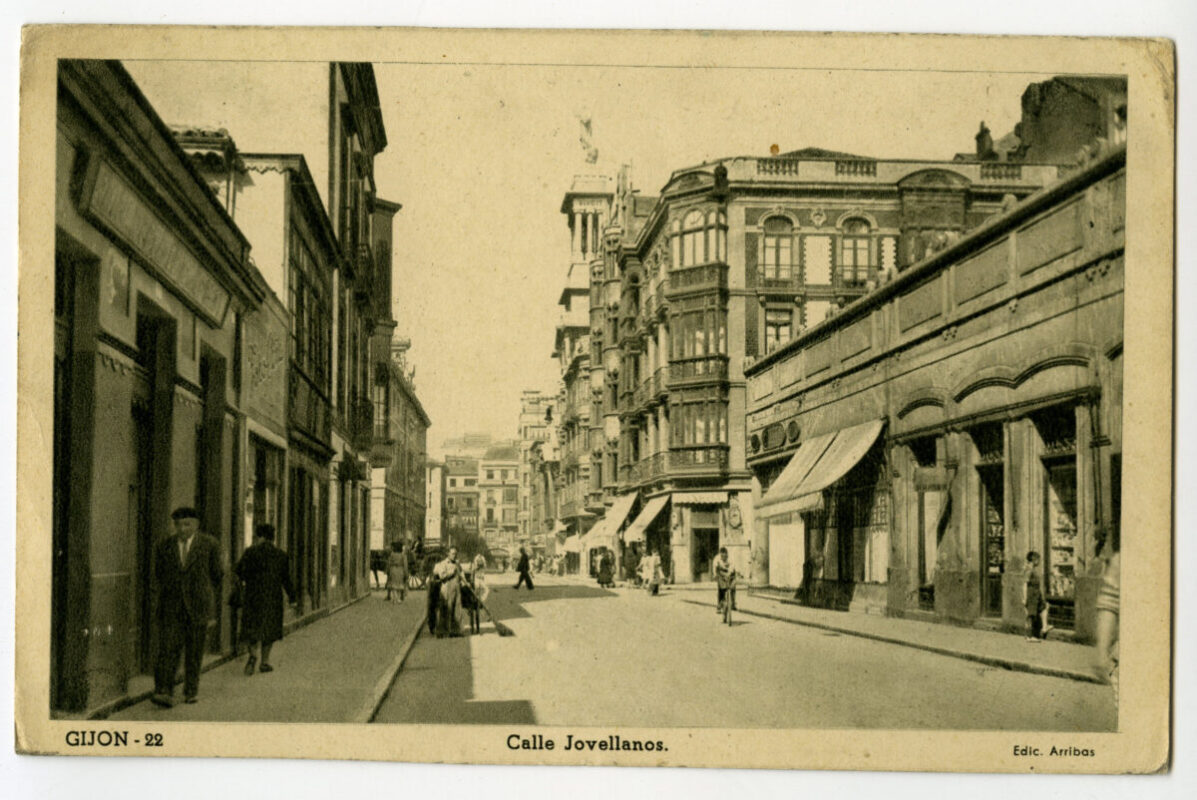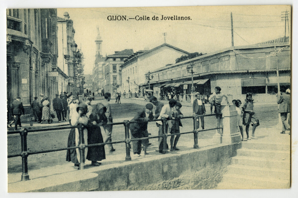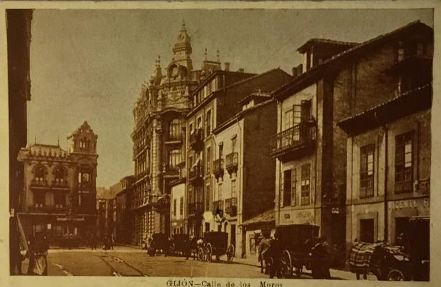 En los años que siguen, se procede a un remozamiento del caserío y al macizamiento de ese núcleo central que se había convertido en el corazón de la ciudad, y que coincidía con la zona delimitada por el «Plan de Mejoras» propuesto por Jove llanos. En él se asienta la pujante burguesía y se radican los establecimientos que responden a las demandas crecientes del sector terciario. Bancos, hoteles, comercios, teatros, mercados, edificios de viviendas, etc., de nueva construcción, suplantan a viejas construcciones o llenan solares vacíos, dando nuevo aire de ciudad burguesa a un peque ño número de calles -Corrida, Moros, San Bernardo, Jovellanos, etc.-, que serán el tema recurrente de la mayoría de las postales que por entonces se editan.