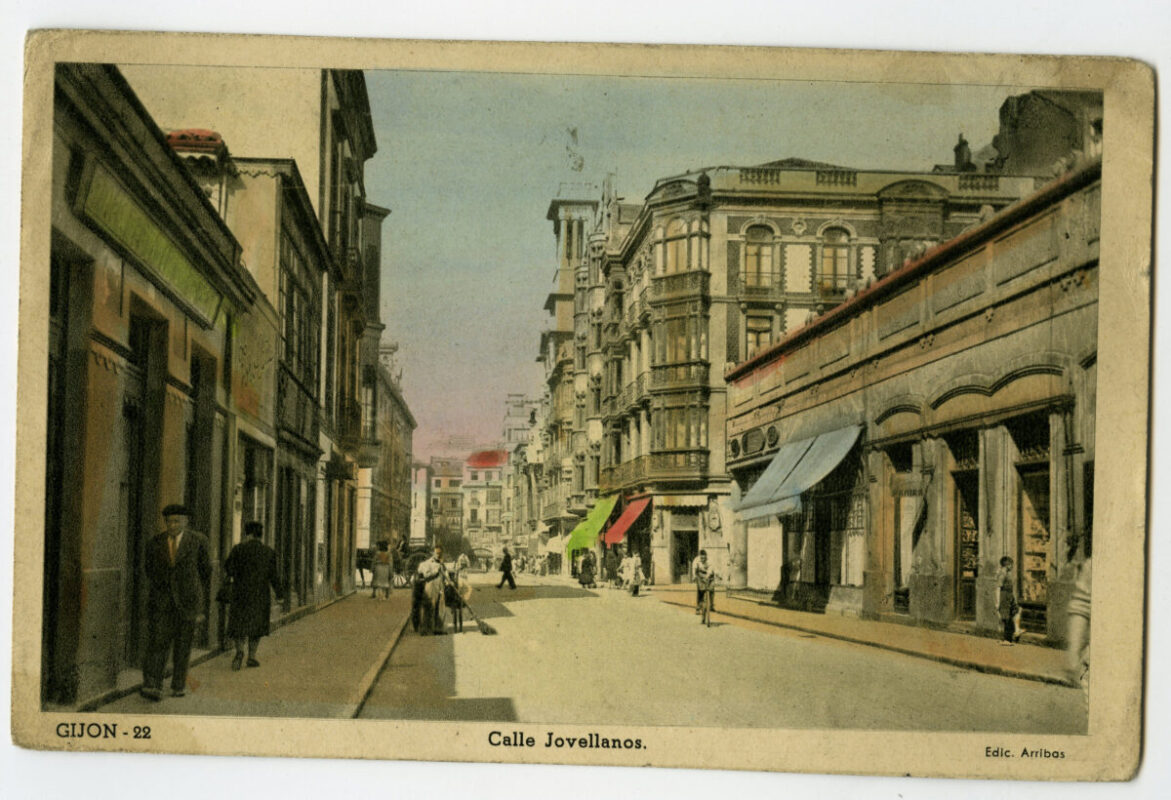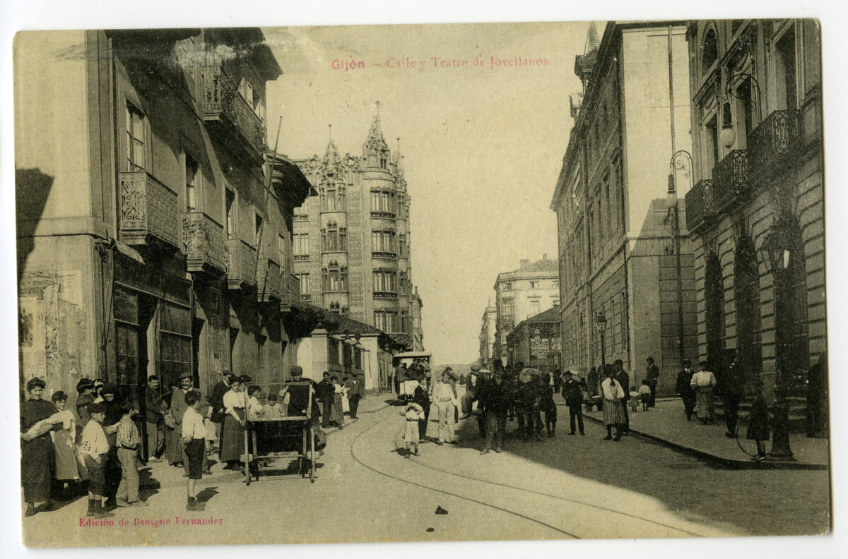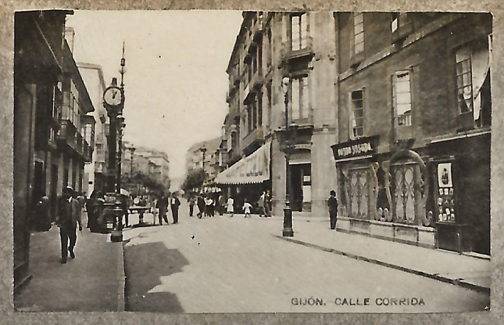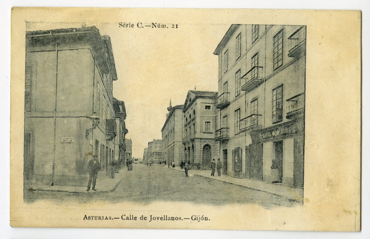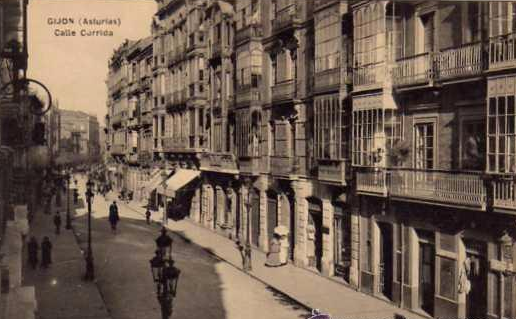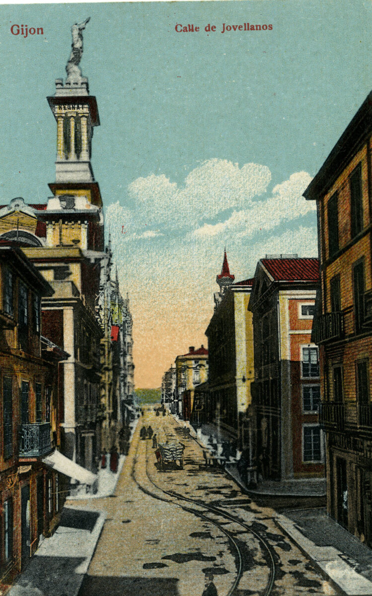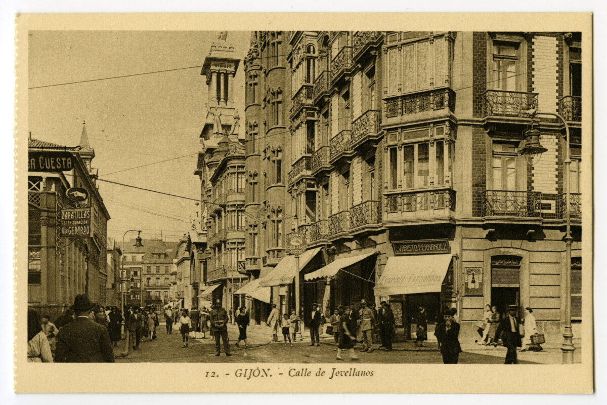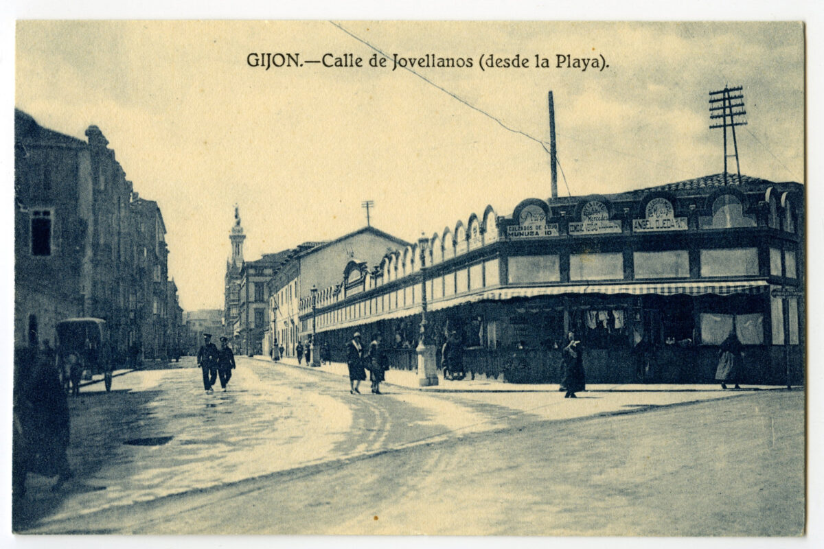 En los años que siguen, se procede a un remozamiento del caserío y al macizamiento de ese núcleo central que se había convertido en el corazón de la ciudad, y que coincidía con la zona delimitada por el «Plan de Mejoras» propuesto por Jove llanos. En él se asienta la pujante burguesía y se radican los establecimientos que responden a las demandas crecientes del sector terciario. Bancos, hoteles, comercios, teatros, mercados, edificios de viviendas, etc., de nueva construcción, suplantan a viejas construcciones o llenan solares vacíos, dando nuevo aire de ciudad burguesa a un peque ño número de calles -Corrida, Moros, San Bernardo, Jovellanos, etc.-, que serán el tema recurrente de la mayoría de las postales que por entonces se editan.