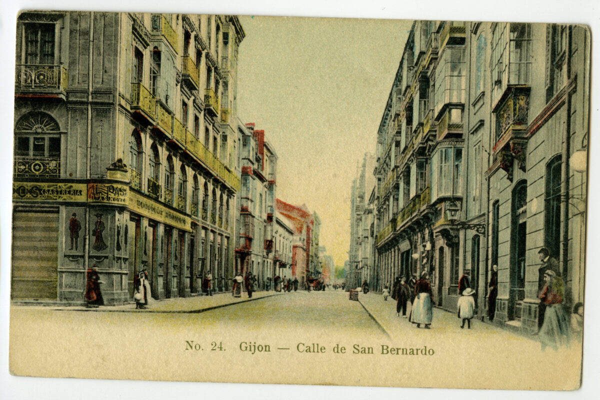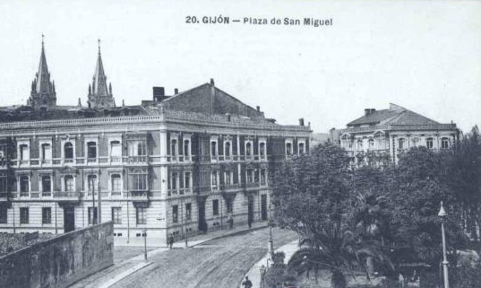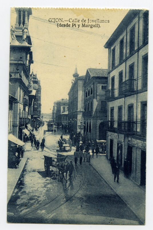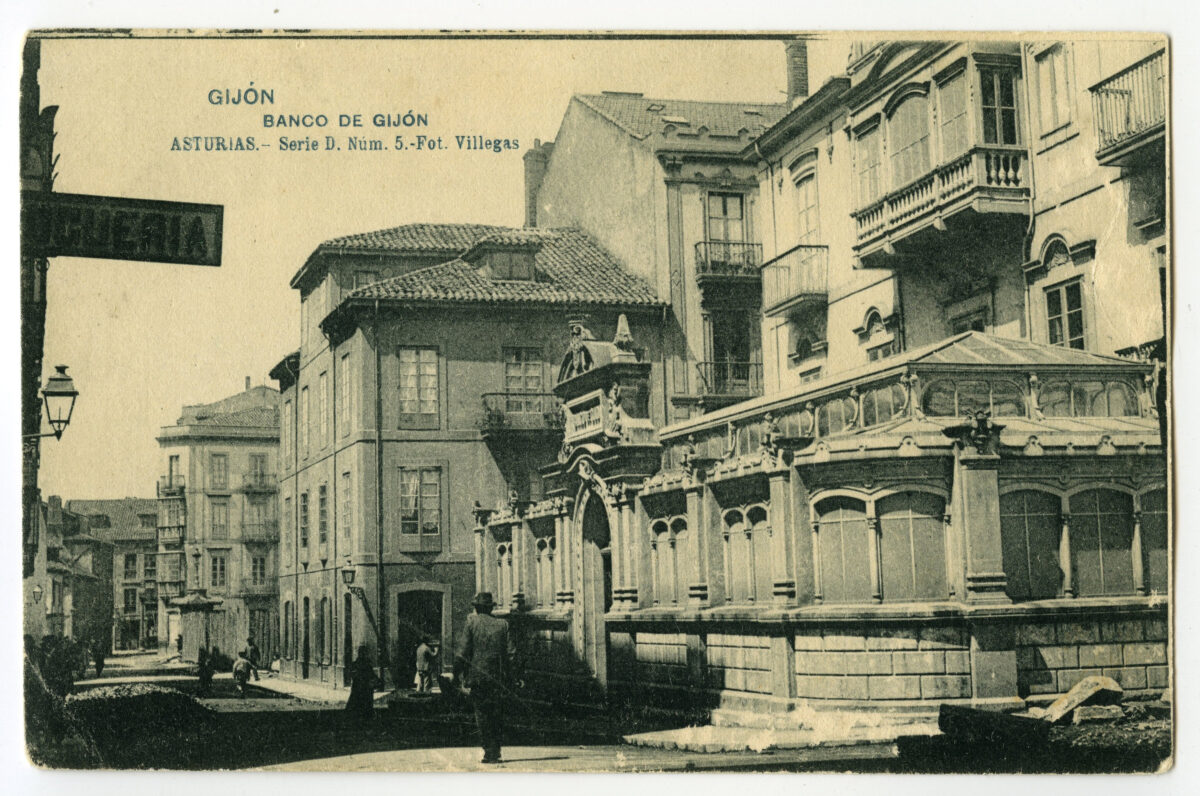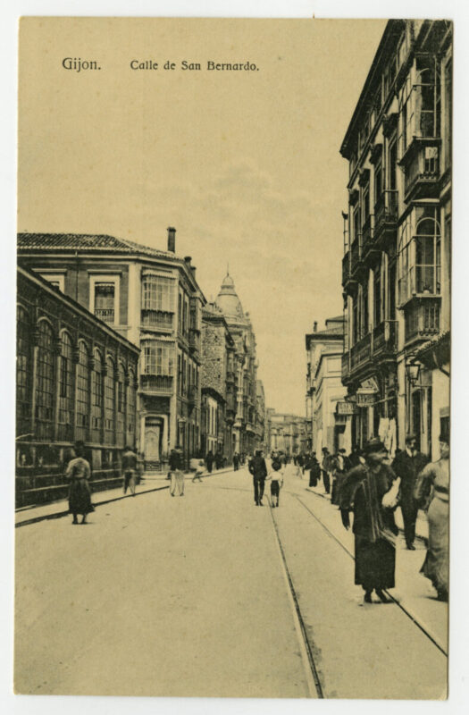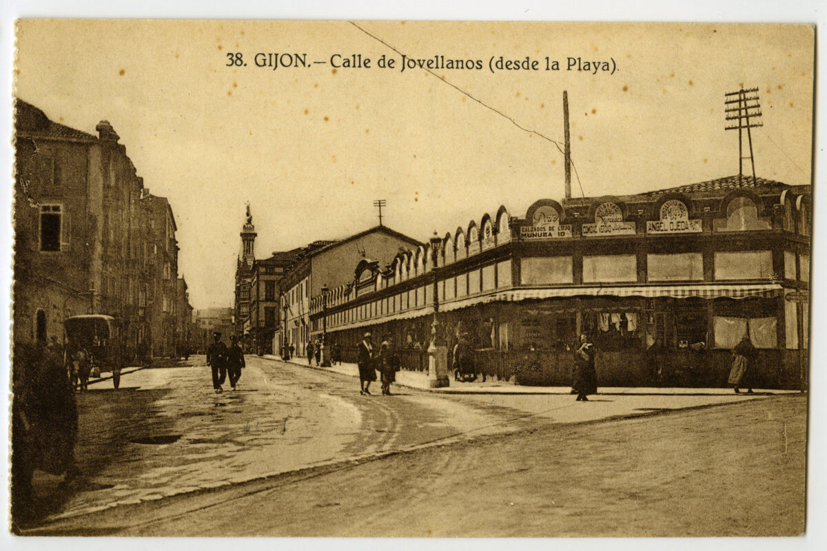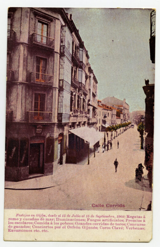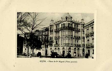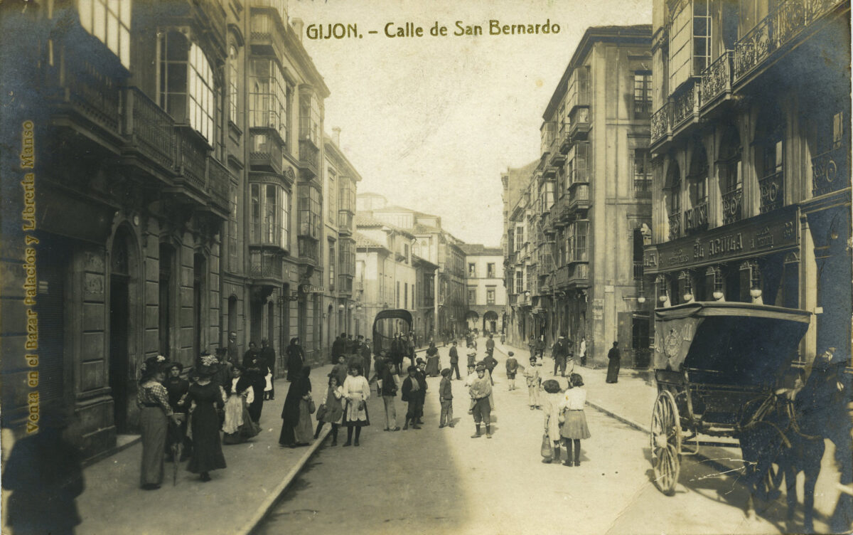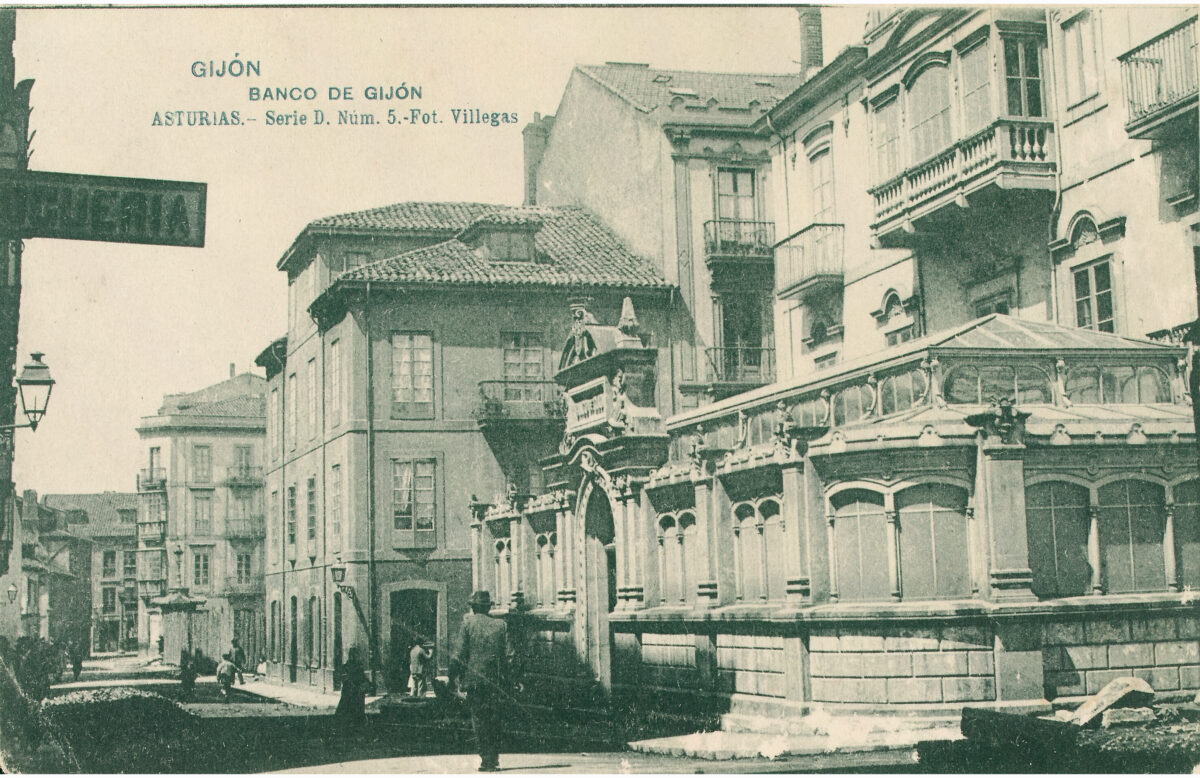 En los años que siguen, se procede a un remozamiento del caserío y al macizamiento de ese núcleo central que se había convertido en el corazón de la ciudad, y que coincidía con la zona delimitada por el «Plan de Mejoras» propuesto por Jove llanos. En él se asienta la pujante burguesía y se radican los establecimientos que responden a las demandas crecientes del sector terciario. Bancos, hoteles, comercios, teatros, mercados, edificios de viviendas, etc., de nueva construcción, suplantan a viejas construcciones o llenan solares vacíos, dando nuevo aire de ciudad burguesa a un peque ño número de calles -Corrida, Moros, San Bernardo, Jovellanos, etc.-, que serán el tema recurrente de la mayoría de las postales que por entonces se editan.