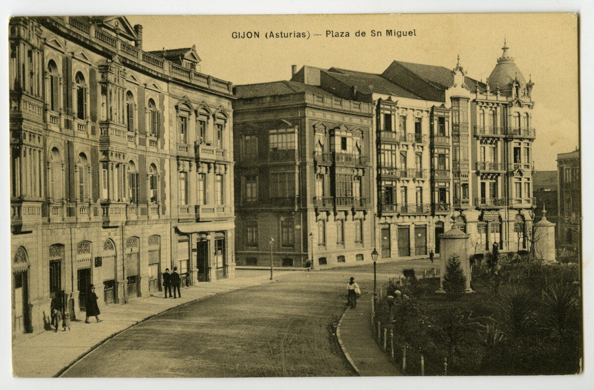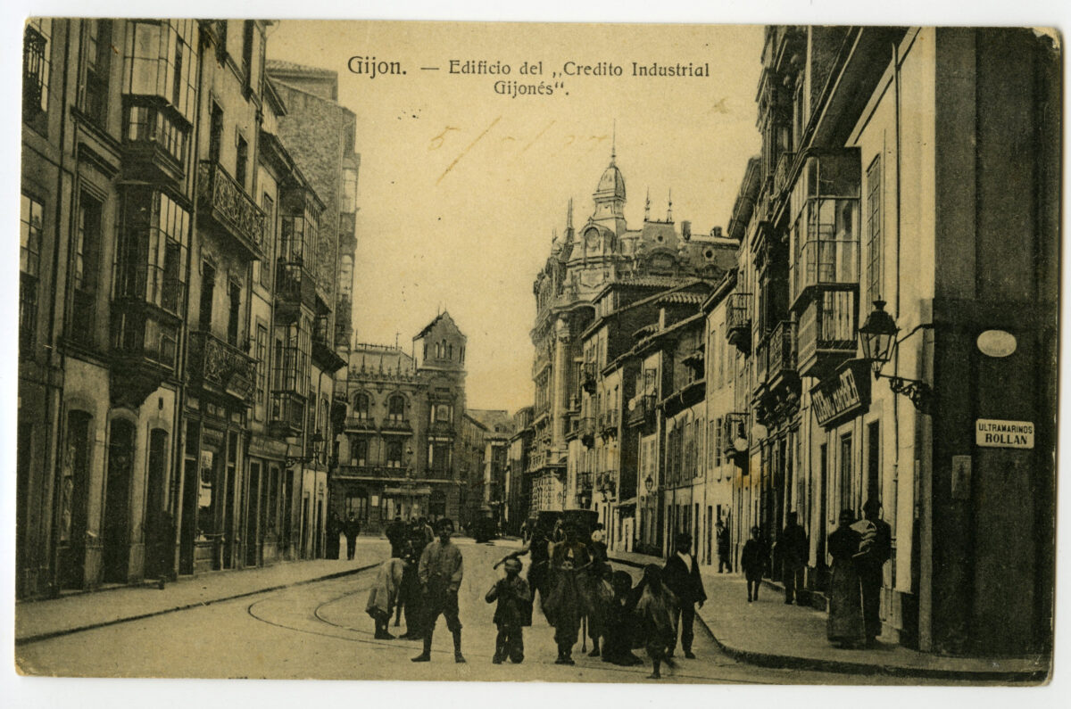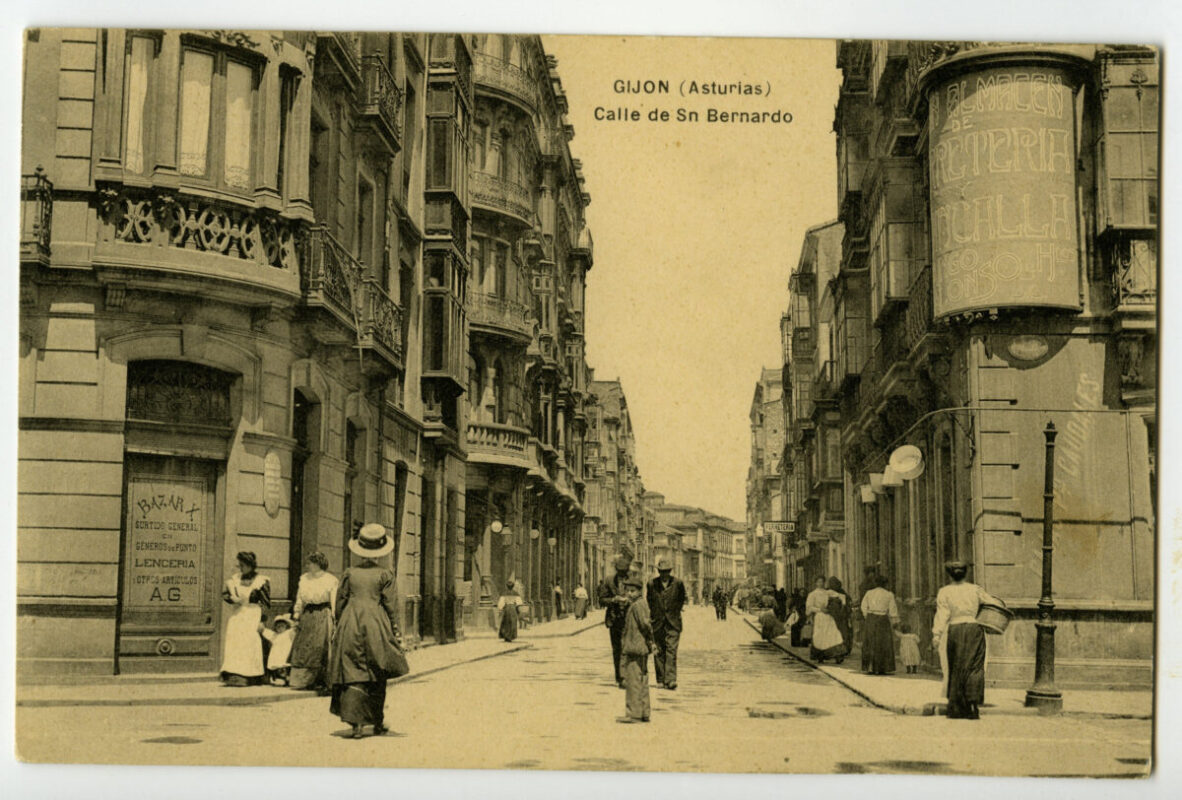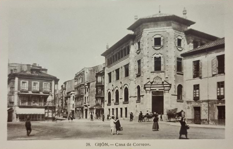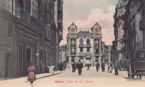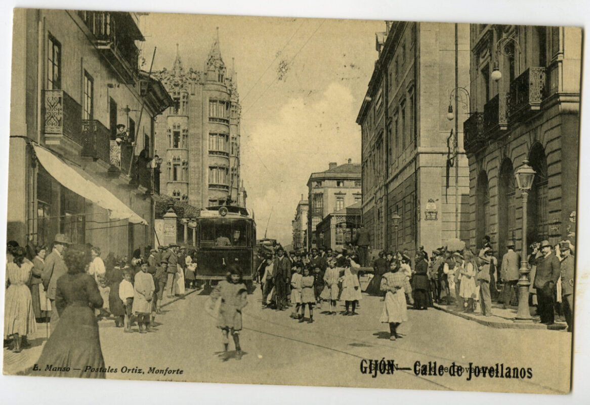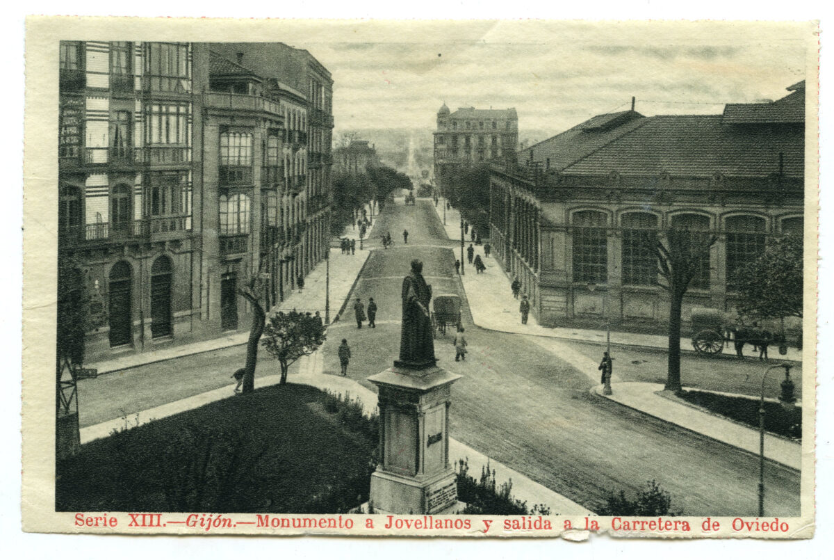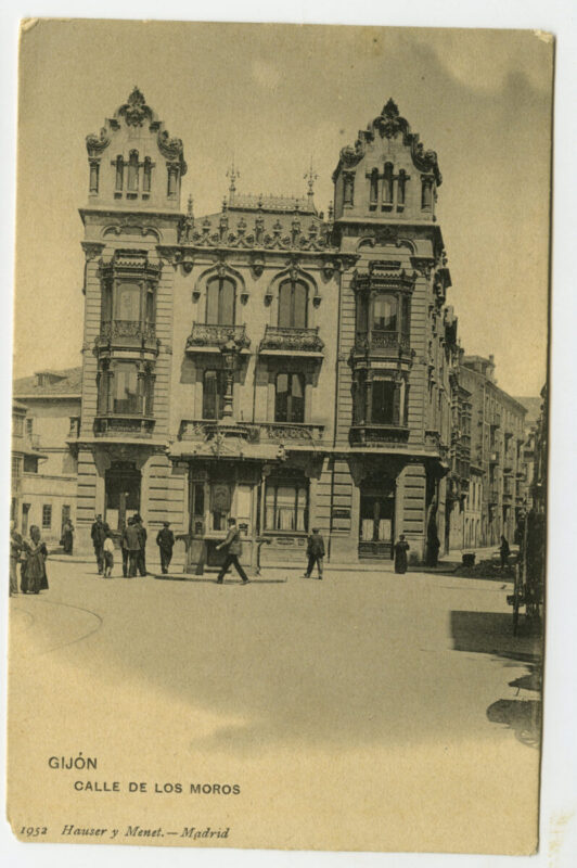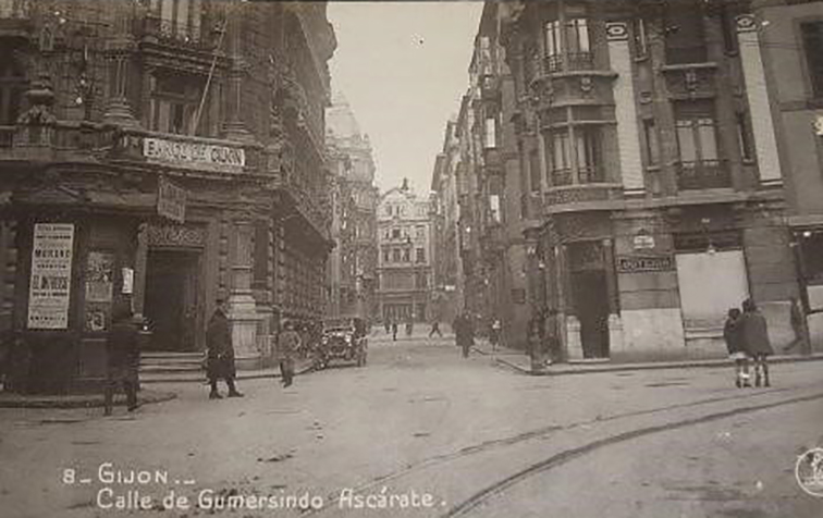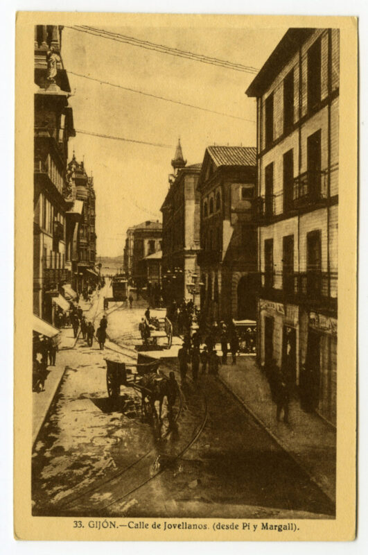 En los años que siguen, se procede a un remozamiento del caserío y al macizamiento de ese núcleo central que se había convertido en el corazón de la ciudad, y que coincidía con la zona delimitada por el «Plan de Mejoras» propuesto por Jove llanos. En él se asienta la pujante burguesía y se radican los establecimientos que responden a las demandas crecientes del sector terciario. Bancos, hoteles, comercios, teatros, mercados, edificios de viviendas, etc., de nueva construcción, suplantan a viejas construcciones o llenan solares vacíos, dando nuevo aire de ciudad burguesa a un peque ño número de calles -Corrida, Moros, San Bernardo, Jovellanos, etc.-, que serán el tema recurrente de la mayoría de las postales que por entonces se editan.