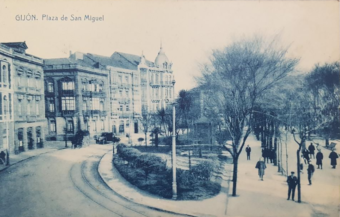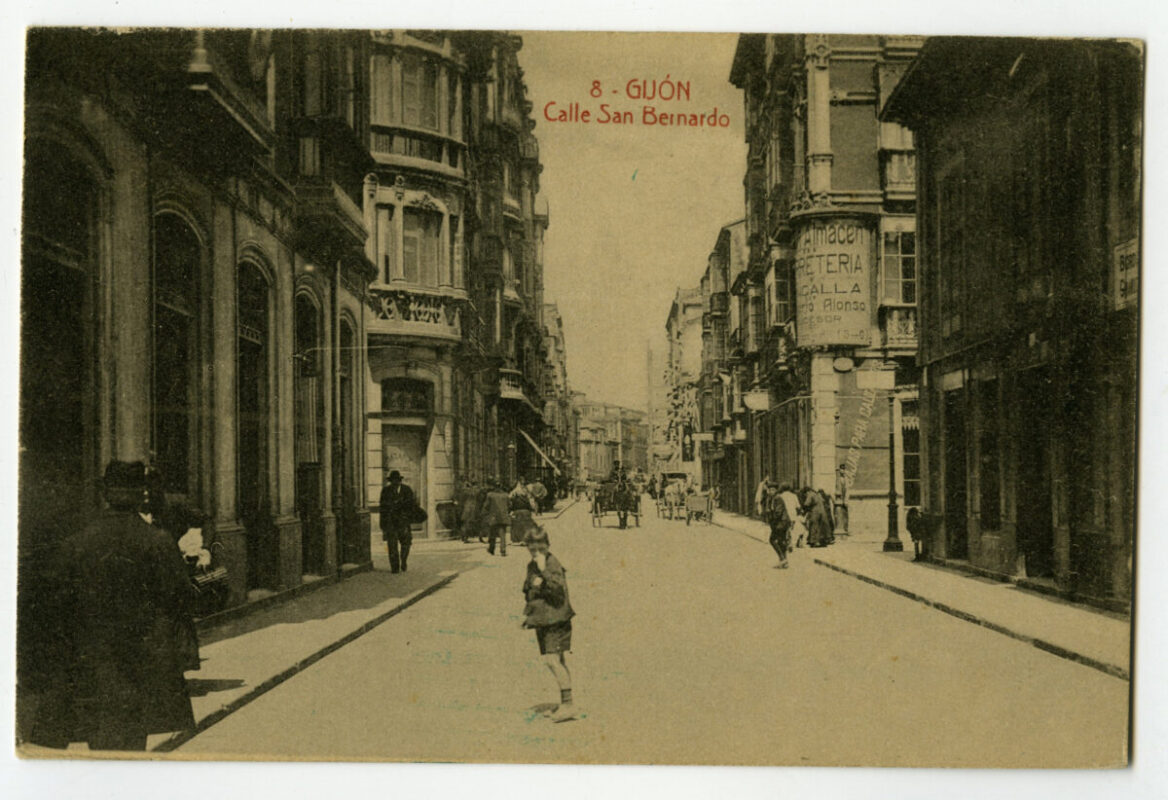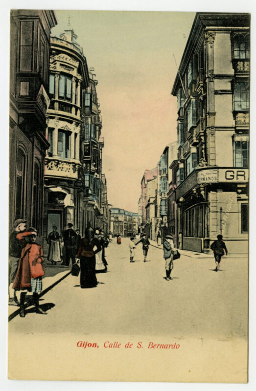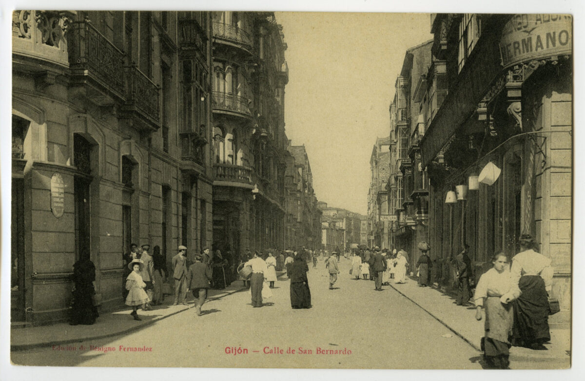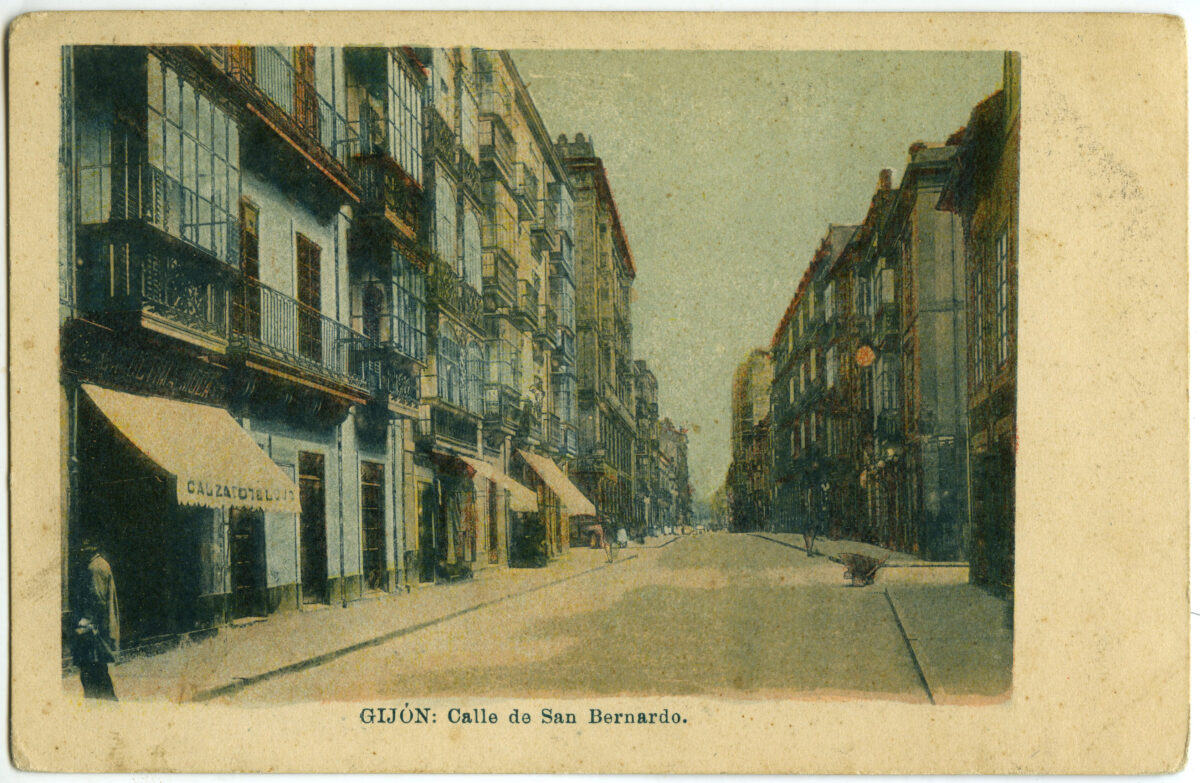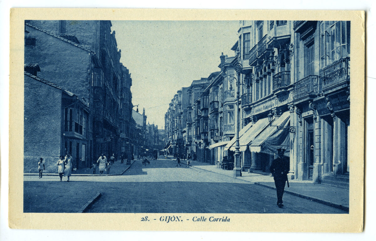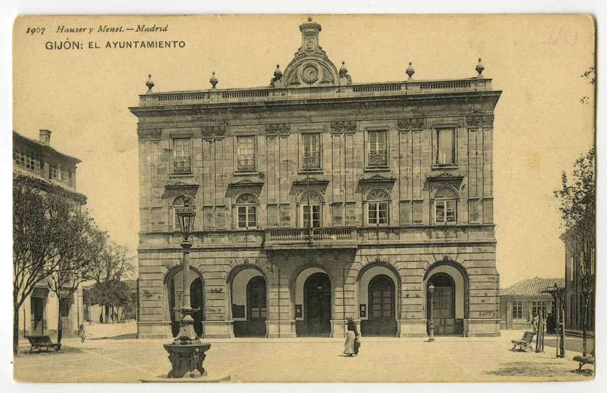 En los años que siguen, se procede a un remozamiento del caserío y al macizamiento de ese núcleo central que se había convertido en el corazón de la ciudad, y que coincidía con la zona delimitada por el «Plan de Mejoras» propuesto por Jove llanos. En él se asienta la pujante burguesía y se radican los establecimientos que responden a las demandas crecientes del sector terciario. Bancos, hoteles, comercios, teatros, mercados, edificios de viviendas, etc., de nueva construcción, suplantan a viejas construcciones o llenan solares vacíos, dando nuevo aire de ciudad burguesa a un peque ño número de calles -Corrida, Moros, San Bernardo, Jovellanos, etc.-, que serán el tema recurrente de la mayoría de las postales que por entonces se editan.