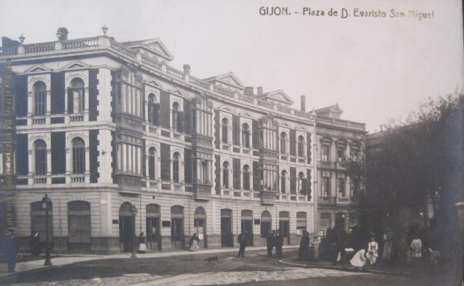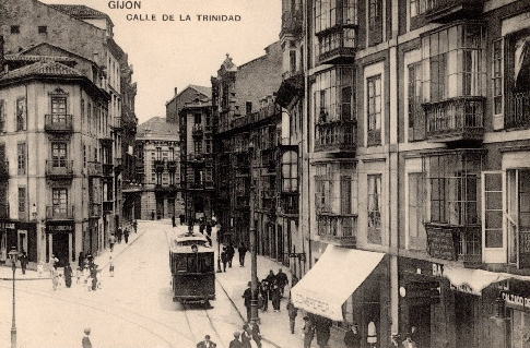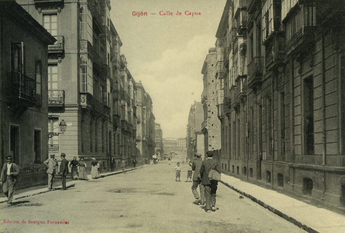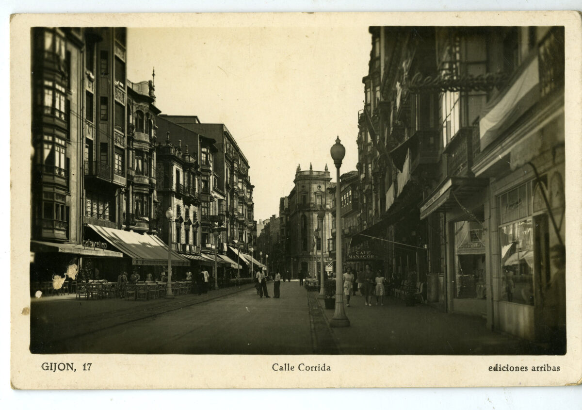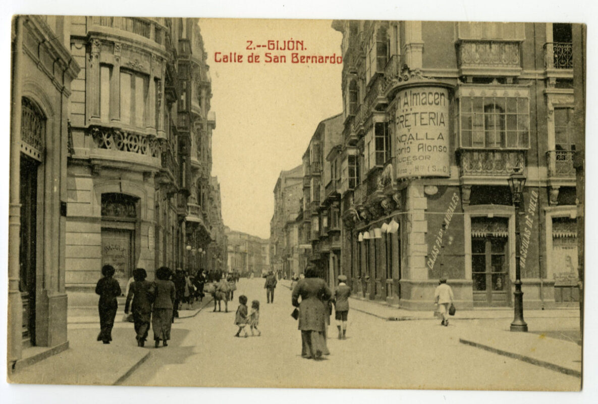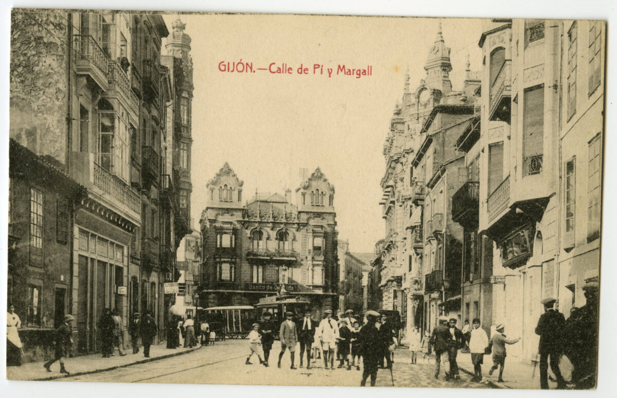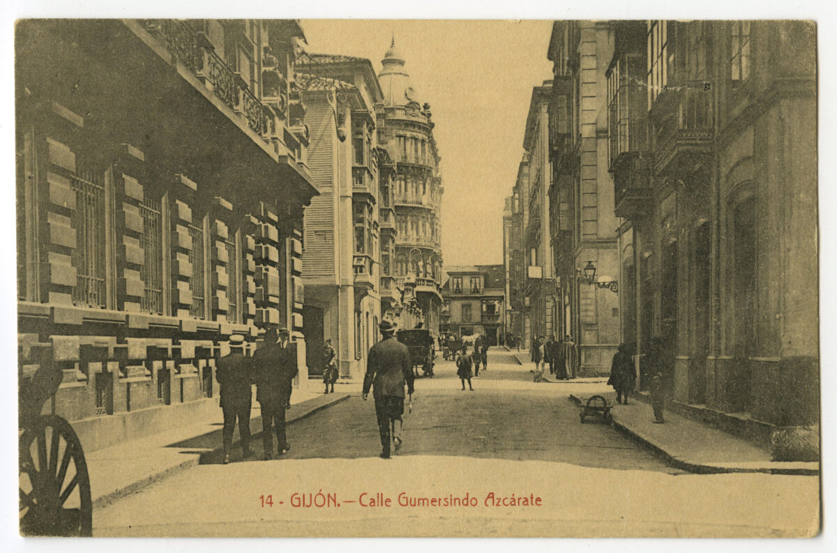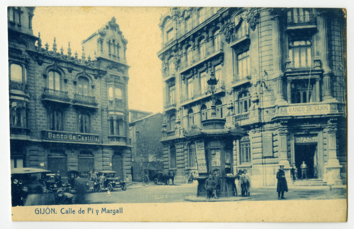 En los años que siguen, se procede a un remozamiento del caserío y al macizamiento de ese núcleo central que se había convertido en el corazón de la ciudad, y que coincidía con la zona delimitada por el «Plan de Mejoras» propuesto por Jove llanos. En él se asienta la pujante burguesía y se radican los establecimientos que responden a las demandas crecientes del sector terciario. Bancos, hoteles, comercios, teatros, mercados, edificios de viviendas, etc., de nueva construcción, suplantan a viejas construcciones o llenan solares vacíos, dando nuevo aire de ciudad burguesa a un peque ño número de calles -Corrida, Moros, San Bernardo, Jovellanos, etc.-, que serán el tema recurrente de la mayoría de las postales que por entonces se editan.
