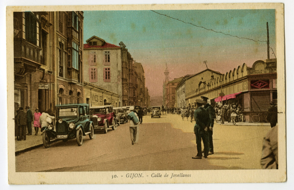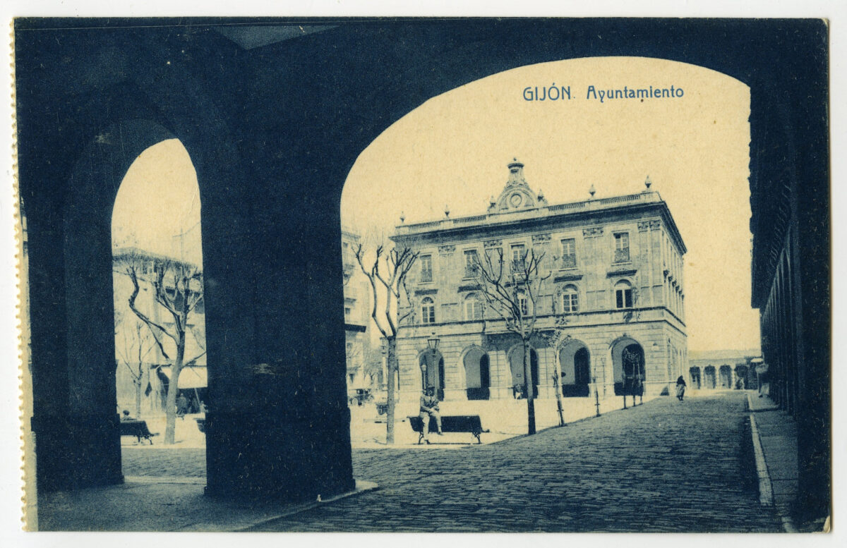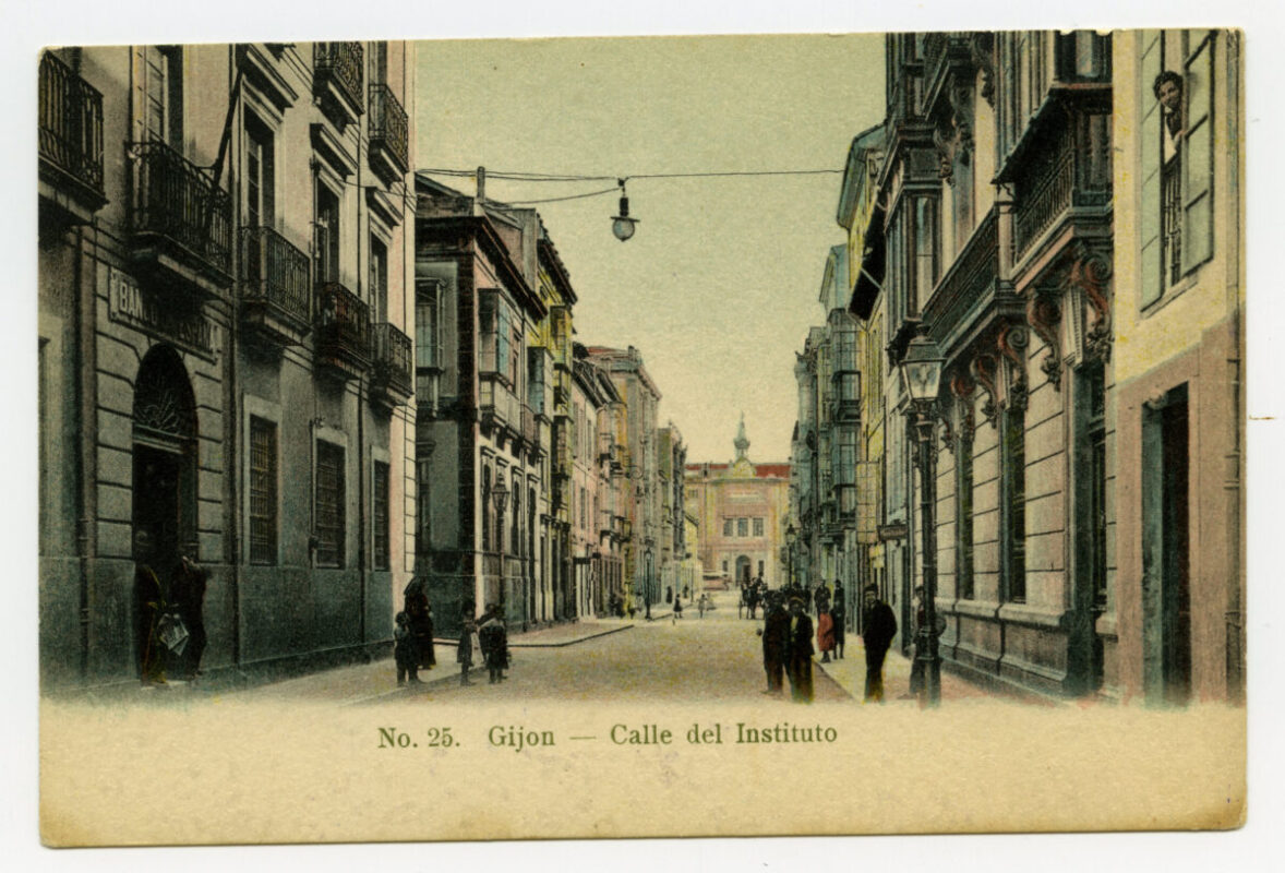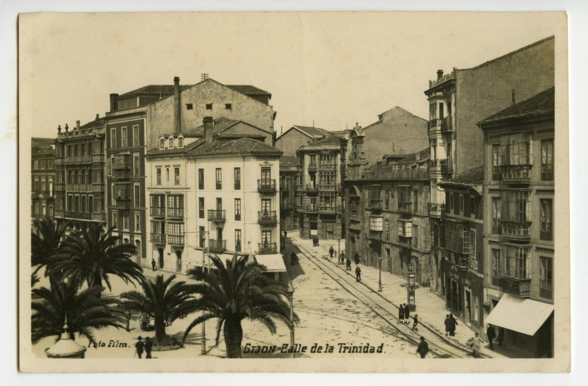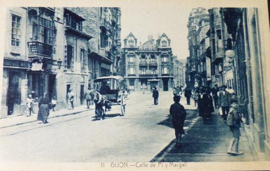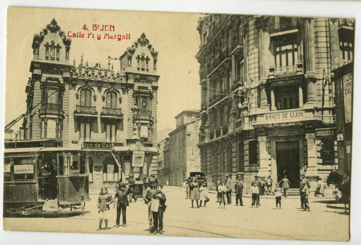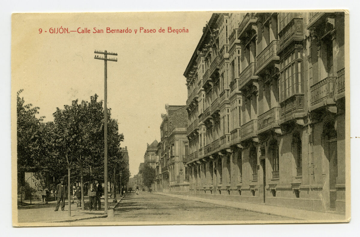 En los años que siguen, se procede a un remozamiento del caserío y al macizamiento de ese núcleo central que se había convertido en el corazón de la ciudad, y que coincidía con la zona delimitada por el «Plan de Mejoras» propuesto por Jove llanos. En él se asienta la pujante burguesía y se radican los establecimientos que responden a las demandas crecientes del sector terciario. Bancos, hoteles, comercios, teatros, mercados, edificios de viviendas, etc., de nueva construcción, suplantan a viejas construcciones o llenan solares vacíos, dando nuevo aire de ciudad burguesa a un peque ño número de calles -Corrida, Moros, San Bernardo, Jovellanos, etc.-, que serán el tema recurrente de la mayoría de las postales que por entonces se editan.