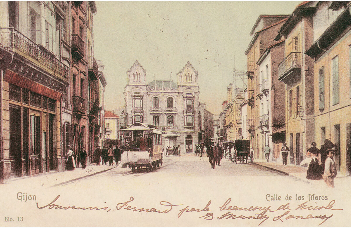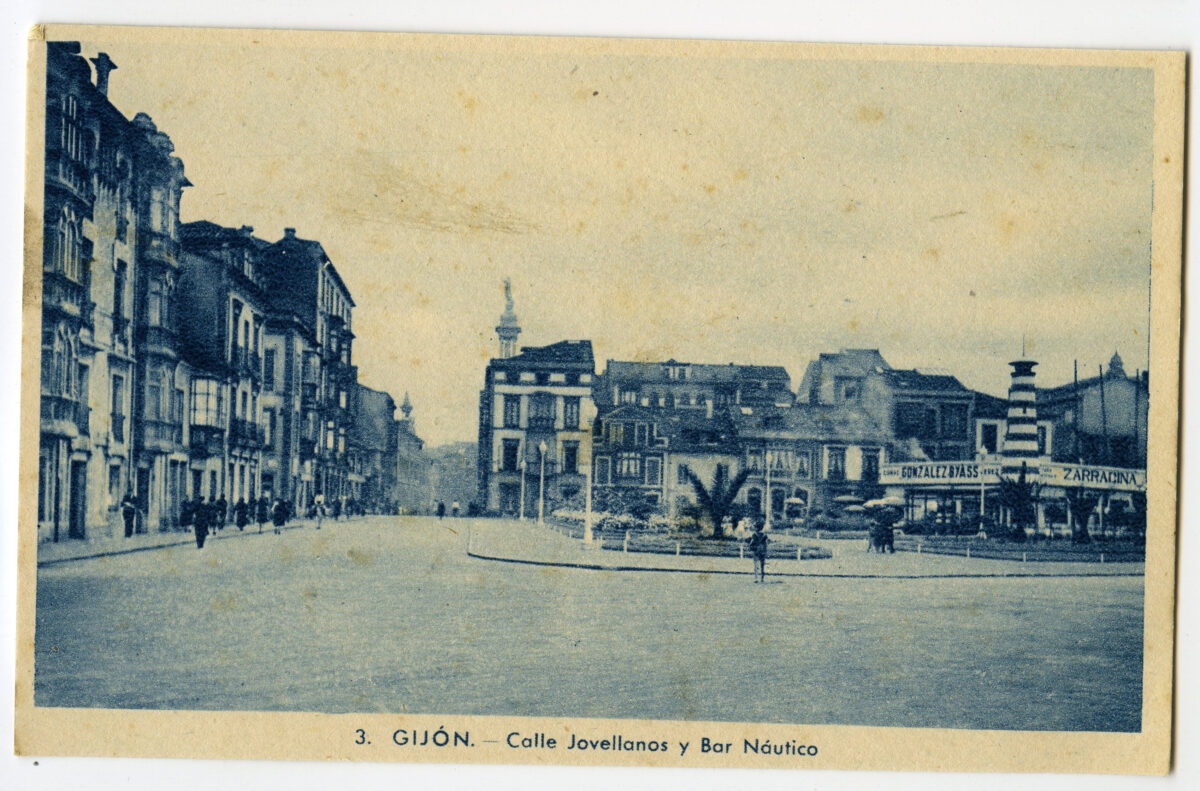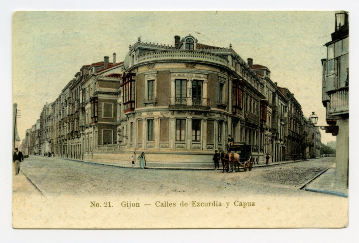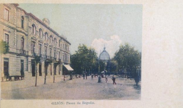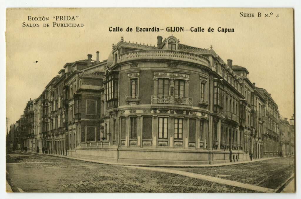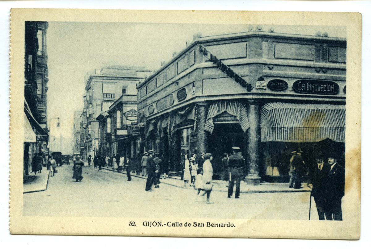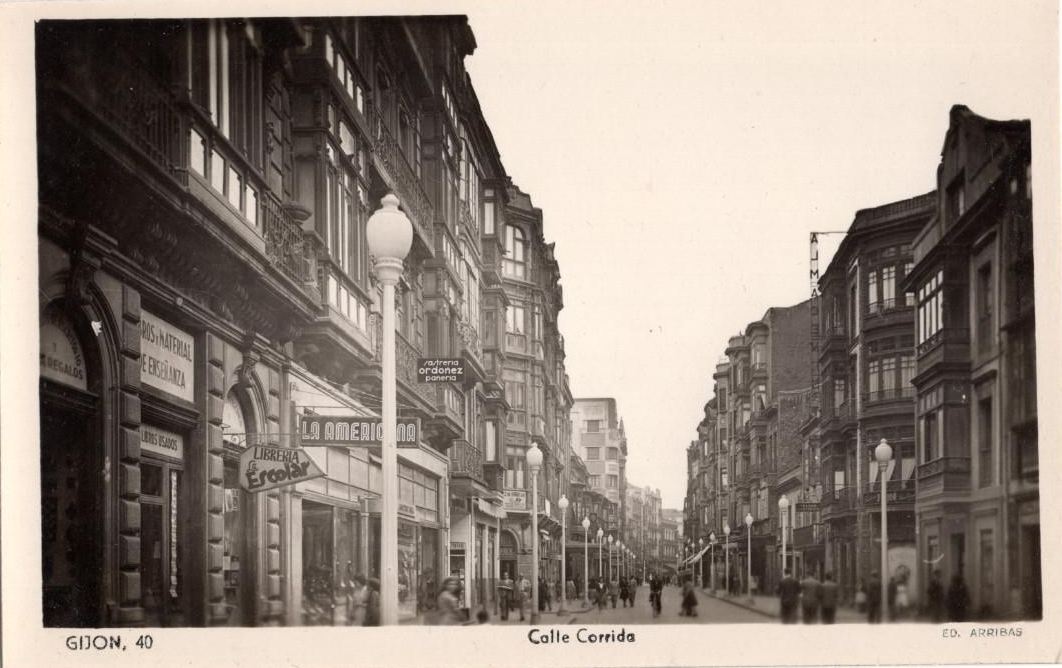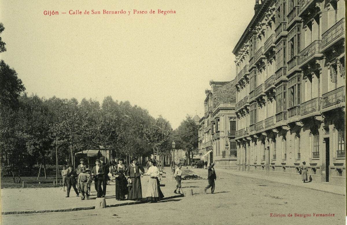 En los años que siguen, se procede a un remozamiento del caserío y al macizamiento de ese núcleo central que se había convertido en el corazón de la ciudad, y que coincidía con la zona delimitada por el «Plan de Mejoras» propuesto por Jove llanos. En él se asienta la pujante burguesía y se radican los establecimientos que responden a las demandas crecientes del sector terciario. Bancos, hoteles, comercios, teatros, mercados, edificios de viviendas, etc., de nueva construcción, suplantan a viejas construcciones o llenan solares vacíos, dando nuevo aire de ciudad burguesa a un peque ño número de calles -Corrida, Moros, San Bernardo, Jovellanos, etc.-, que serán el tema recurrente de la mayoría de las postales que por entonces se editan.