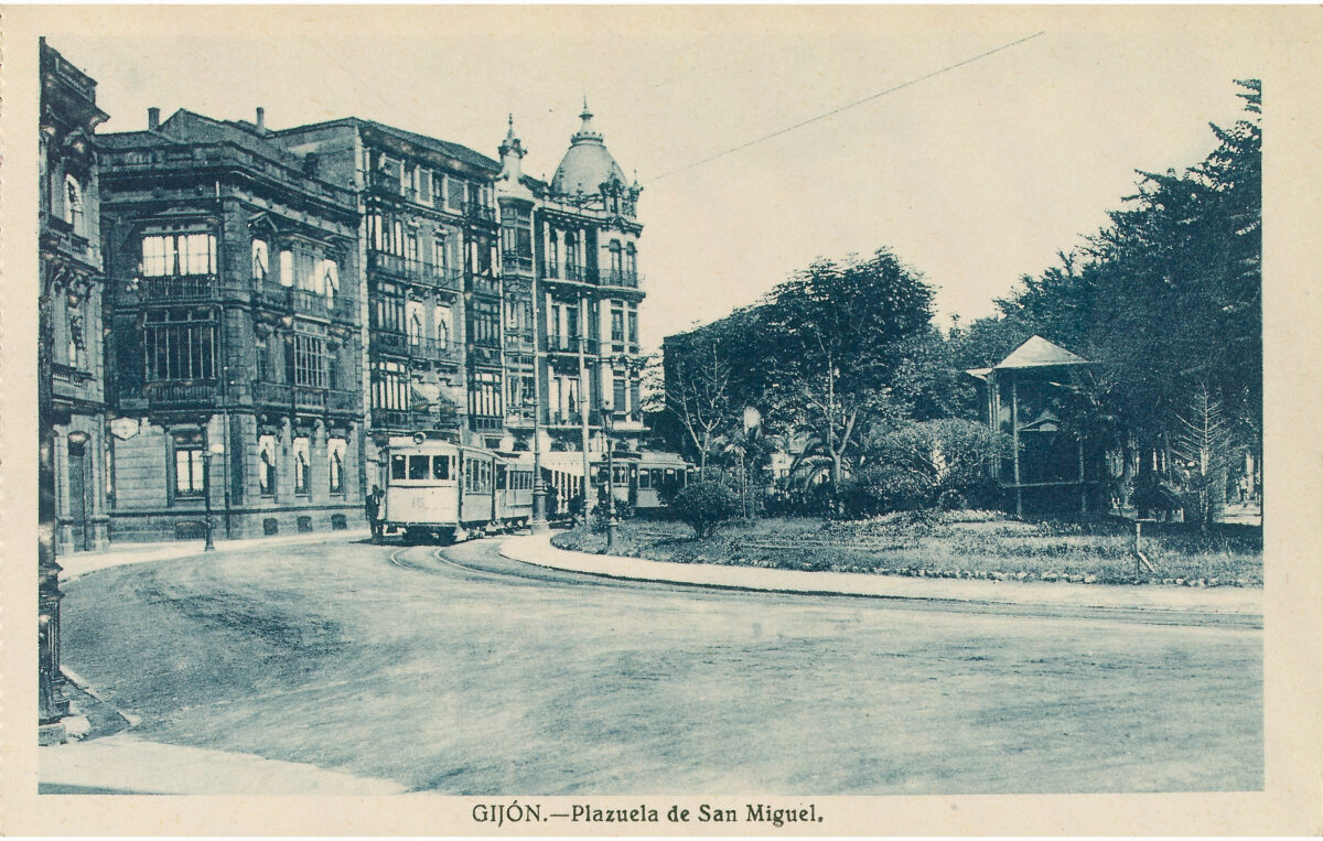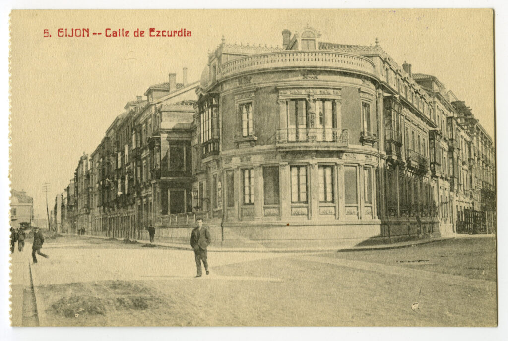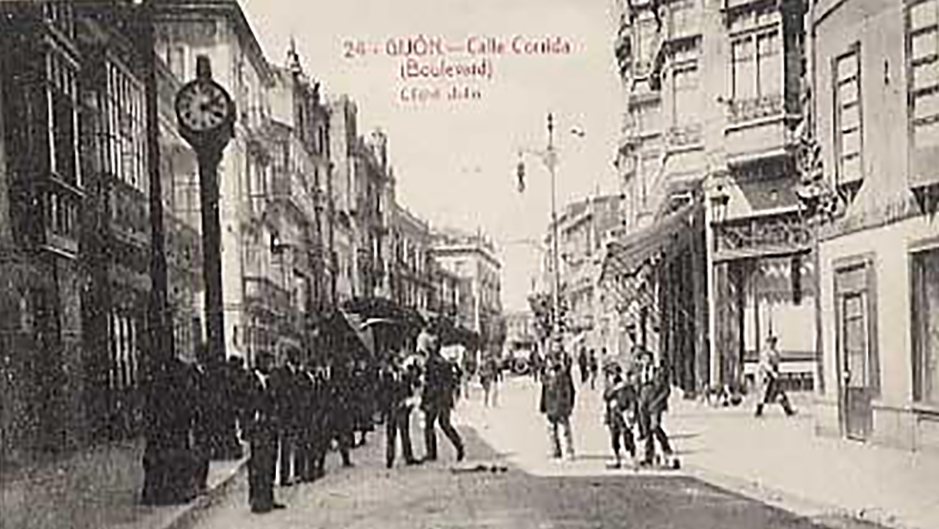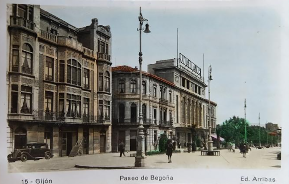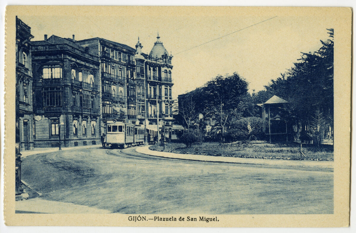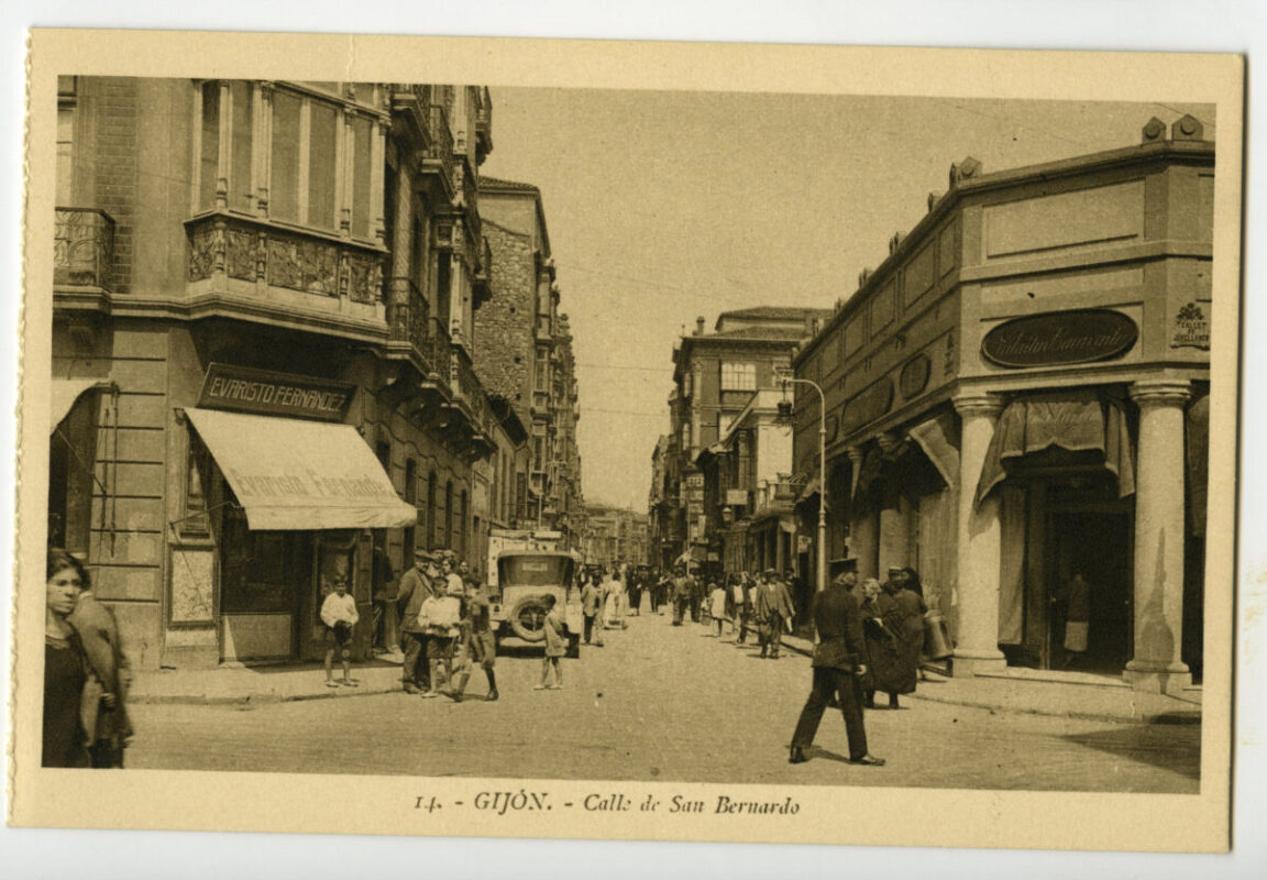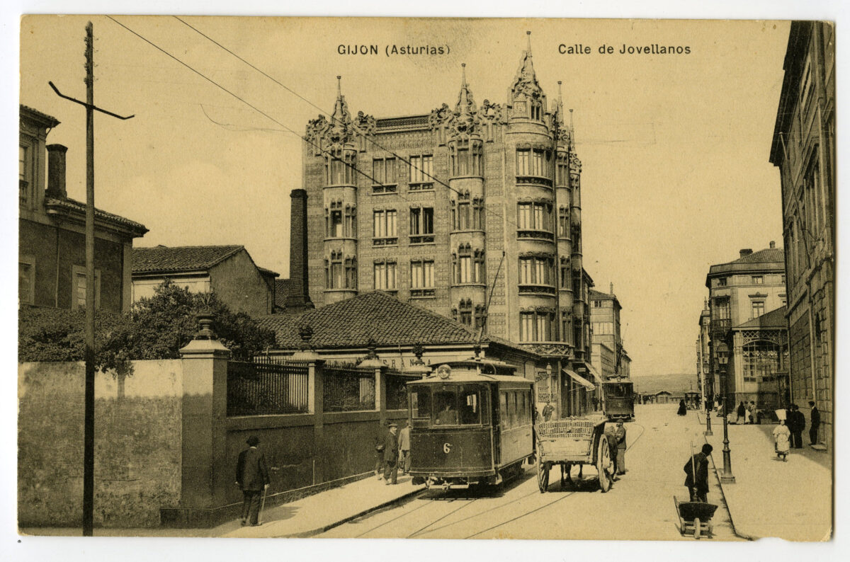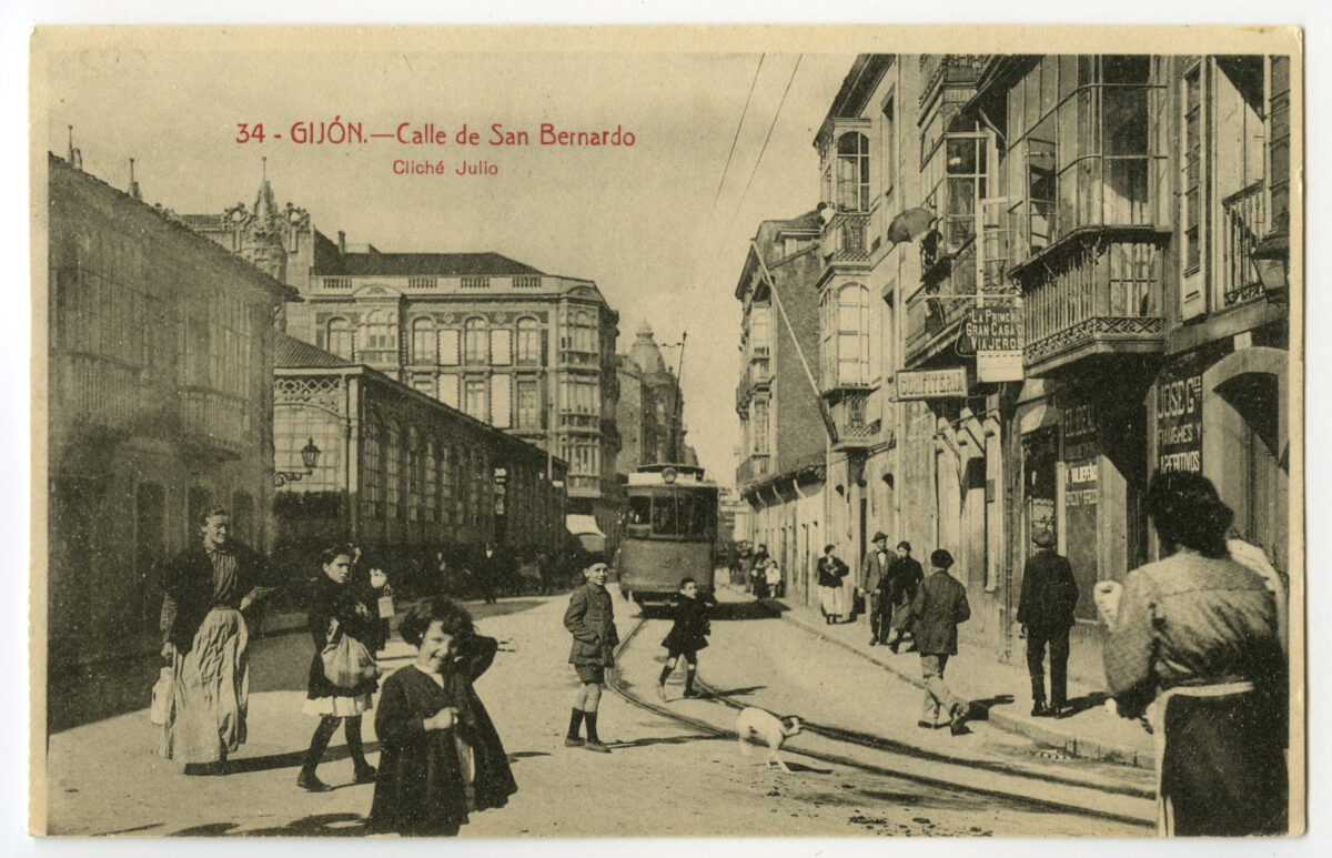 En los años que siguen, se procede a un remozamiento del caserío y al macizamiento de ese núcleo central que se había convertido en el corazón de la ciudad, y que coincidía con la zona delimitada por el «Plan de Mejoras» propuesto por Jove llanos. En él se asienta la pujante burguesía y se radican los establecimientos que responden a las demandas crecientes del sector terciario. Bancos, hoteles, comercios, teatros, mercados, edificios de viviendas, etc., de nueva construcción, suplantan a viejas construcciones o llenan solares vacíos, dando nuevo aire de ciudad burguesa a un peque ño número de calles -Corrida, Moros, San Bernardo, Jovellanos, etc.-, que serán el tema recurrente de la mayoría de las postales que por entonces se editan.