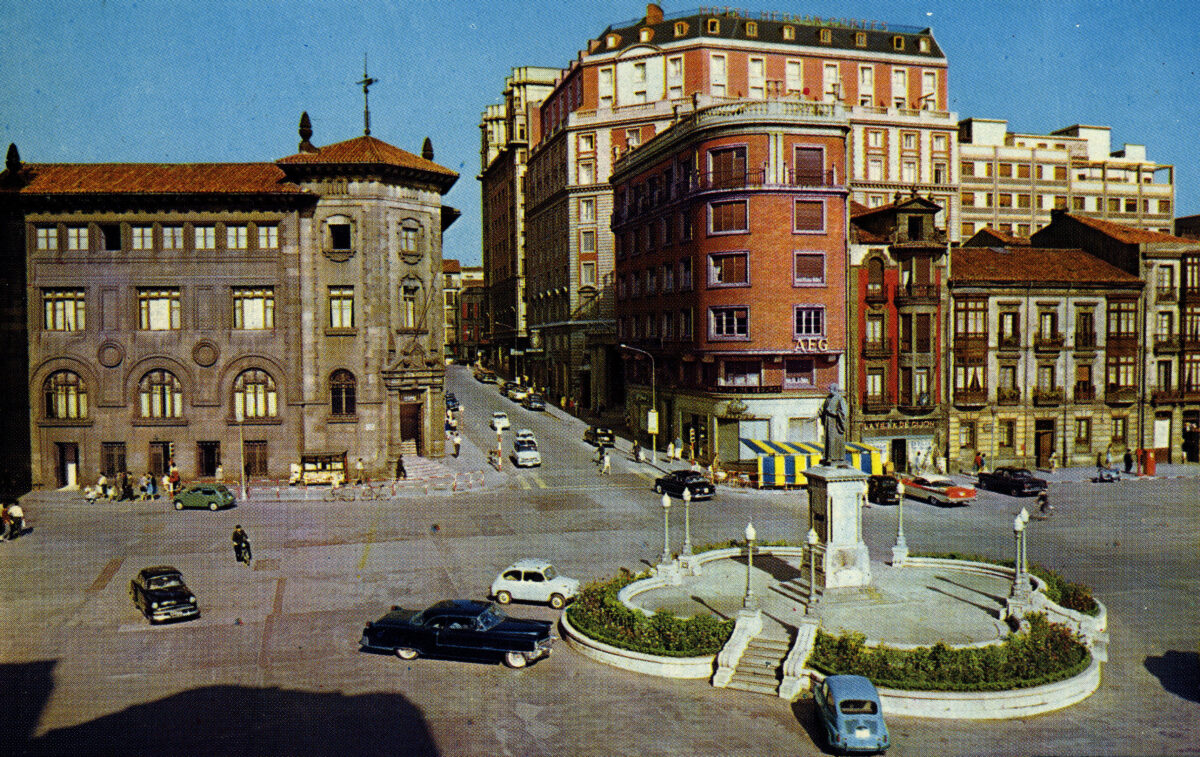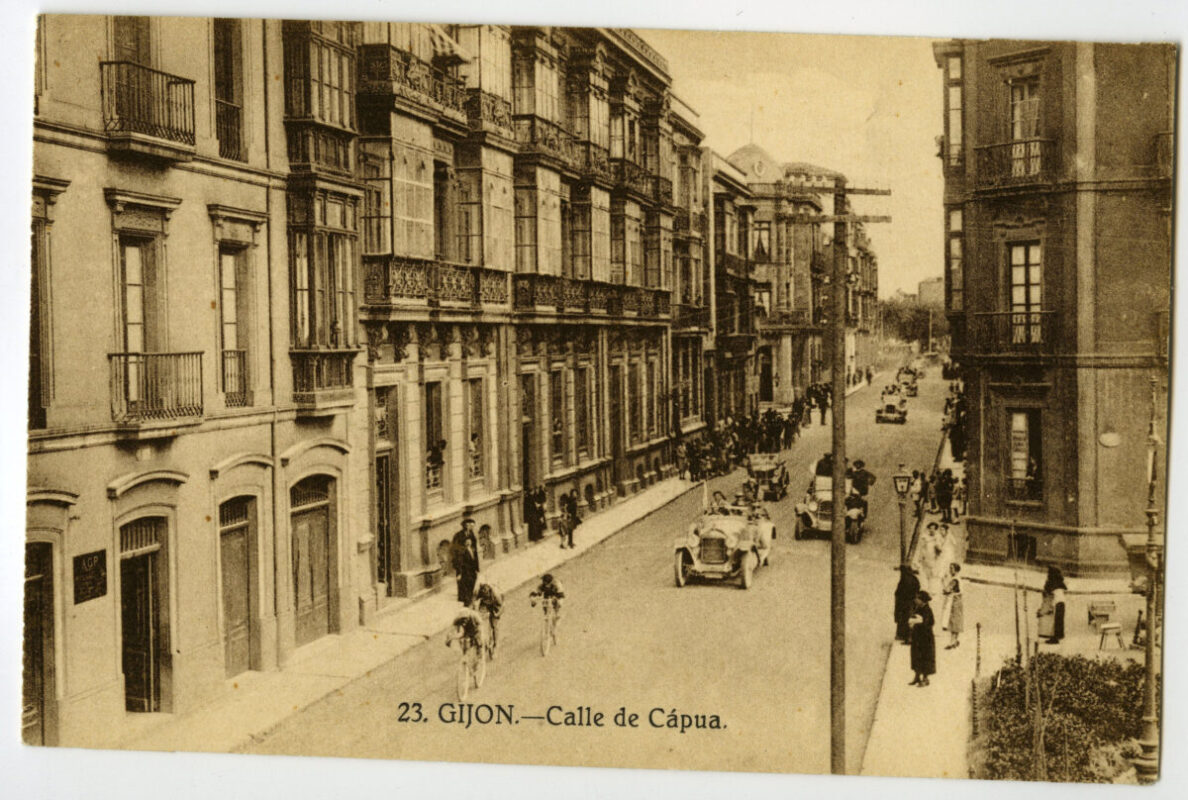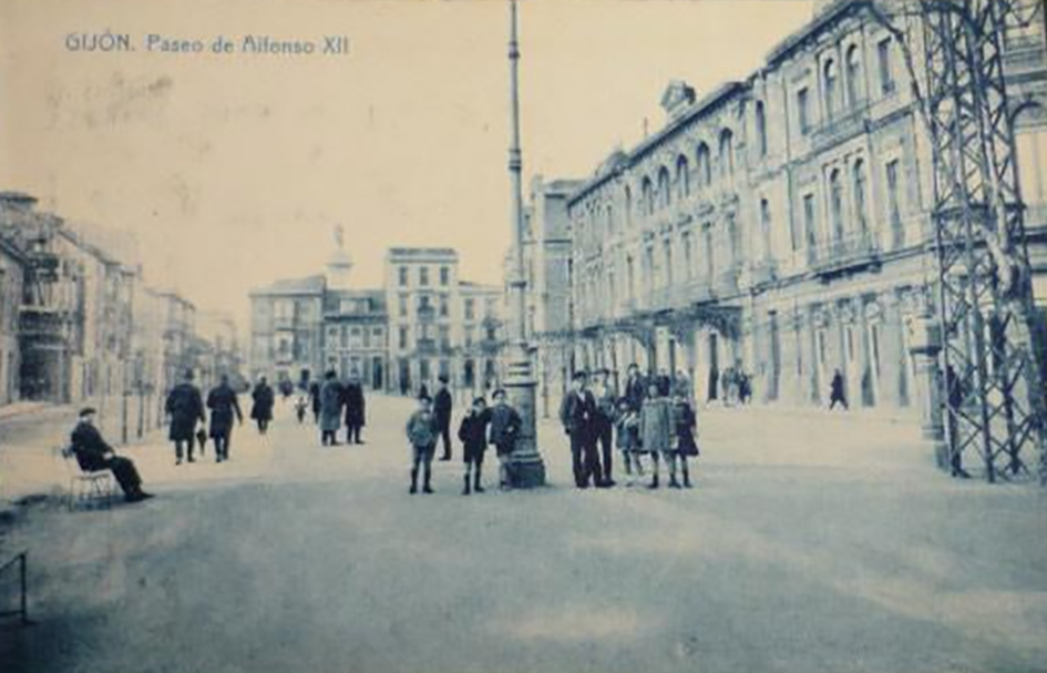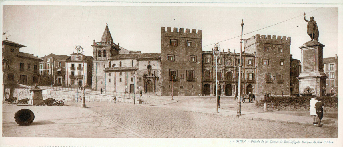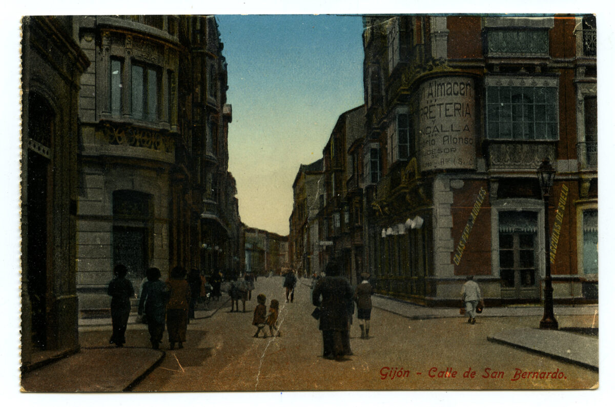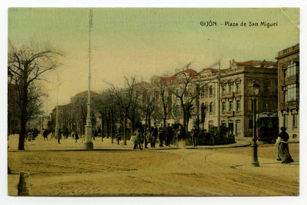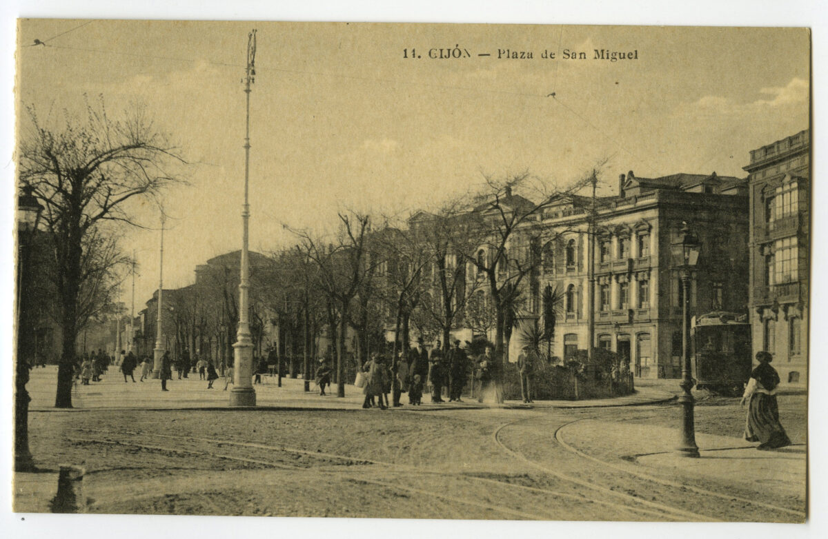 En los años que siguen, se procede a un remozamiento del caserío y al macizamiento de ese núcleo central que se había convertido en el corazón de la ciudad, y que coincidía con la zona delimitada por el «Plan de Mejoras» propuesto por Jove llanos. En él se asienta la pujante burguesía y se radican los establecimientos que responden a las demandas crecientes del sector terciario. Bancos, hoteles, comercios, teatros, mercados, edificios de viviendas, etc., de nueva construcción, suplantan a viejas construcciones o llenan solares vacíos, dando nuevo aire de ciudad burguesa a un peque ño número de calles -Corrida, Moros, San Bernardo, Jovellanos, etc.-, que serán el tema recurrente de la mayoría de las postales que por entonces se editan.