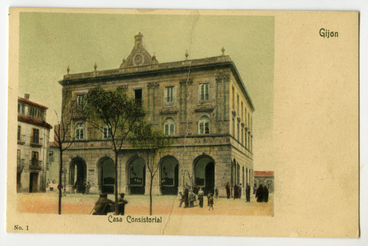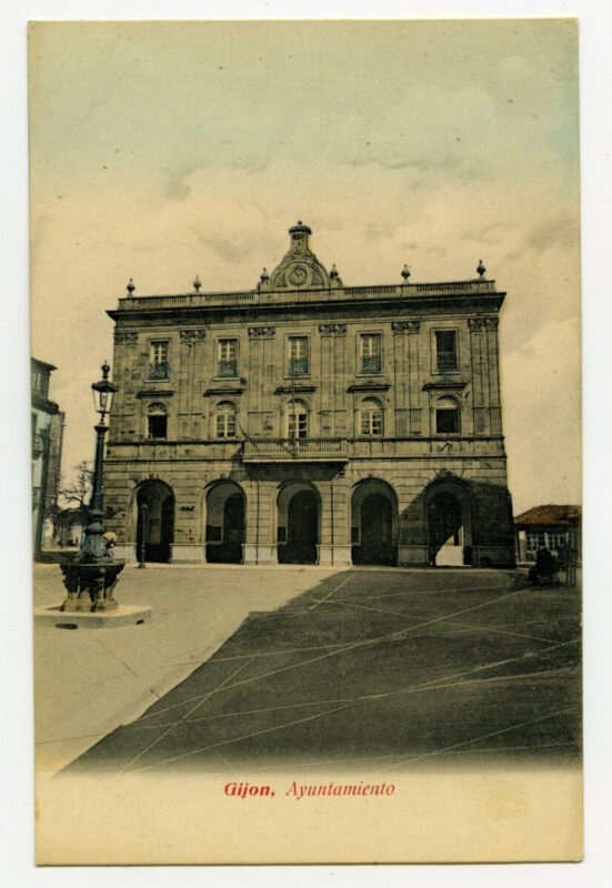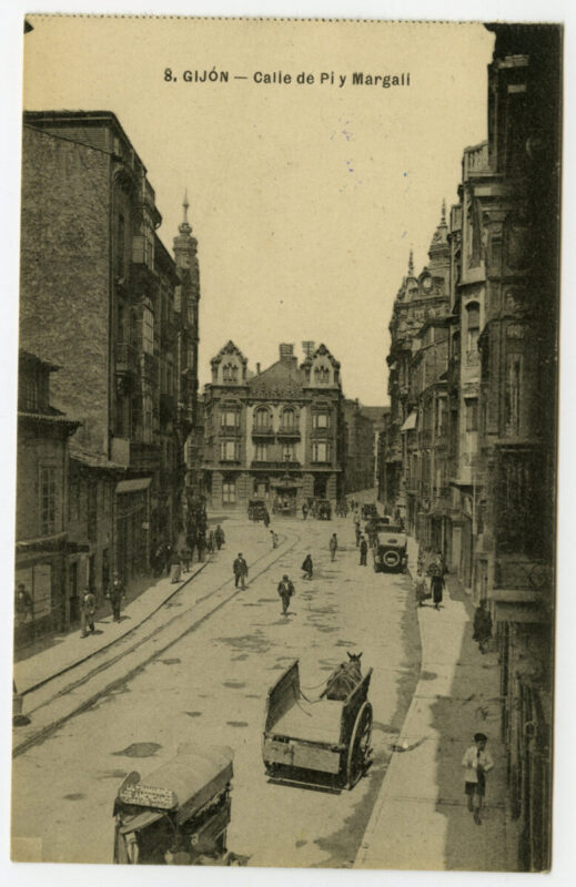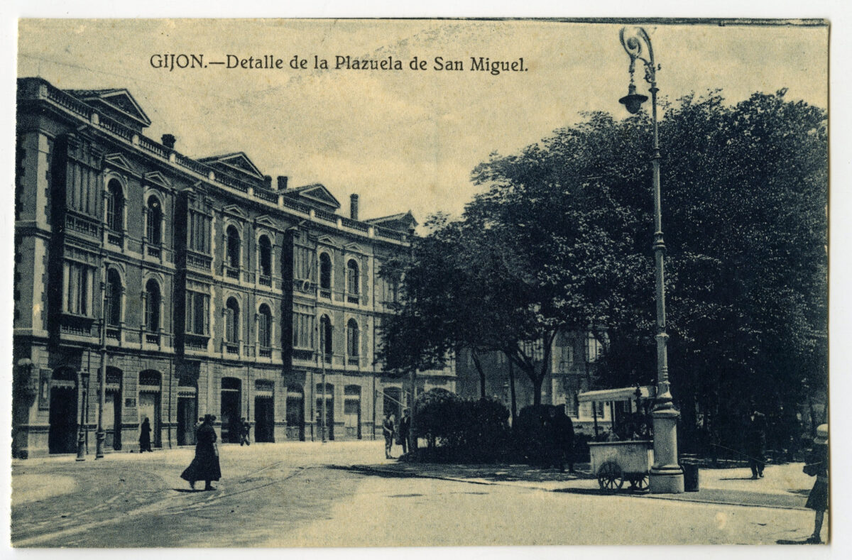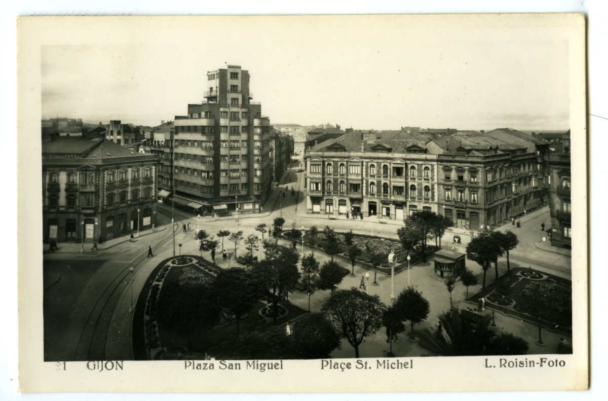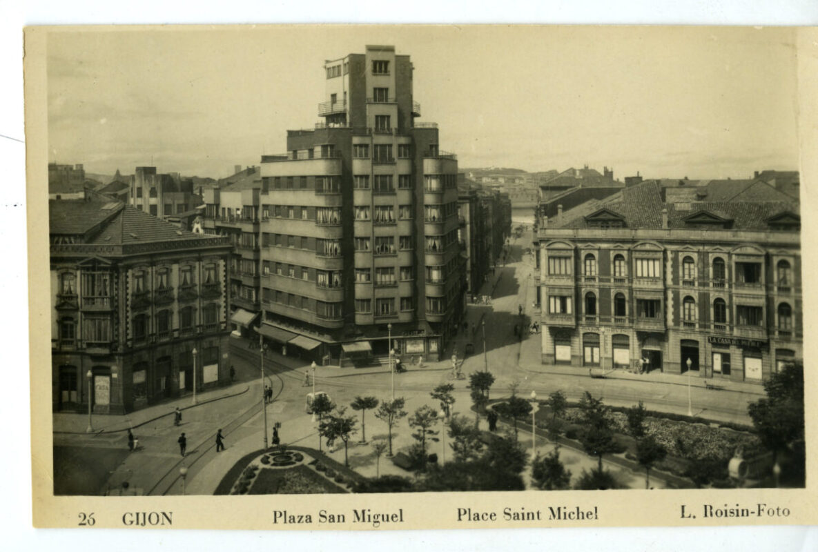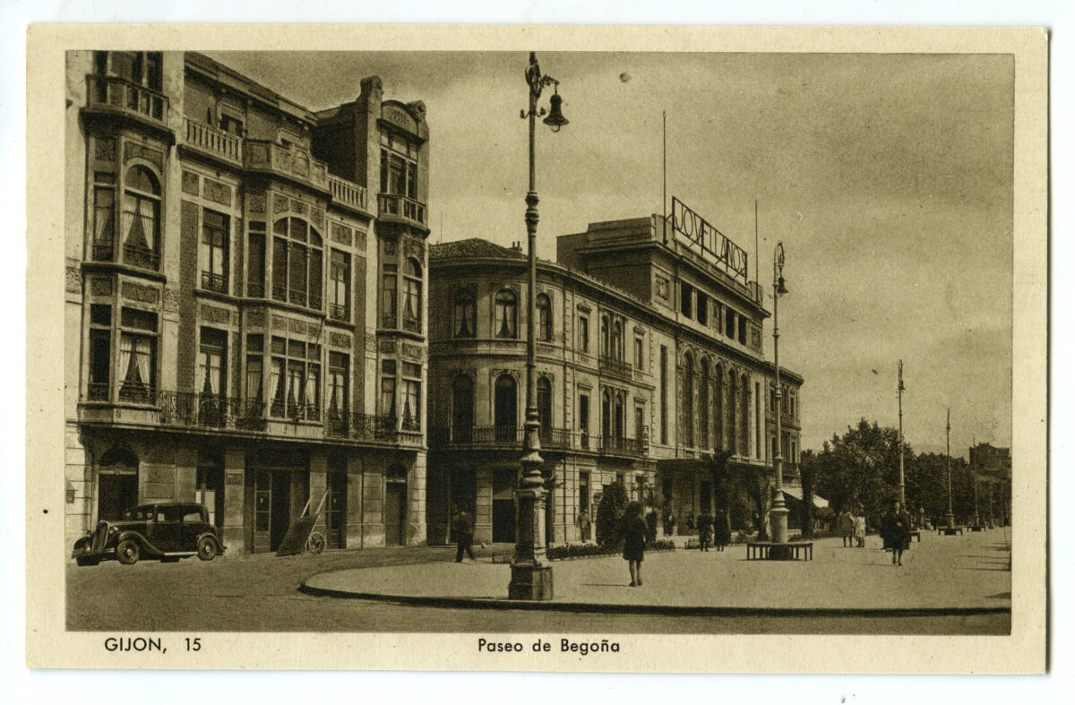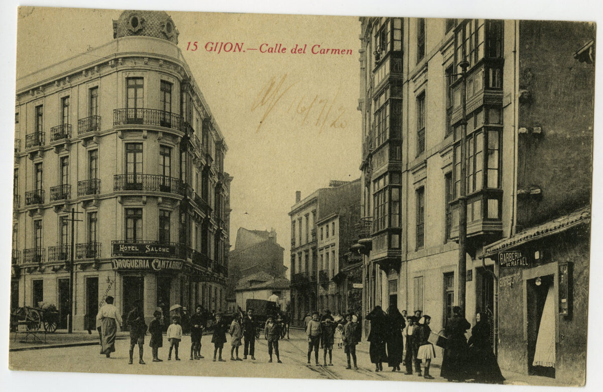 En los años que siguen, se procede a un remozamiento del caserío y al macizamiento de ese núcleo central que se había convertido en el corazón de la ciudad, y que coincidía con la zona delimitada por el «Plan de Mejoras» propuesto por Jove llanos. En él se asienta la pujante burguesía y se radican los establecimientos que responden a las demandas crecientes del sector terciario. Bancos, hoteles, comercios, teatros, mercados, edificios de viviendas, etc., de nueva construcción, suplantan a viejas construcciones o llenan solares vacíos, dando nuevo aire de ciudad burguesa a un peque ño número de calles -Corrida, Moros, San Bernardo, Jovellanos, etc.-, que serán el tema recurrente de la mayoría de las postales que por entonces se editan.