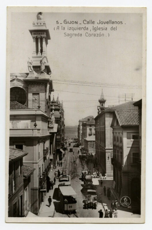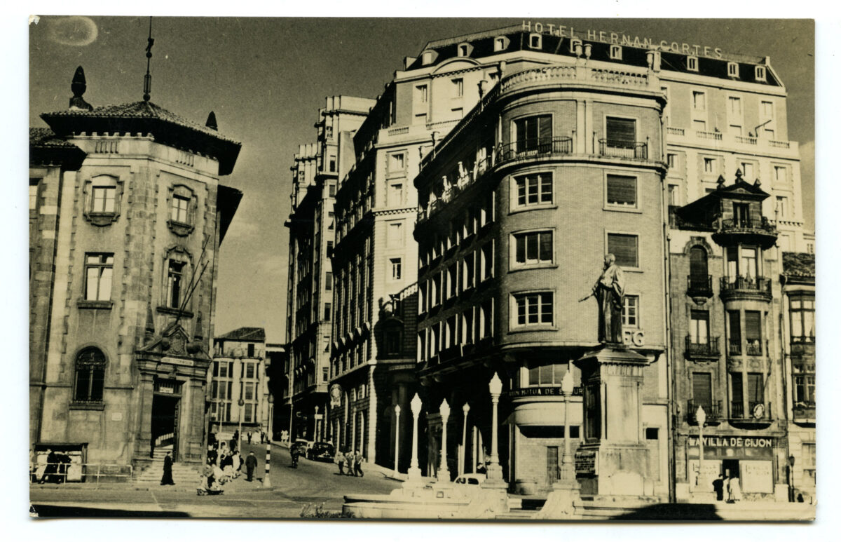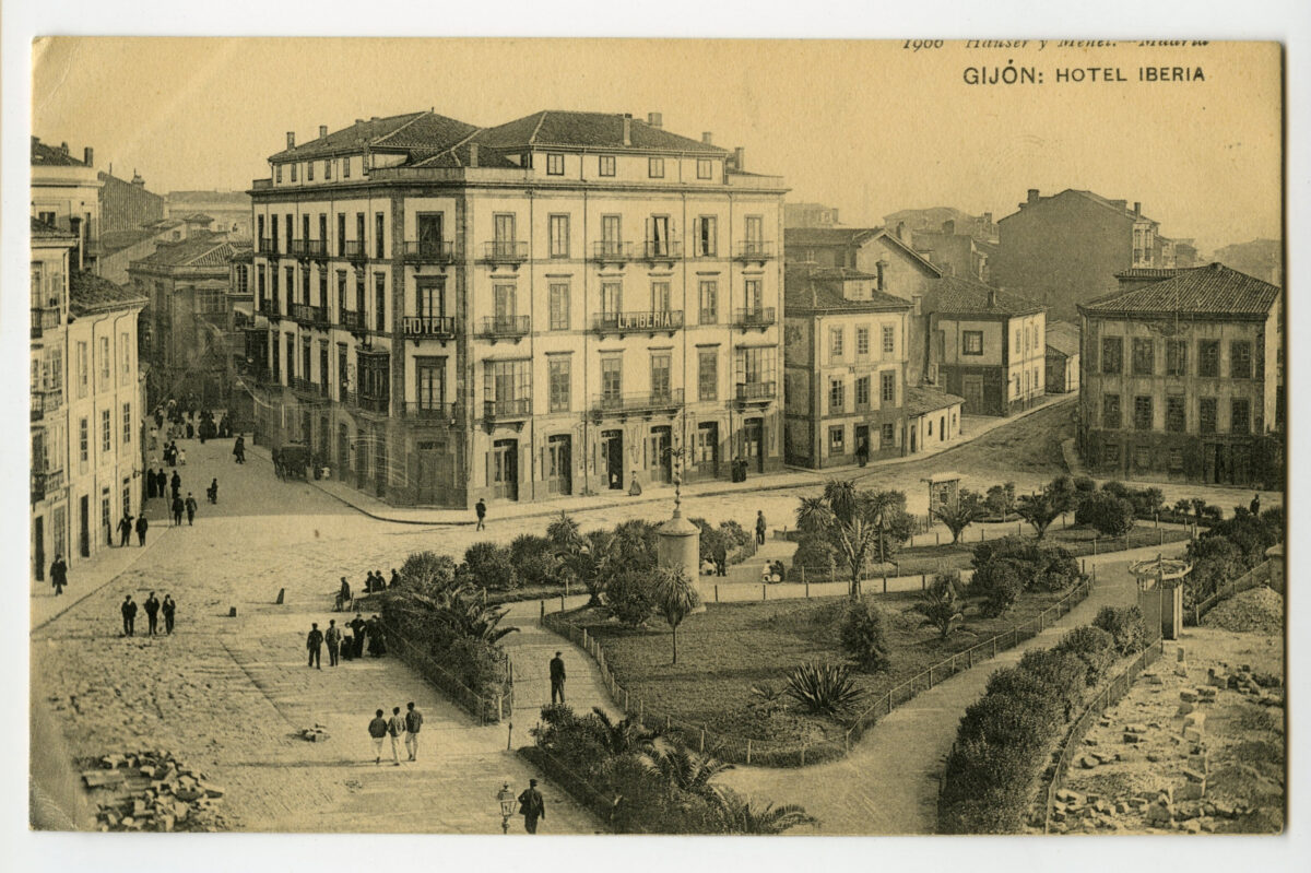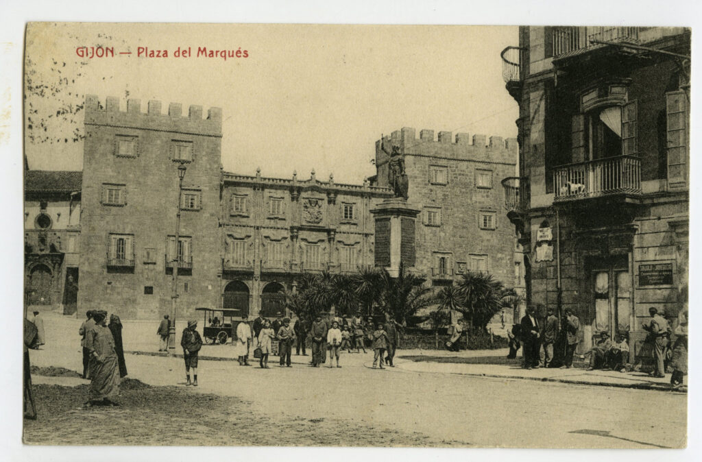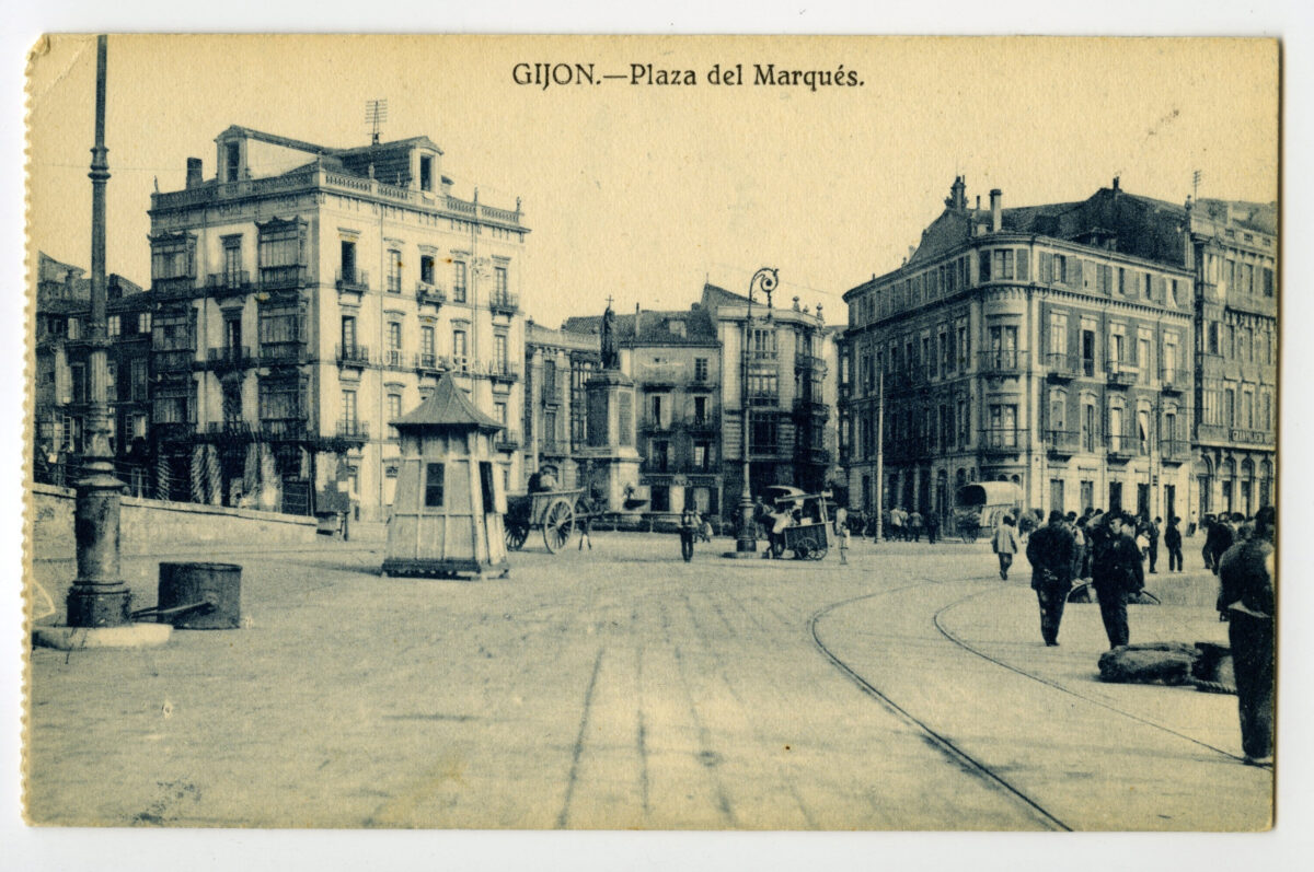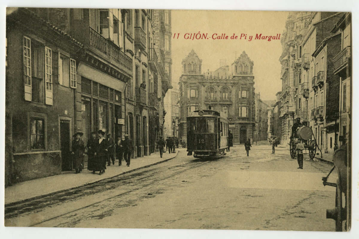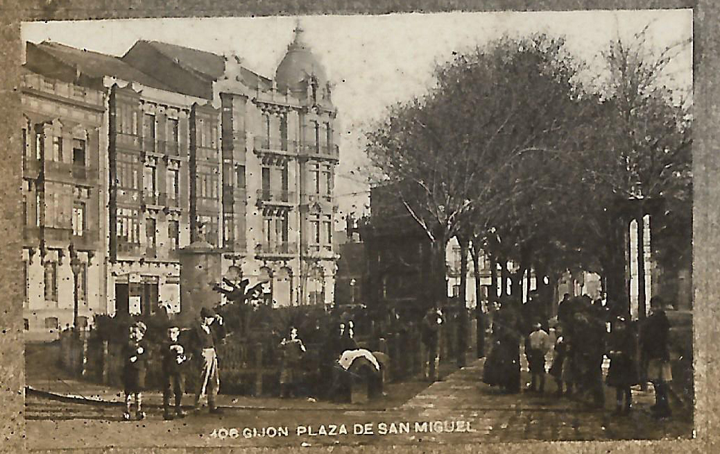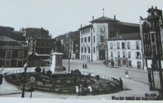 En los años que siguen, se procede a un remozamiento del caserío y al macizamiento de ese núcleo central que se había convertido en el corazón de la ciudad, y que coincidía con la zona delimitada por el «Plan de Mejoras» propuesto por Jove llanos. En él se asienta la pujante burguesía y se radican los establecimientos que responden a las demandas crecientes del sector terciario. Bancos, hoteles, comercios, teatros, mercados, edificios de viviendas, etc., de nueva construcción, suplantan a viejas construcciones o llenan solares vacíos, dando nuevo aire de ciudad burguesa a un peque ño número de calles -Corrida, Moros, San Bernardo, Jovellanos, etc.-, que serán el tema recurrente de la mayoría de las postales que por entonces se editan.