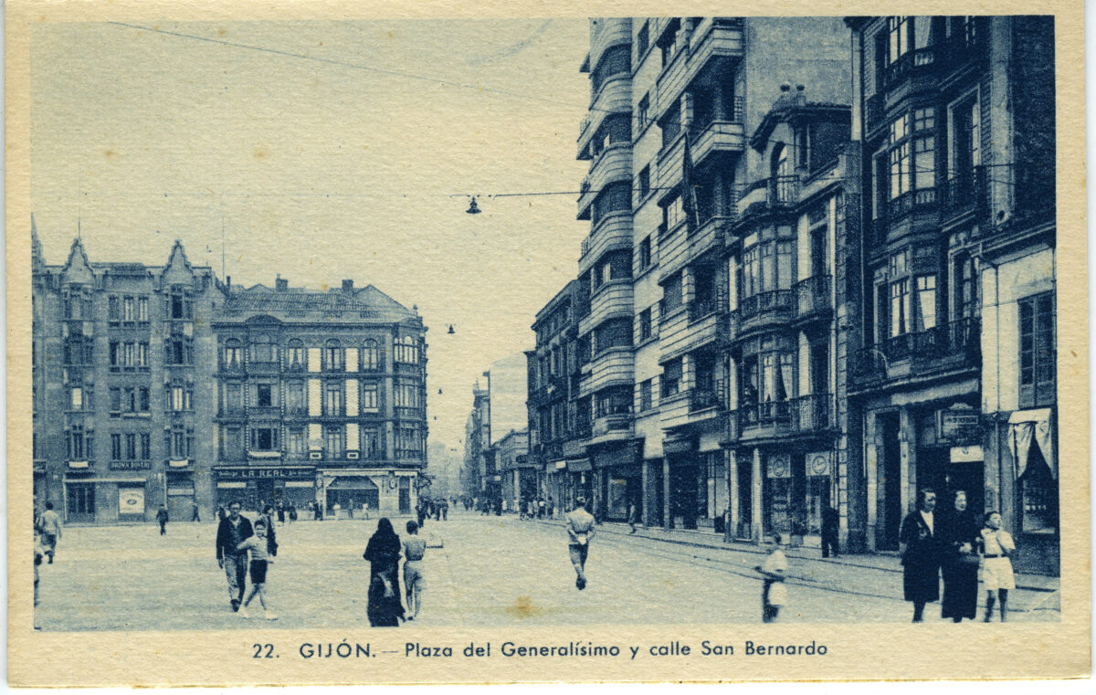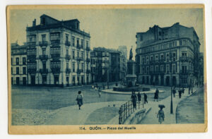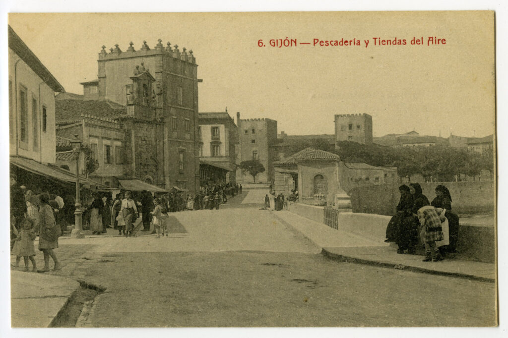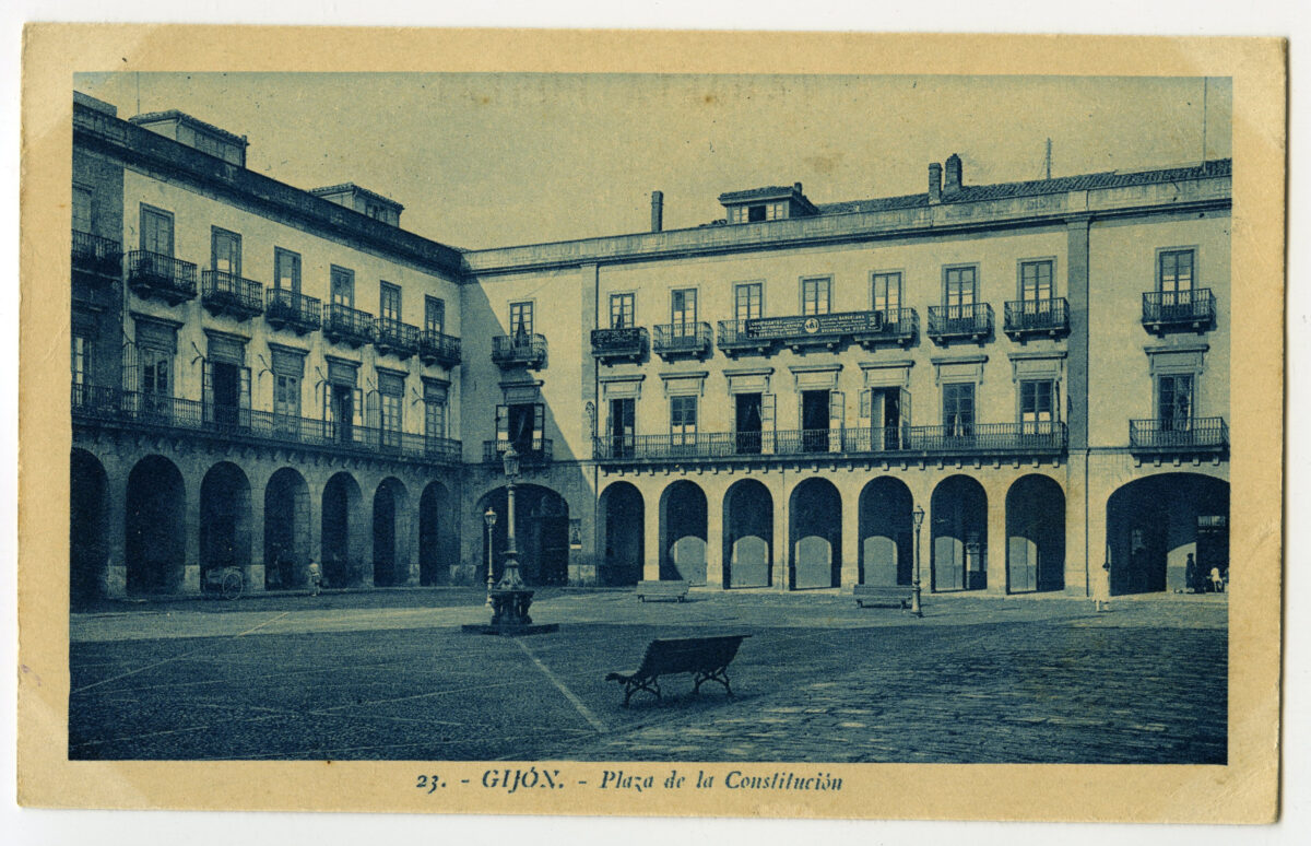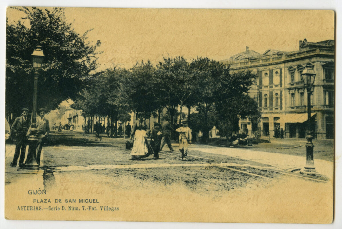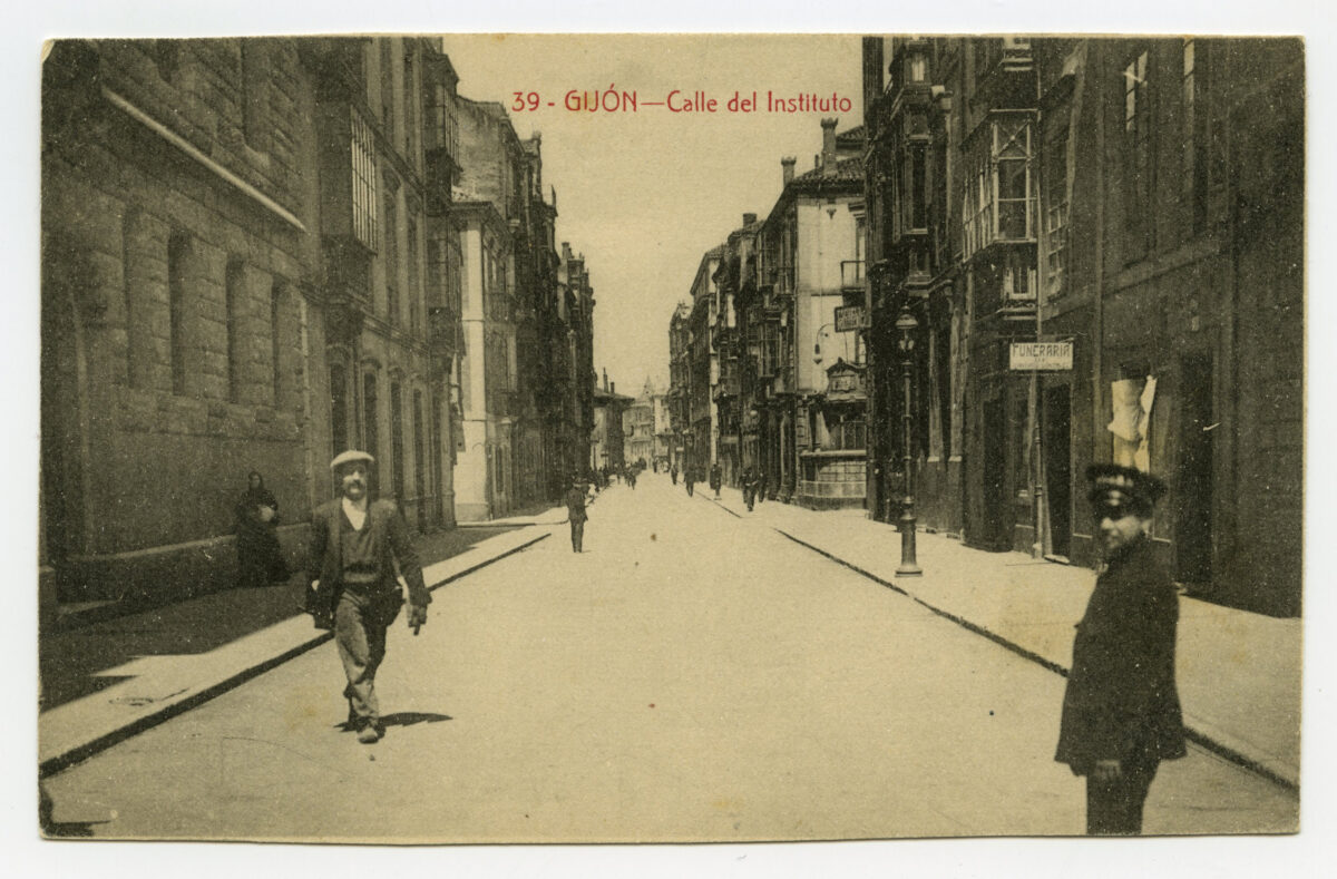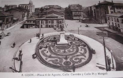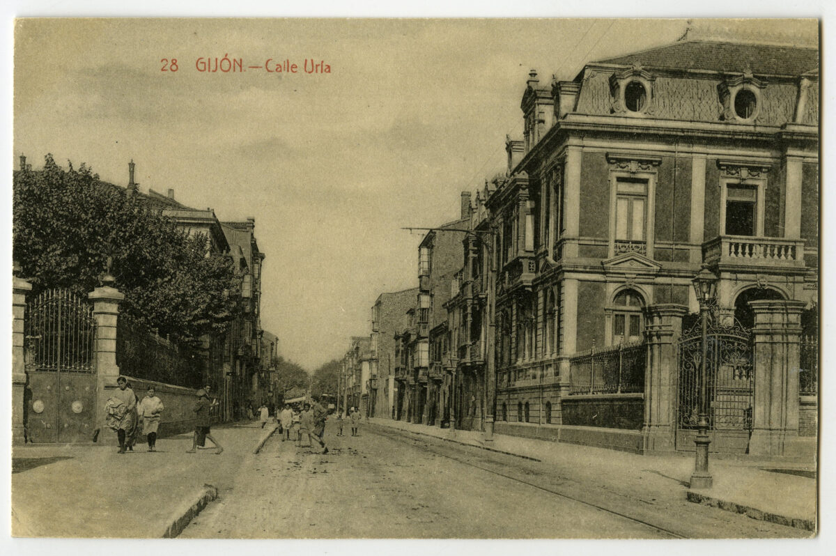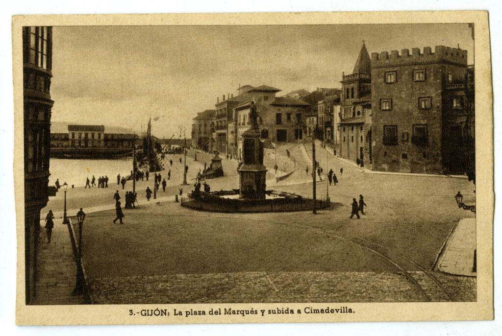 En los años que siguen, se procede a un remozamiento del caserío y al macizamiento de ese núcleo central que se había convertido en el corazón de la ciudad, y que coincidía con la zona delimitada por el «Plan de Mejoras» propuesto por Jove llanos. En él se asienta la pujante burguesía y se radican los establecimientos que responden a las demandas crecientes del sector terciario. Bancos, hoteles, comercios, teatros, mercados, edificios de viviendas, etc., de nueva construcción, suplantan a viejas construcciones o llenan solares vacíos, dando nuevo aire de ciudad burguesa a un peque ño número de calles -Corrida, Moros, San Bernardo, Jovellanos, etc.-, que serán el tema recurrente de la mayoría de las postales que por entonces se editan.