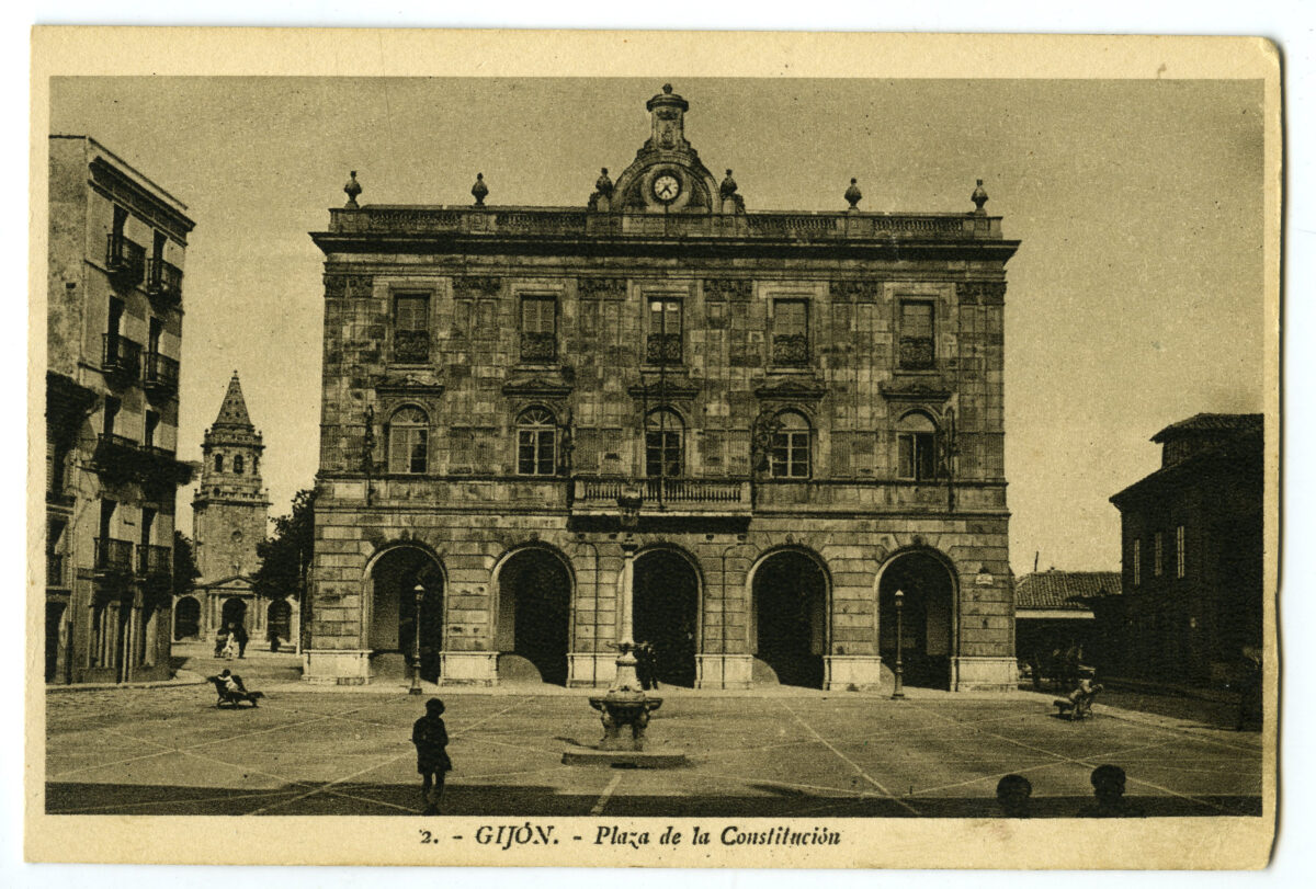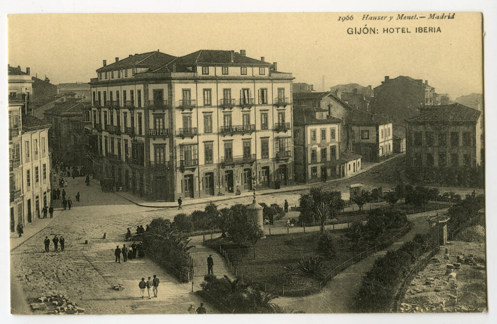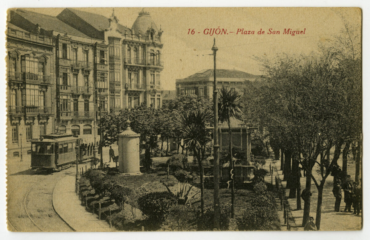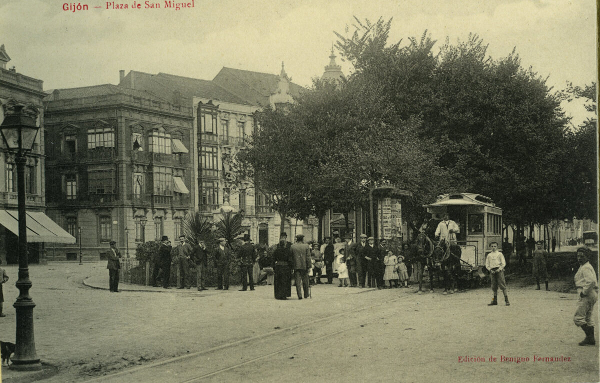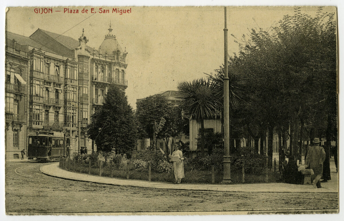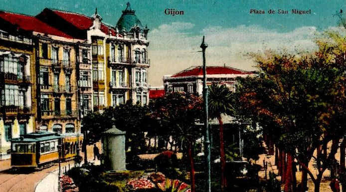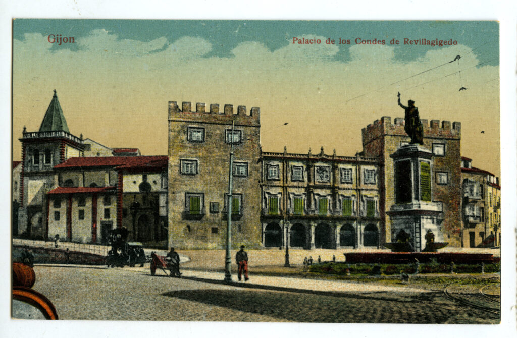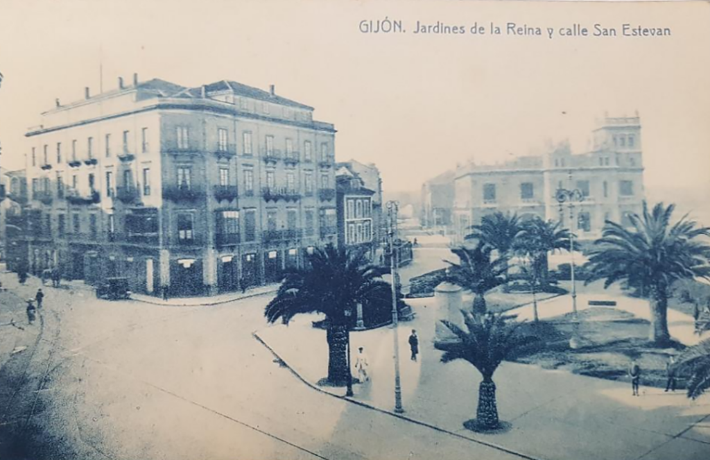 En los años que siguen, se procede a un remozamiento del caserío y al macizamiento de ese núcleo central que se había convertido en el corazón de la ciudad, y que coincidía con la zona delimitada por el «Plan de Mejoras» propuesto por Jove llanos. En él se asienta la pujante burguesía y se radican los establecimientos que responden a las demandas crecientes del sector terciario. Bancos, hoteles, comercios, teatros, mercados, edificios de viviendas, etc., de nueva construcción, suplantan a viejas construcciones o llenan solares vacíos, dando nuevo aire de ciudad burguesa a un peque ño número de calles -Corrida, Moros, San Bernardo, Jovellanos, etc.-, que serán el tema recurrente de la mayoría de las postales que por entonces se editan.