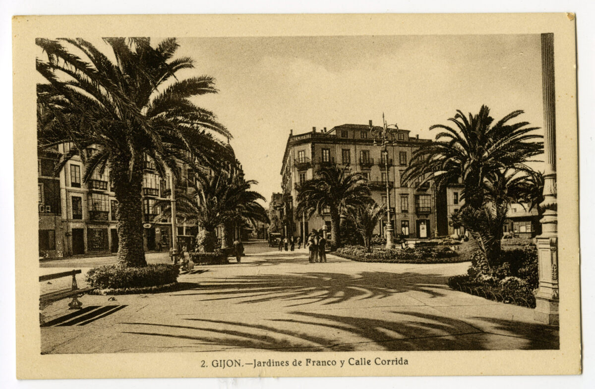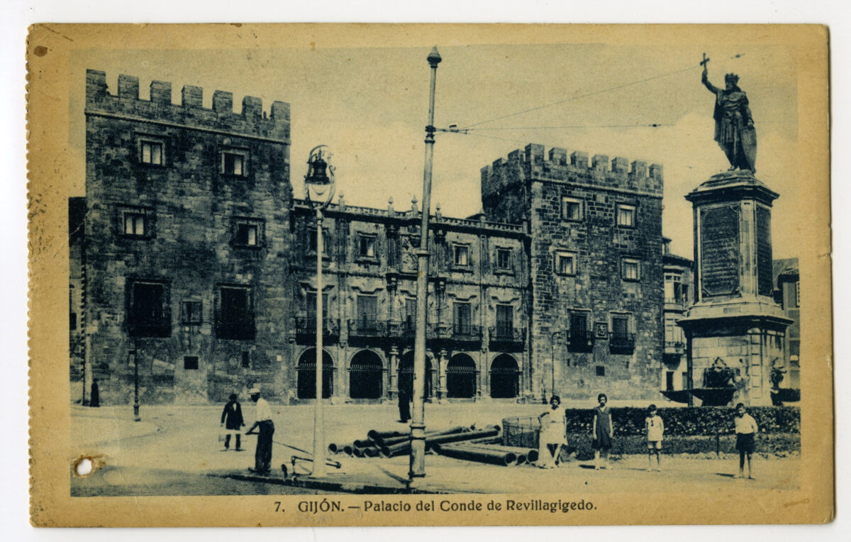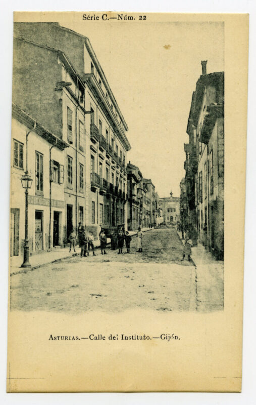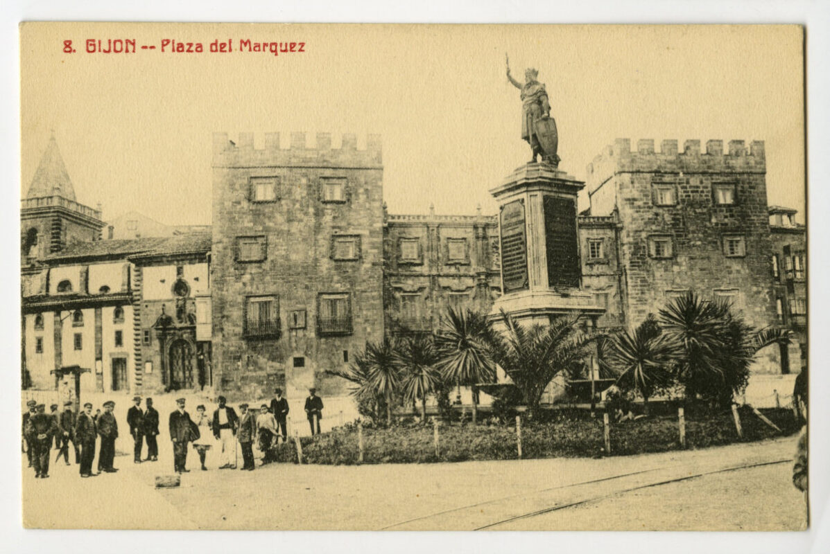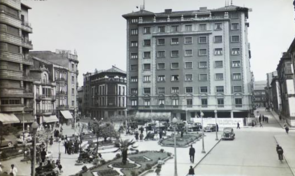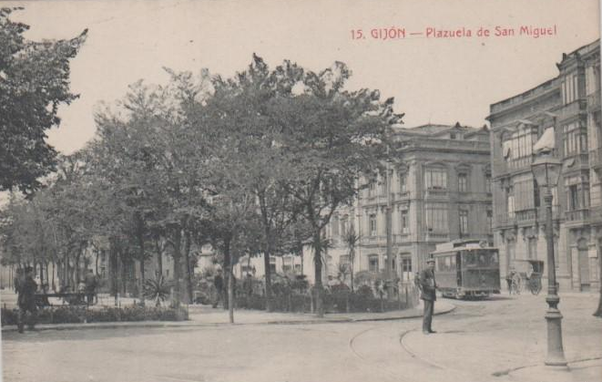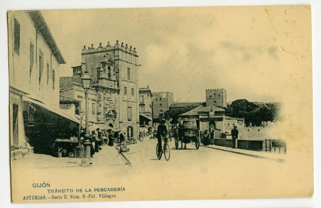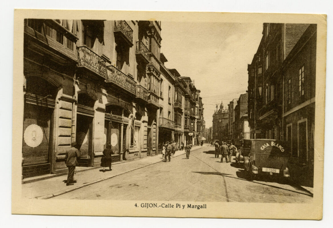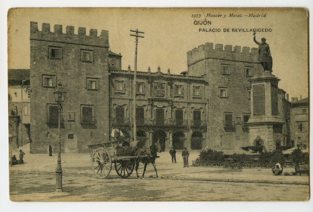 En los años que siguen, se procede a un remozamiento del caserío y al macizamiento de ese núcleo central que se había convertido en el corazón de la ciudad, y que coincidía con la zona delimitada por el «Plan de Mejoras» propuesto por Jove llanos. En él se asienta la pujante burguesía y se radican los establecimientos que responden a las demandas crecientes del sector terciario. Bancos, hoteles, comercios, teatros, mercados, edificios de viviendas, etc., de nueva construcción, suplantan a viejas construcciones o llenan solares vacíos, dando nuevo aire de ciudad burguesa a un peque ño número de calles -Corrida, Moros, San Bernardo, Jovellanos, etc.-, que serán el tema recurrente de la mayoría de las postales que por entonces se editan.