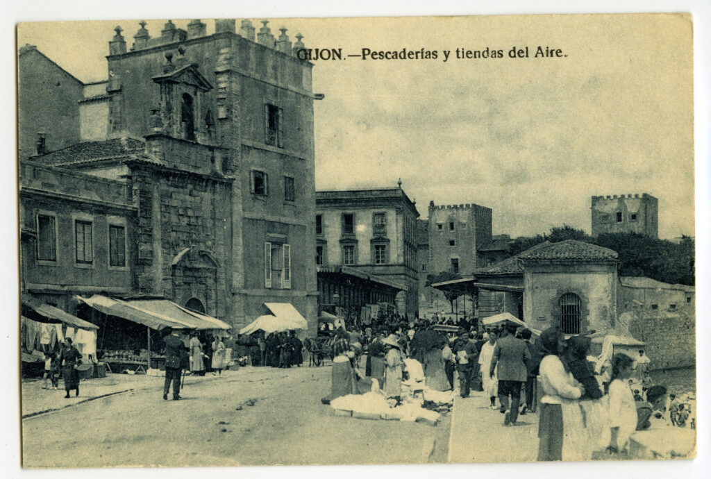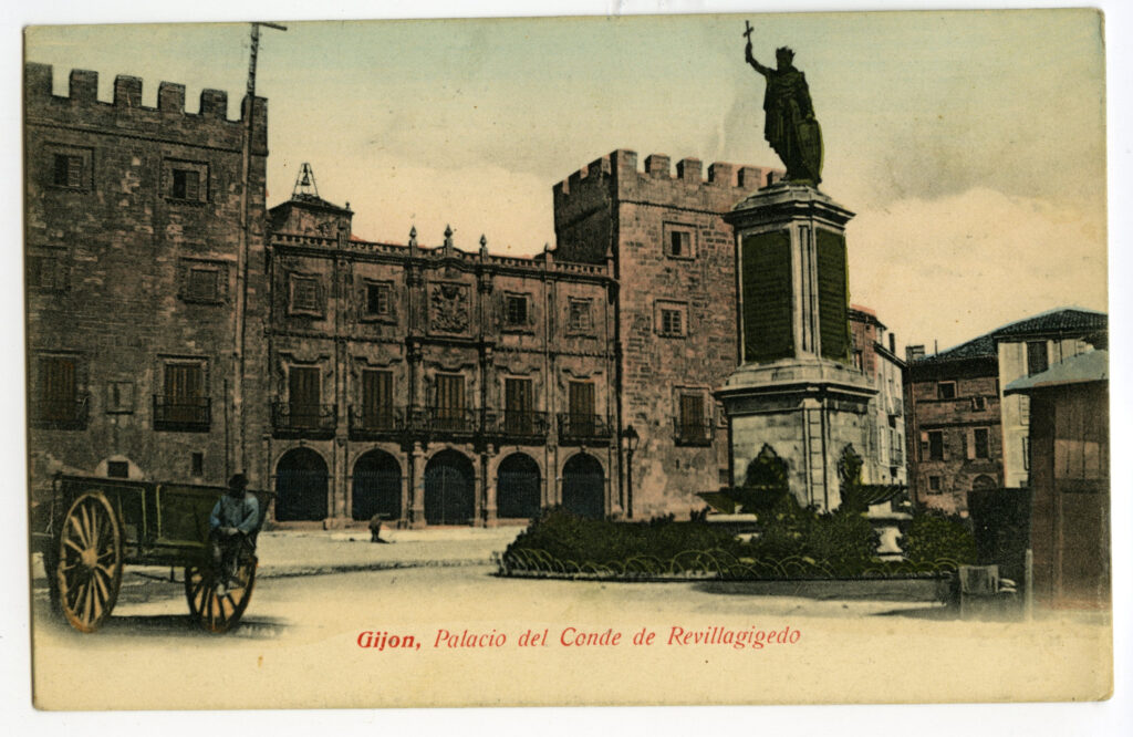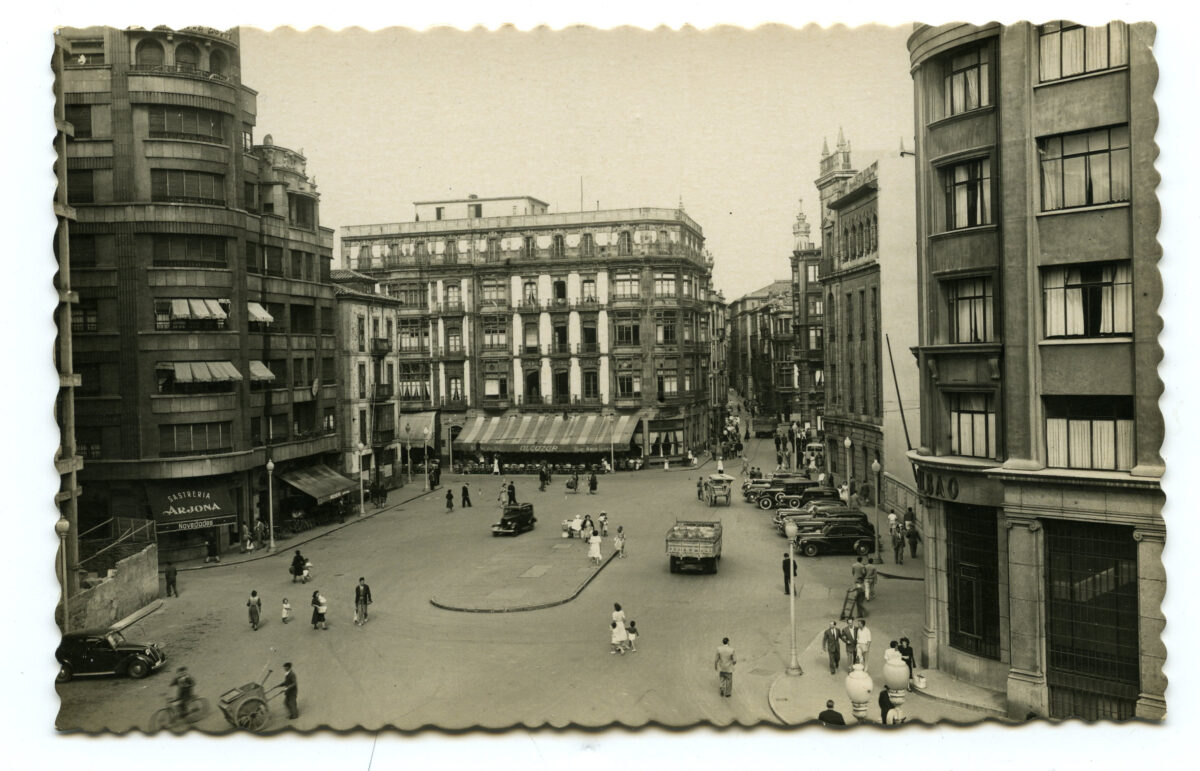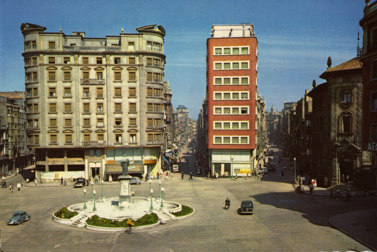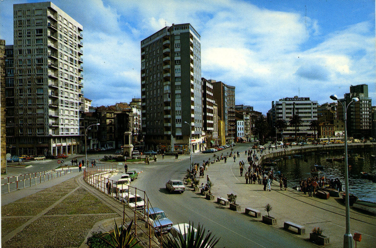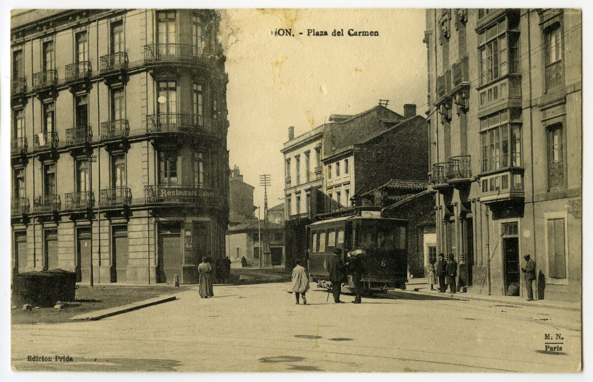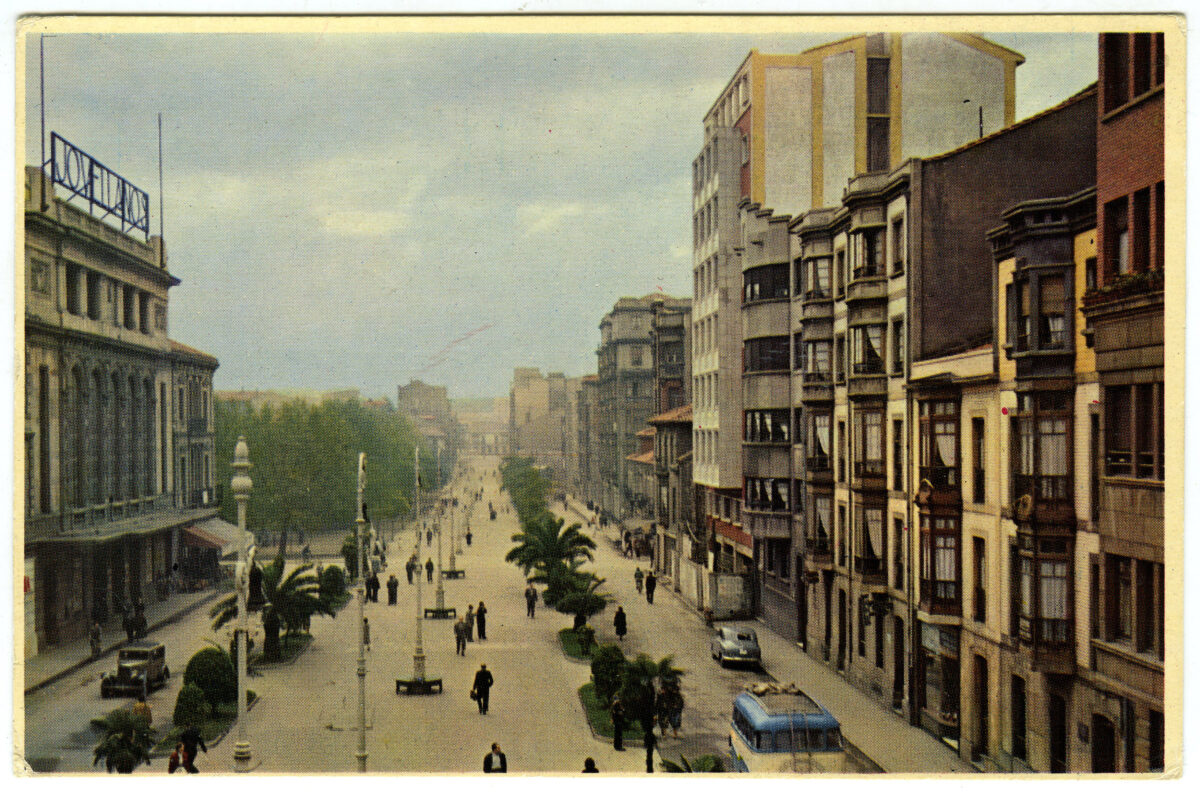 En los años que siguen, se procede a un remozamiento del caserío y al macizamiento de ese núcleo central que se había convertido en el corazón de la ciudad, y que coincidía con la zona delimitada por el «Plan de Mejoras» propuesto por Jove llanos. En él se asienta la pujante burguesía y se radican los establecimientos que responden a las demandas crecientes del sector terciario. Bancos, hoteles, comercios, teatros, mercados, edificios de viviendas, etc., de nueva construcción, suplantan a viejas construcciones o llenan solares vacíos, dando nuevo aire de ciudad burguesa a un peque ño número de calles -Corrida, Moros, San Bernardo, Jovellanos, etc.-, que serán el tema recurrente de la mayoría de las postales que por entonces se editan.