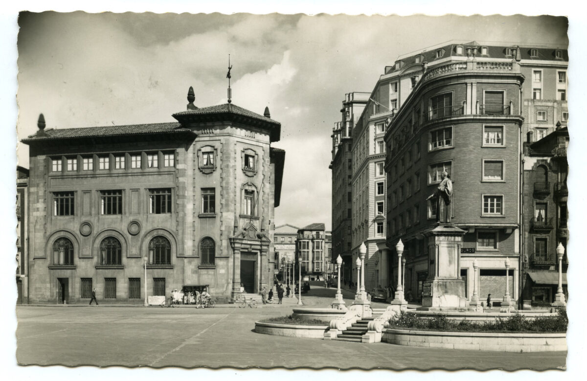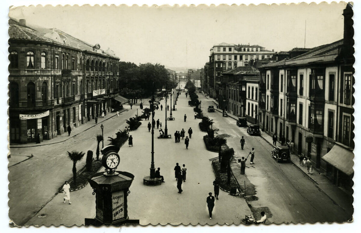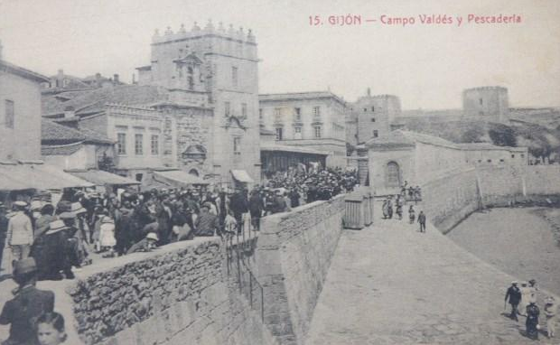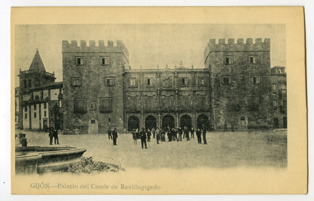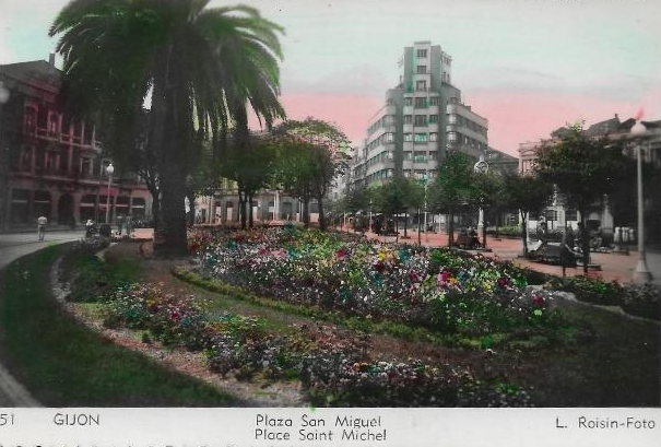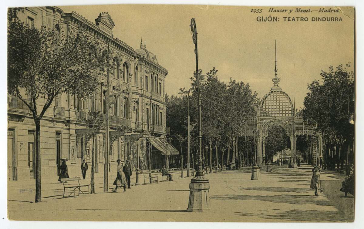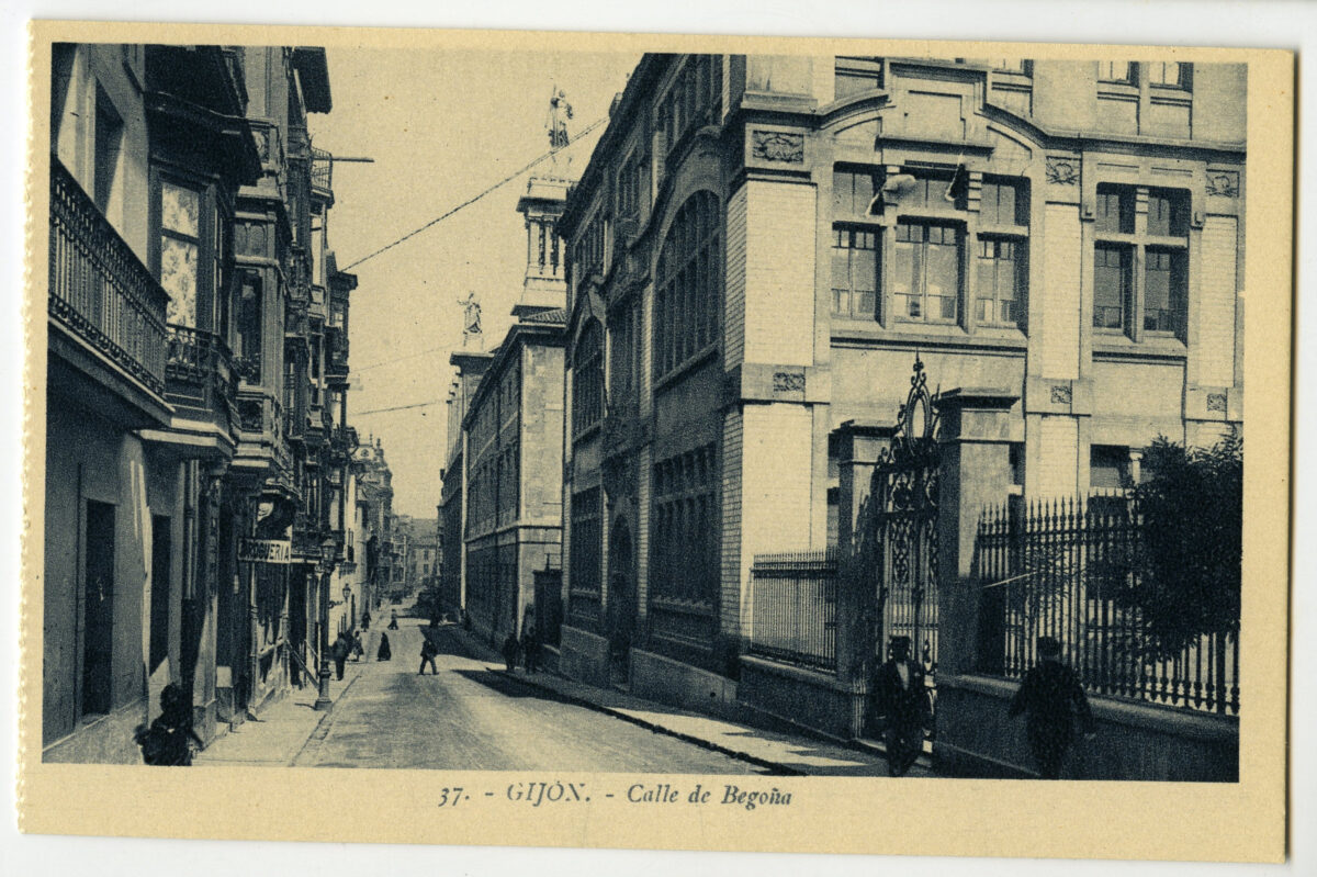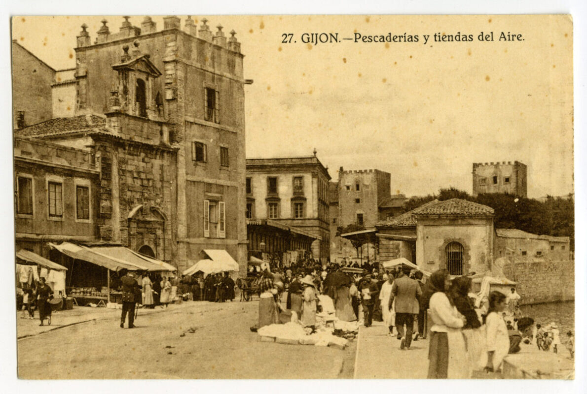 En los años que siguen, se procede a un remozamiento del caserío y al macizamiento de ese núcleo central que se había convertido en el corazón de la ciudad, y que coincidía con la zona delimitada por el «Plan de Mejoras» propuesto por Jove llanos. En él se asienta la pujante burguesía y se radican los establecimientos que responden a las demandas crecientes del sector terciario. Bancos, hoteles, comercios, teatros, mercados, edificios de viviendas, etc., de nueva construcción, suplantan a viejas construcciones o llenan solares vacíos, dando nuevo aire de ciudad burguesa a un peque ño número de calles -Corrida, Moros, San Bernardo, Jovellanos, etc.-, que serán el tema recurrente de la mayoría de las postales que por entonces se editan.