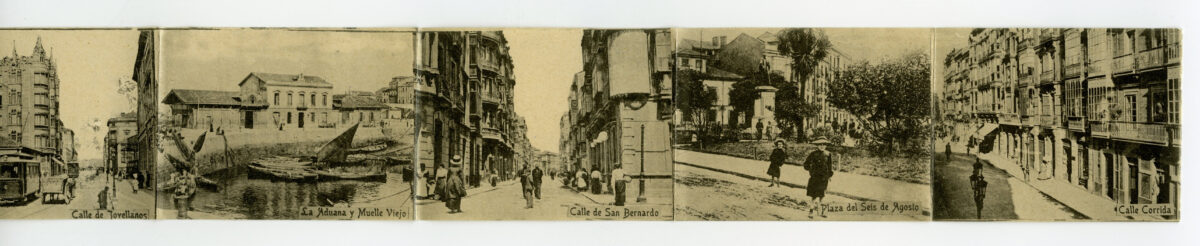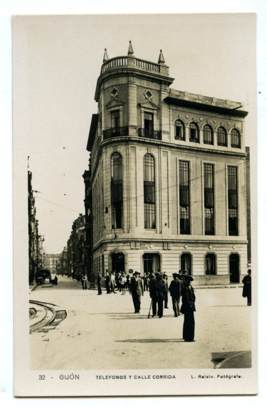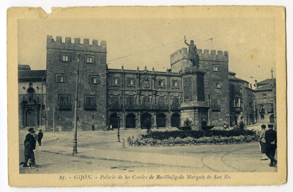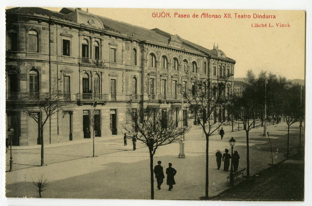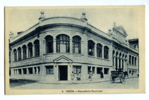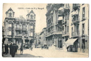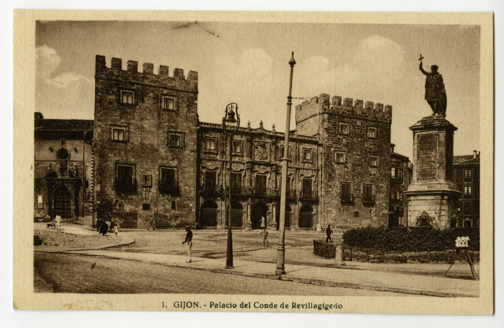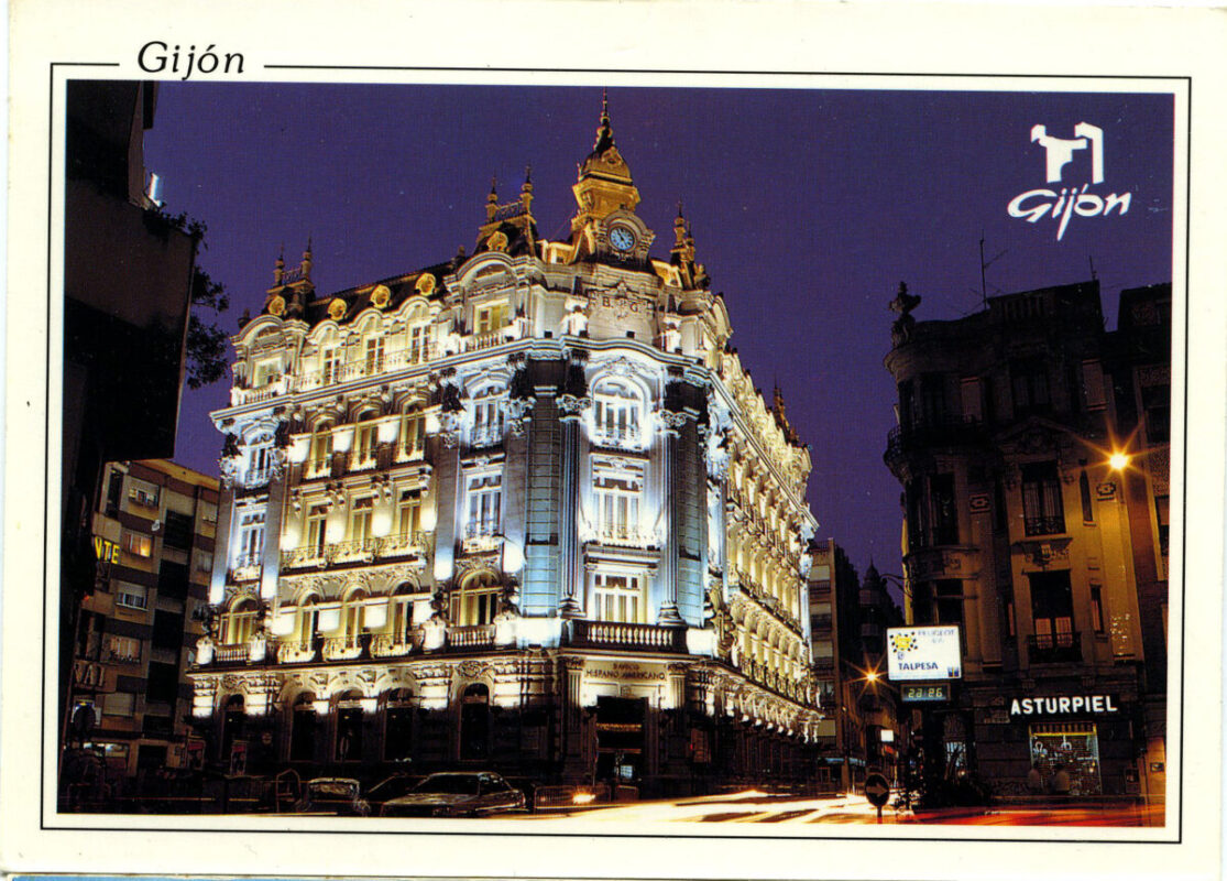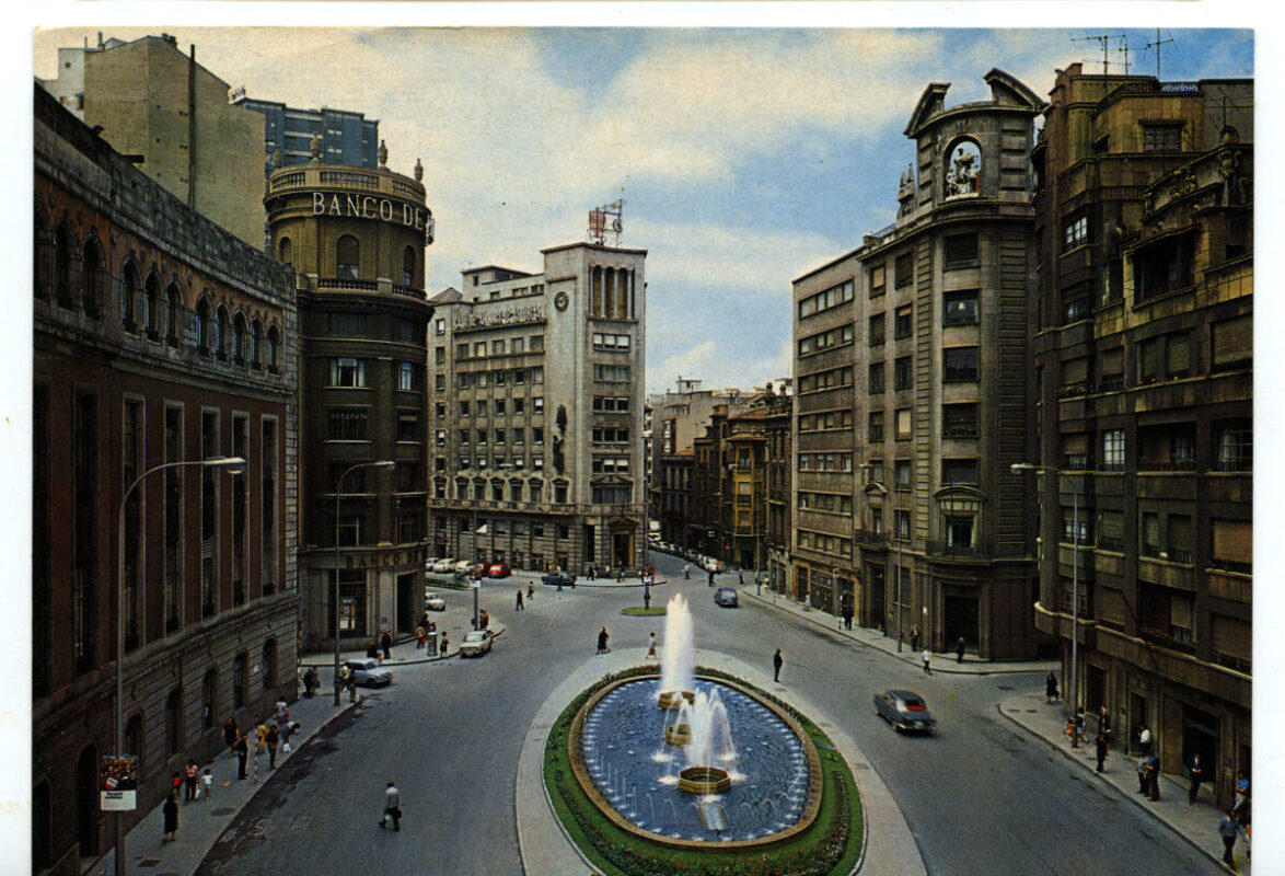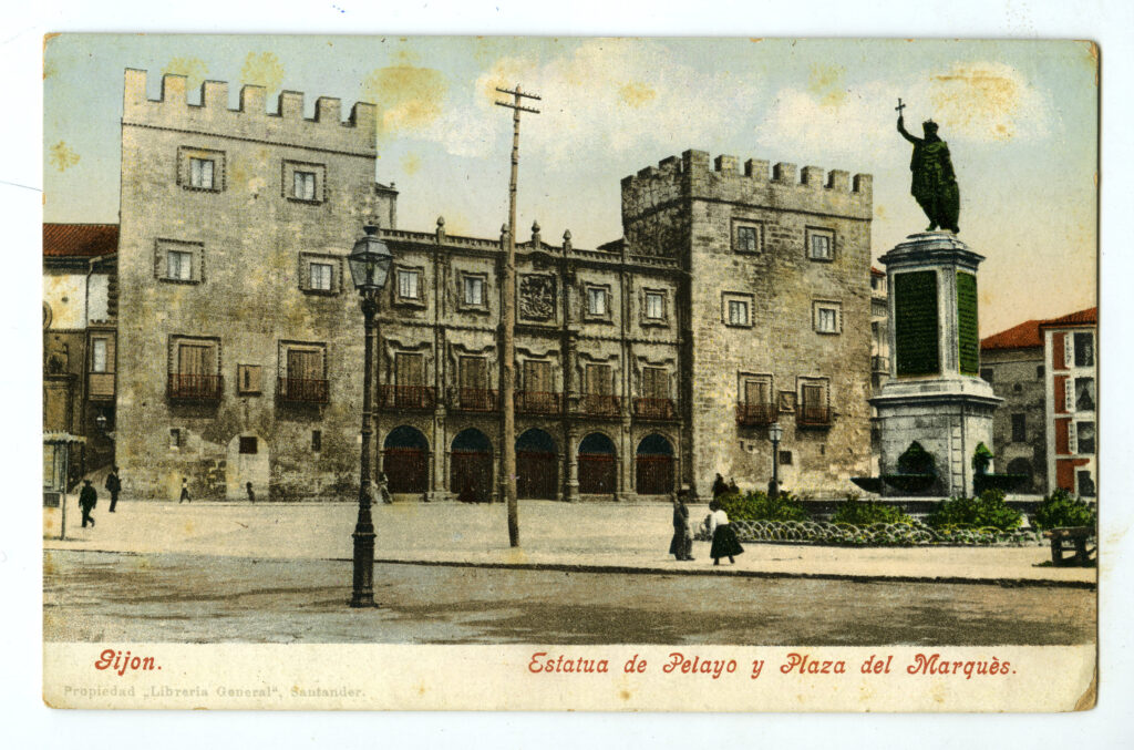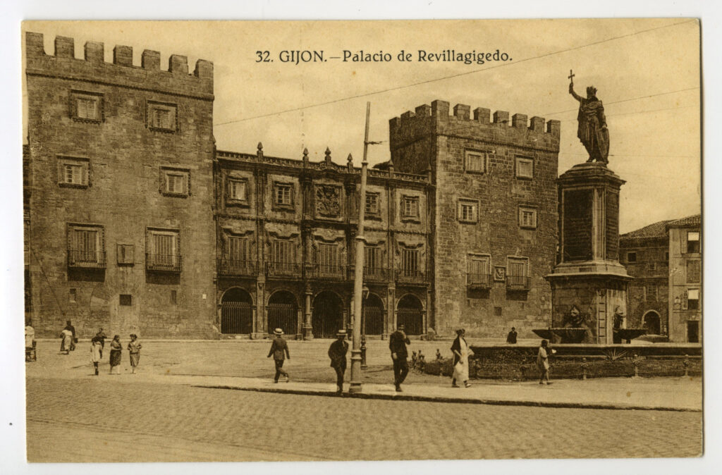 En los años que siguen, se procede a un remozamiento del caserío y al macizamiento de ese núcleo central que se había convertido en el corazón de la ciudad, y que coincidía con la zona delimitada por el «Plan de Mejoras» propuesto por Jove llanos. En él se asienta la pujante burguesía y se radican los establecimientos que responden a las demandas crecientes del sector terciario. Bancos, hoteles, comercios, teatros, mercados, edificios de viviendas, etc., de nueva construcción, suplantan a viejas construcciones o llenan solares vacíos, dando nuevo aire de ciudad burguesa a un peque ño número de calles -Corrida, Moros, San Bernardo, Jovellanos, etc.-, que serán el tema recurrente de la mayoría de las postales que por entonces se editan.