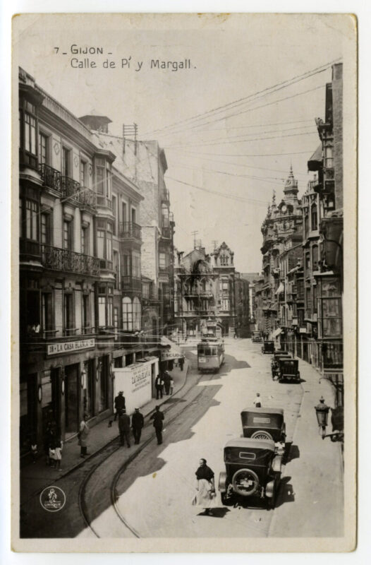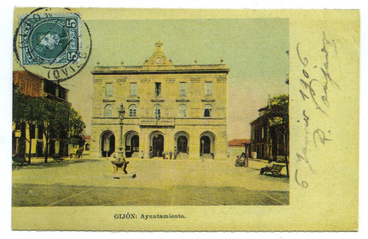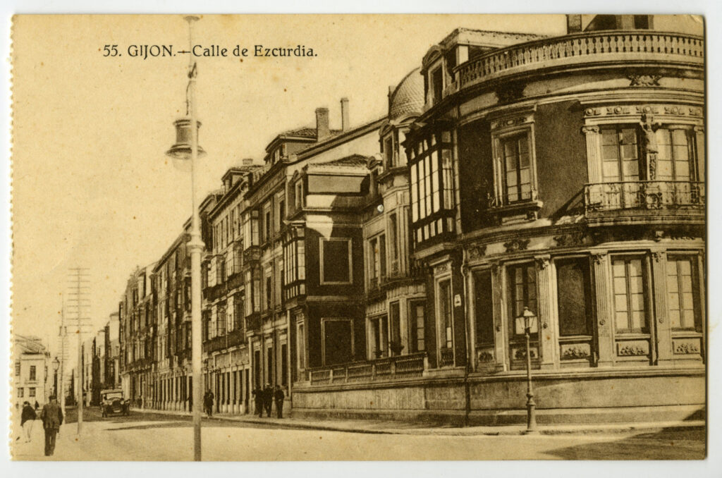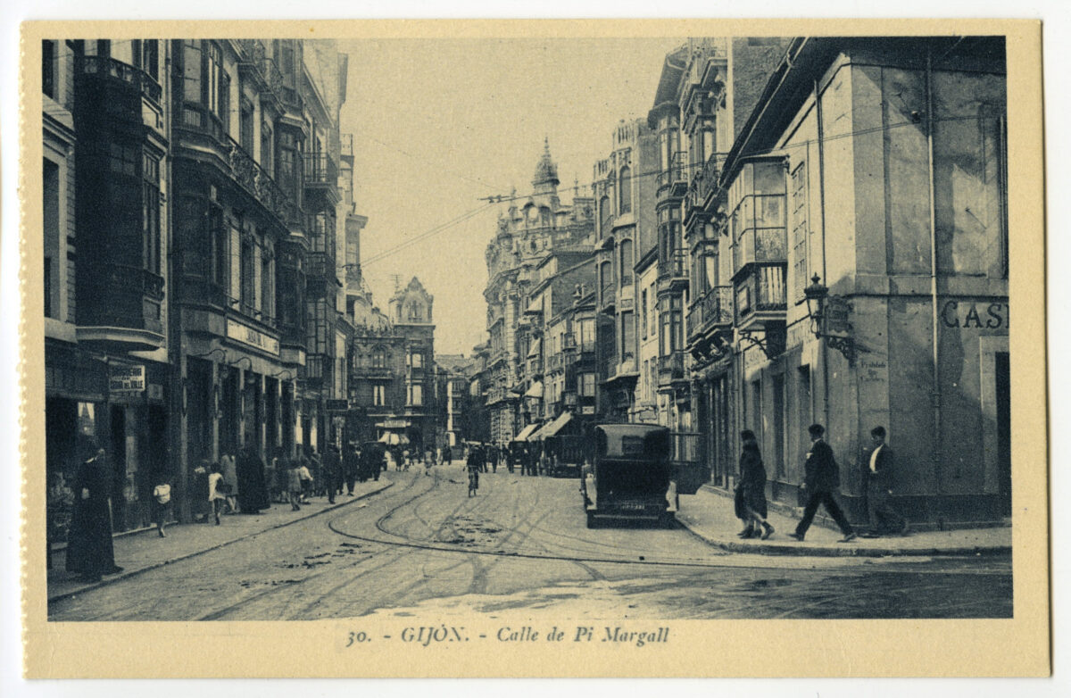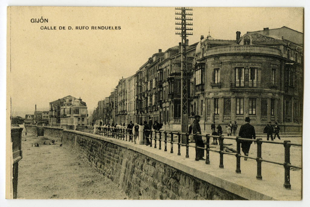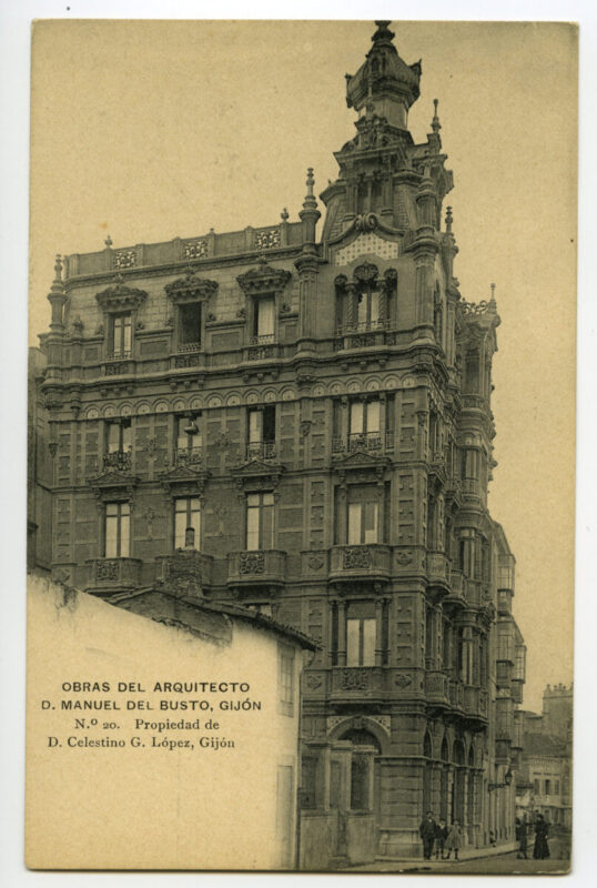La tarjeta postal ofrece, por lo general, el lado bello o más halagüeño de la realidad urbana y también de la rural y del paisaje. Junto a las áreas o calles de urbanización reciente, son temas de interés para sus editores los nuevos edificios levantados por la burguesía -un ejemplo de ello es la que reproduce el edificio de la calle Cabrales, n º 18, obra del arquitecto Manuel del Busto para Celestino García López, construcción de 1903, que debió formar parte de una colección de postales con las obras del citado arquitecto, el muelle, el nuevo puerto del Musél, la playa y sus balnearios, las estatuas de Pelayo y Jovellanos en las plazas del Marqués y de 6 de Agosto, y toda imagen que dé idea de progreso y modernidad . Por el contrario, de la vieja ciudad sólo interesan los contados edificios de valor histórico (palacios de Valdés y Revillagigedo o la cárcel vieja), pero no las degradadas viviendas que conforman el casco del barrio de Cimadevilla; de igual forma, tampoco son reproducidos los barrios obreros ni otros espacios marginales.