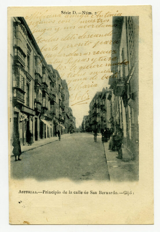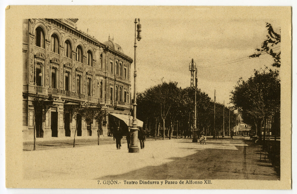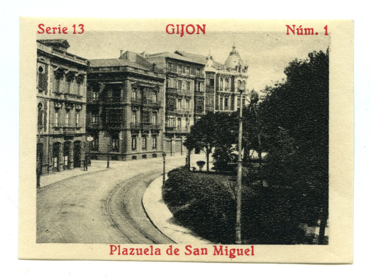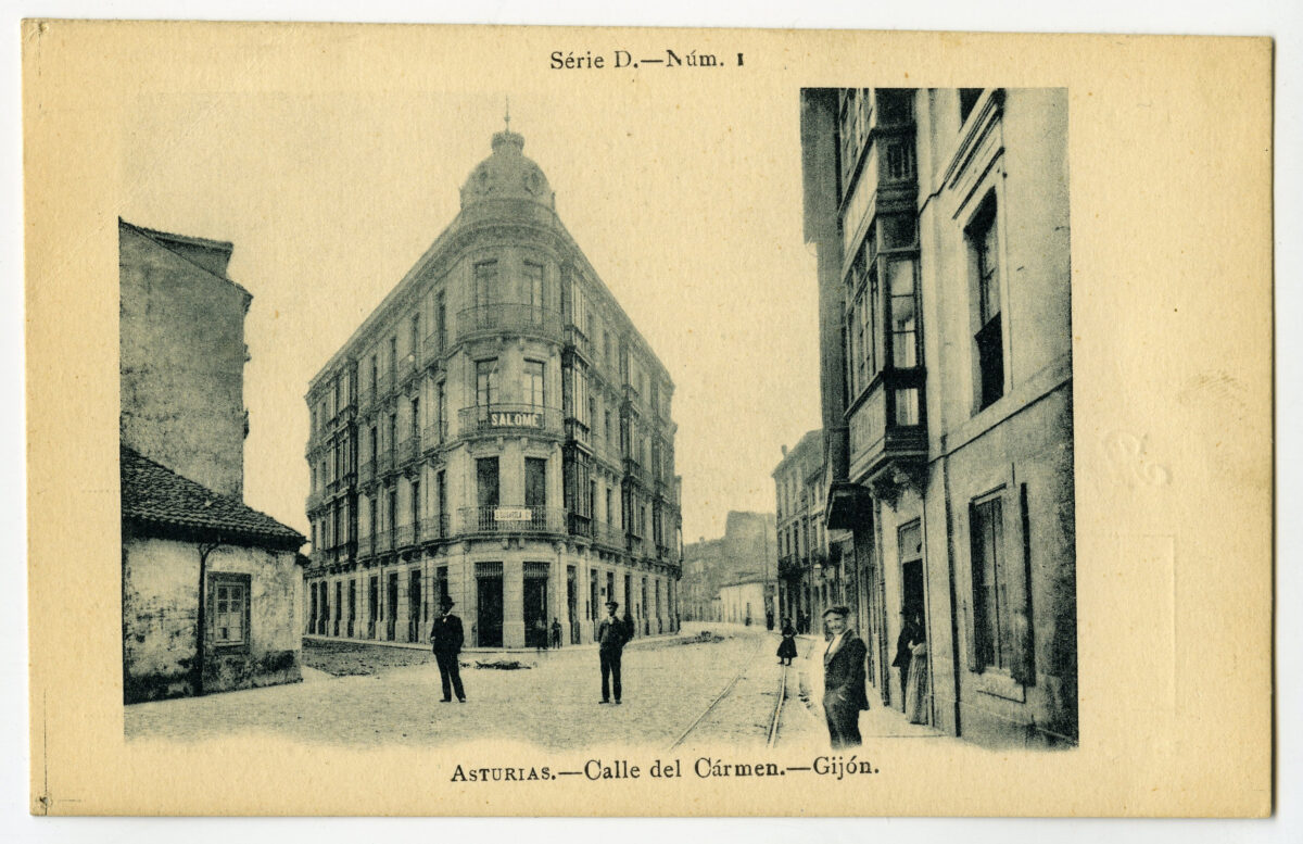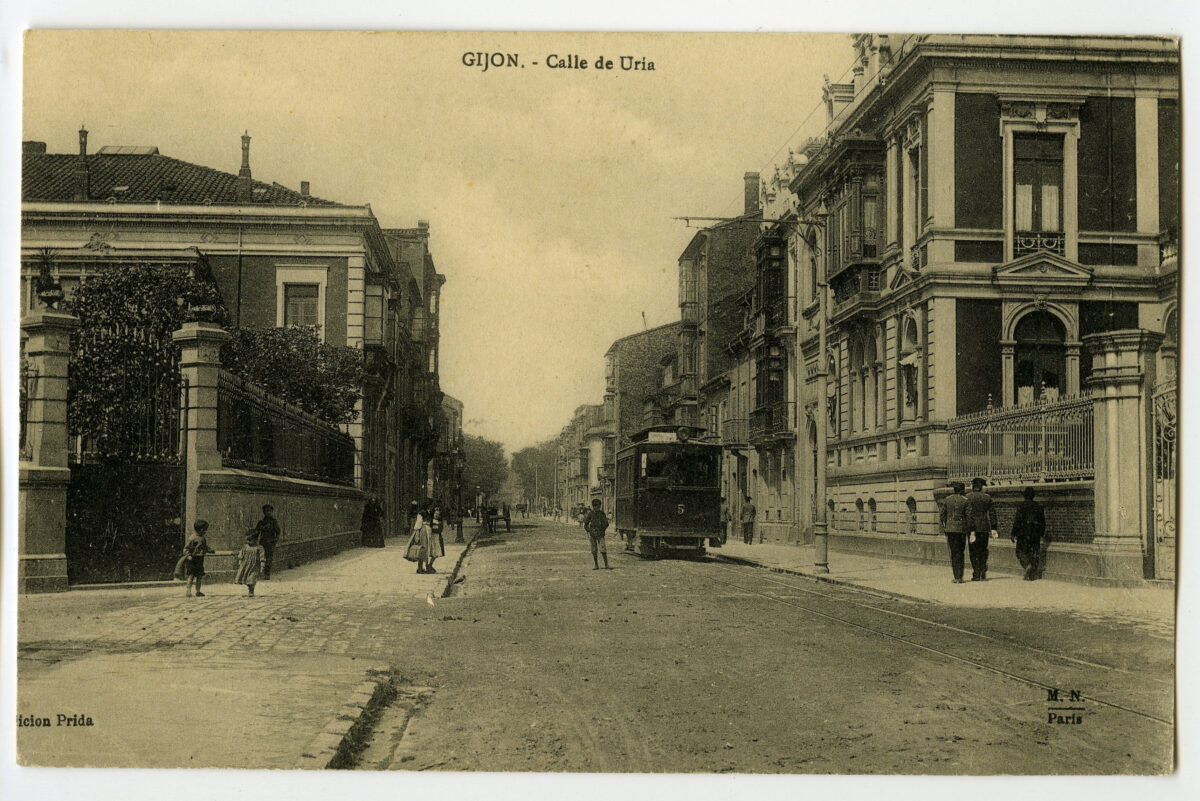 La tarjeta postal ofrece, por lo general, el lado bello o más halagüeño de la realidad urbana y también de la rural y del paisaje. Junto a las áreas o calles de urbanización reciente, son temas de interés para sus editores los nuevos edificios levantados por la burguesía -un ejemplo de ello es la que reproduce el edificio de la calle Cabrales, n º 18, obra del arquitecto Manuel del Busto para Celestino García López, construcción de 1903, que debió formar parte de una colección de postales con las obras del citado arquitecto, el muelle, el nuevo puerto del Musél, la playa y sus balnearios, las estatuas de Pelayo y Jovellanos en las plazas del Marqués y de 6 de Agosto, y toda imagen que dé idea de progreso y modernidad . Por el contrario, de la vieja ciudad sólo interesan los contados edificios de valor histórico (palacios de Valdés y Revillagigedo o la cárcel vieja), pero no las degradadas viviendas que conforman el casco del barrio de Cimadevilla; de igual forma, tampoco son reproducidos los barrios obreros ni otros espacios marginales.